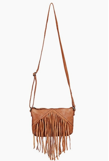 Super cute fringe cross-body bag with zipper top opening. Inside credit card pockets and media slip. Backside magnetic slip compartment.
