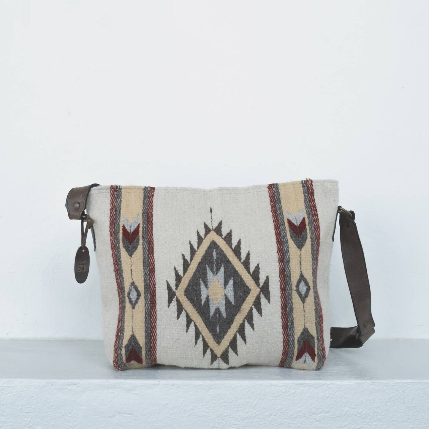 The Snowflake pattern features a Zapotec diamond and arrow design in cranberry red, soft gold, and gray on natural cream wool.