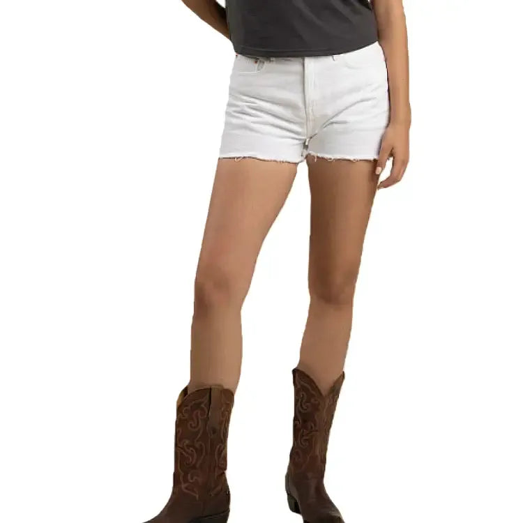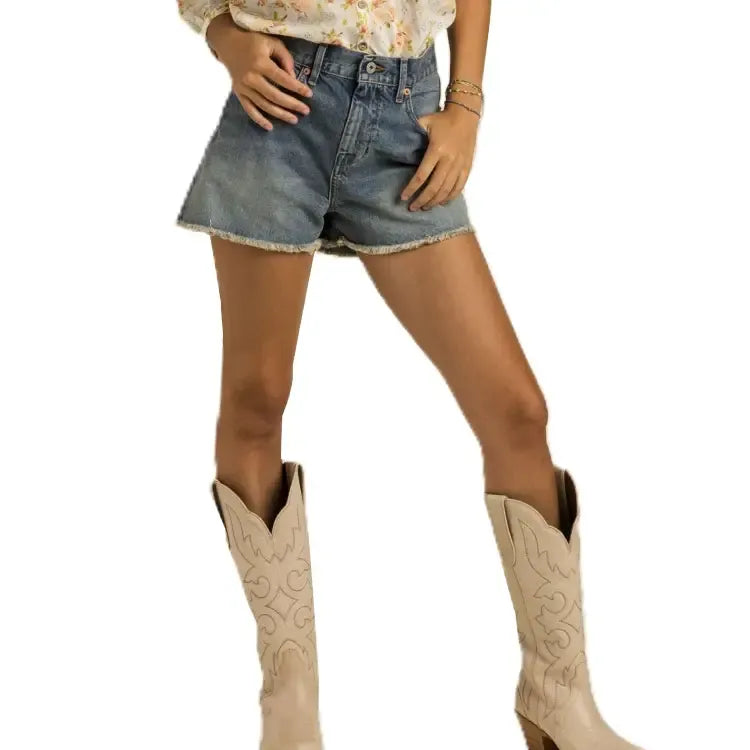 High waisted, easy fitting denim short, with a frayed hem and faded indigo wash. Classic Sendero denim packaging, including custom shanks and rivets, pocket bag print, main and size labels, and a printed paper back patch.