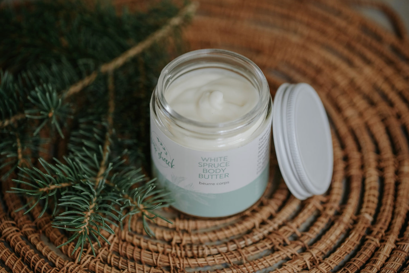 White Spruce Body Butter: Indulge your senses with White Spruce Body Butter a natural and calming herbal moisturizer that captures the tranquil ambiance of a forest. Infused with a soothing essential oil blend of lavender, cedarwood, spruce, and frankincense, the body butter is enhanced by cupuacu butter for a luxurious, non-greasy feel. With every application, inhale deeply to experience the calming, rejuvenating properties of the forest.