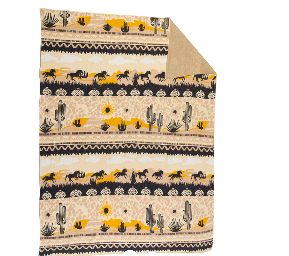 Transport yourself to the desert sunset with this enchanting throw blanket featuring wild horses and majestic saguaros. Soft desert hues of mauve and amber blend with tribal patterns to create the perfect Southwestern statement piece for your home sanctuary.