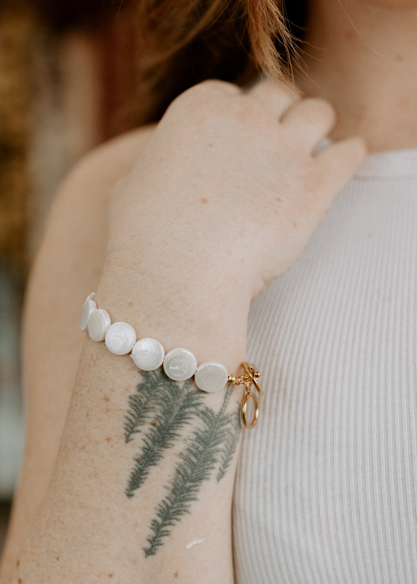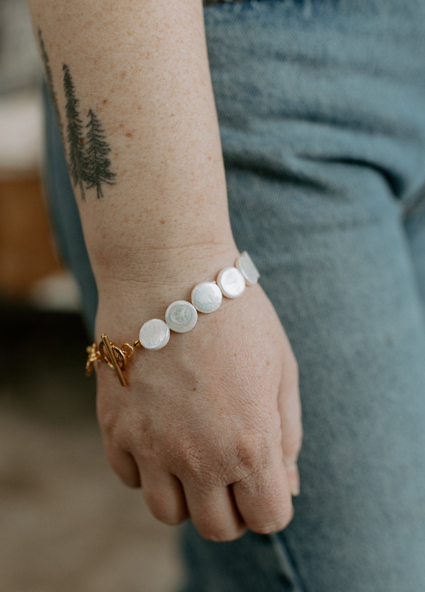 Regular price $39.95 CADThis dainty pearl bracelet is made with genuine coin-shaped shell pearl and is the perfect piece for layering on your wrist.  Although your bracelet will resemble the photo, each piece is created by hand, so no two are identical.