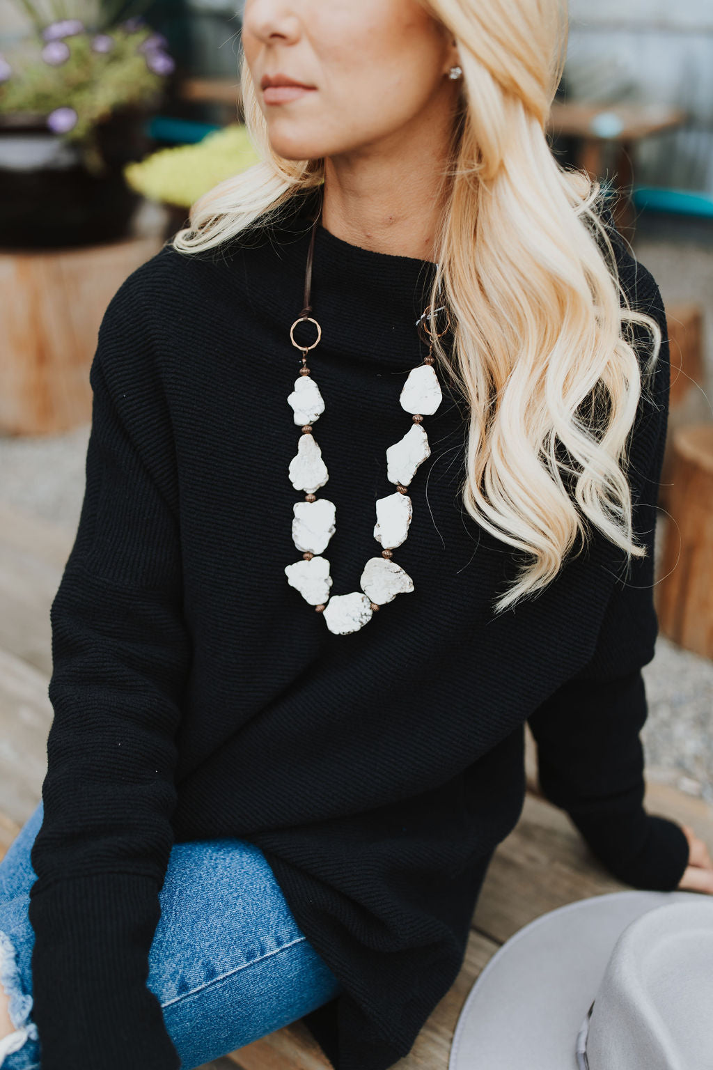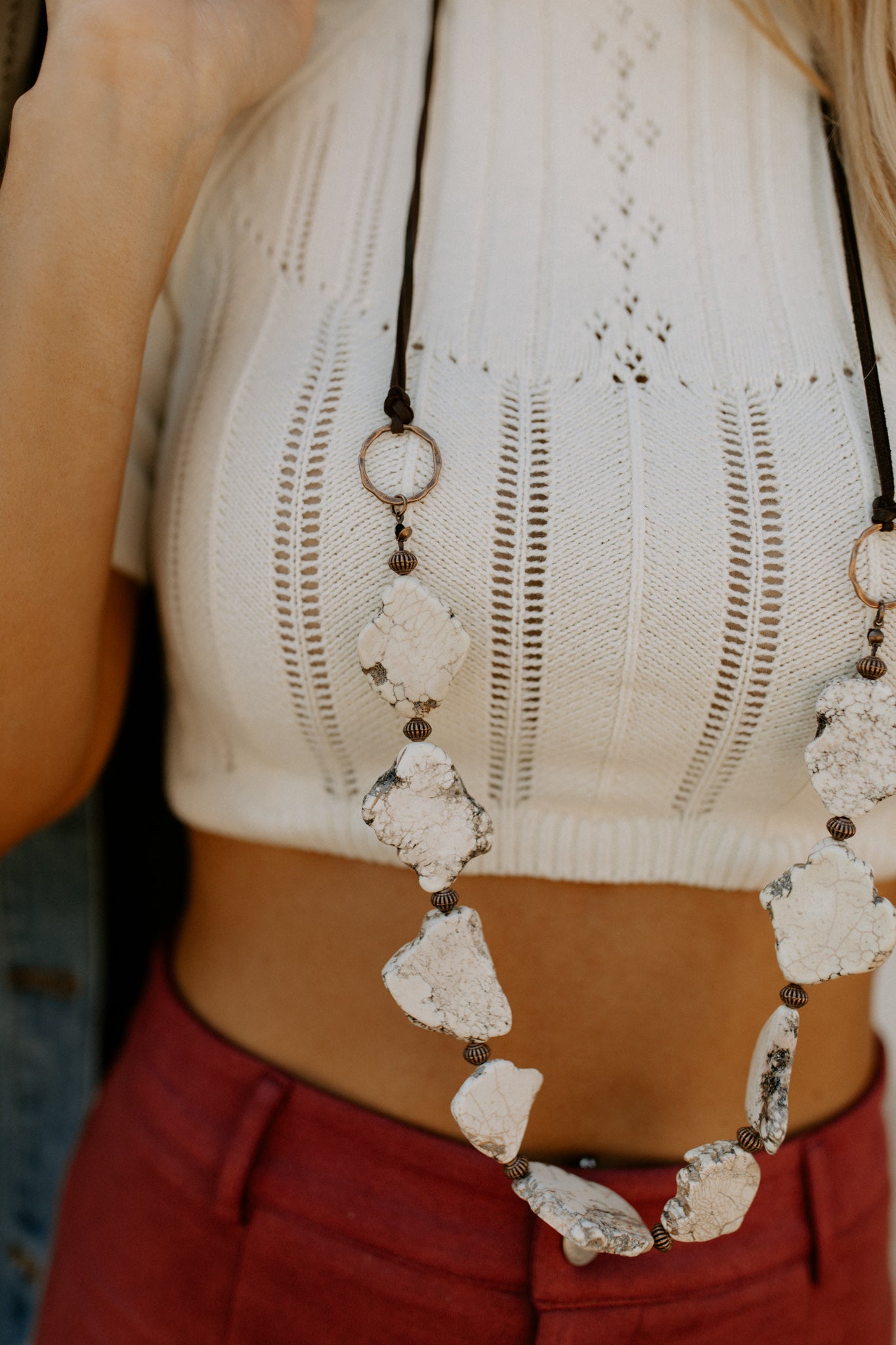 The perfect mix of boho and western. A total statement piece! This necklace features multiple white turquoise slabs on an adjustable leather strand with copper beads separating them.