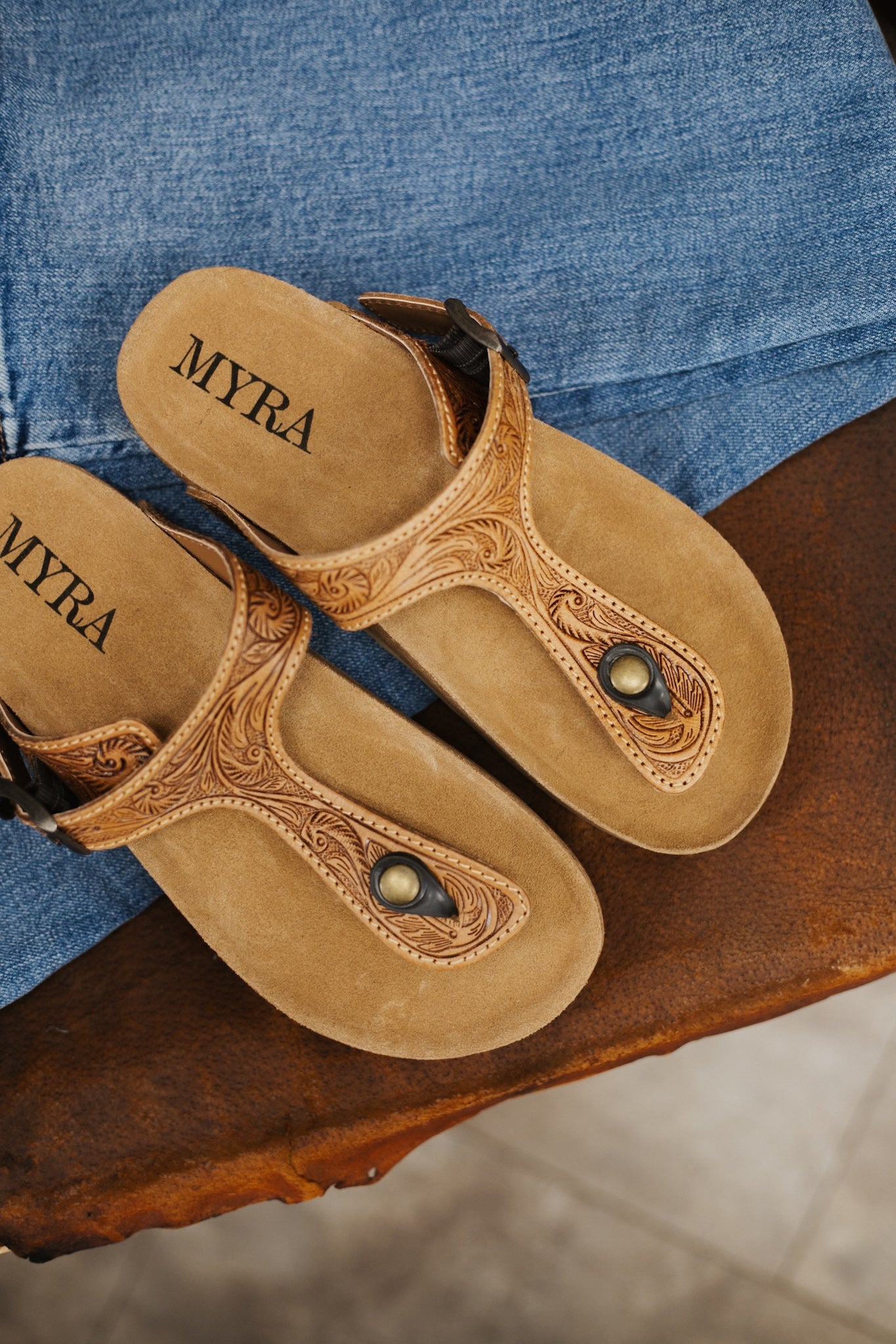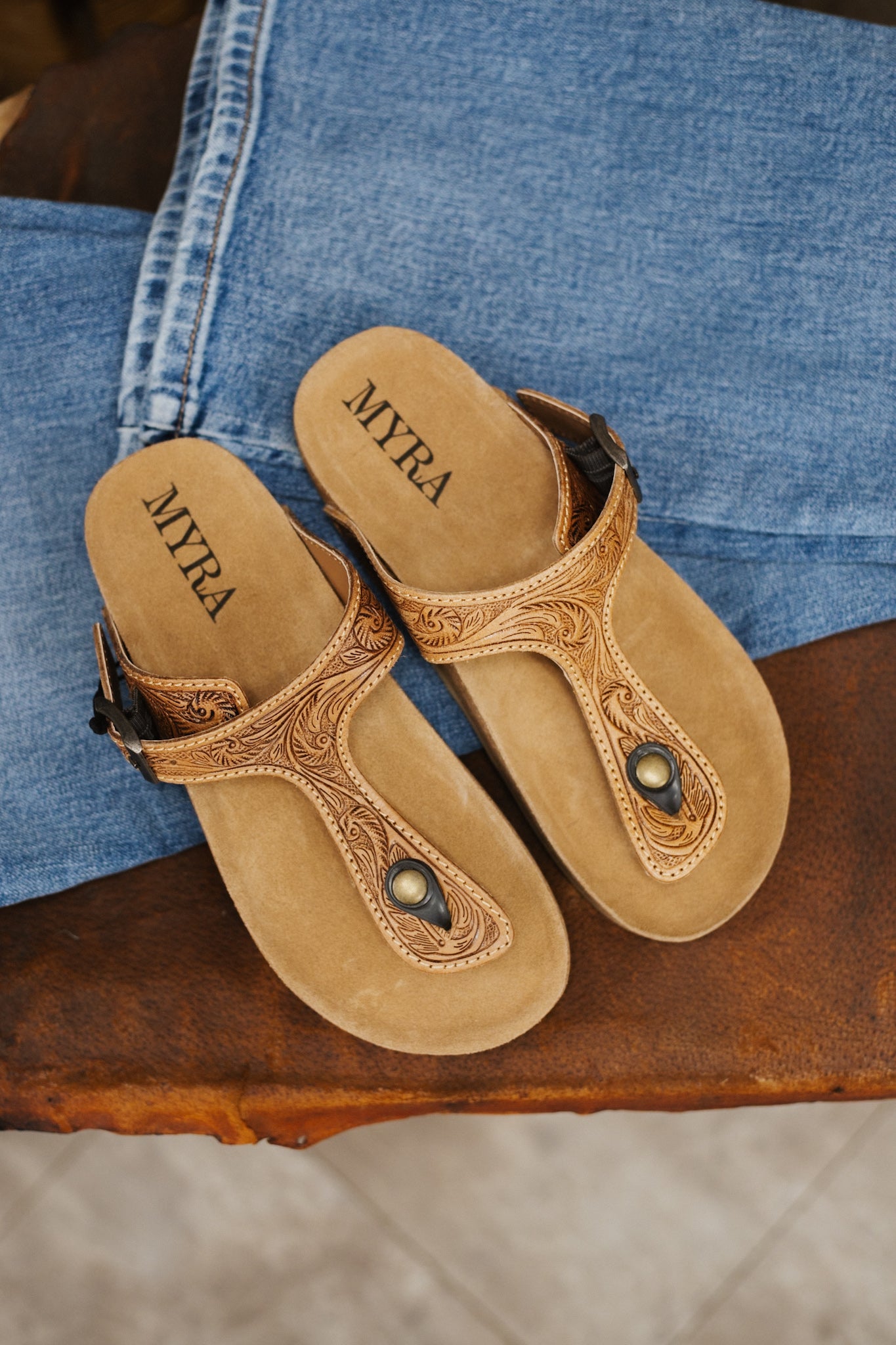 Complete your western look with Sadie Mesa Sandals. These hand tooled sandals come in a rich honey color, adding a touch of rustic charm to your outfit. Step into comfort and style with Sadie Mesa Sandals.