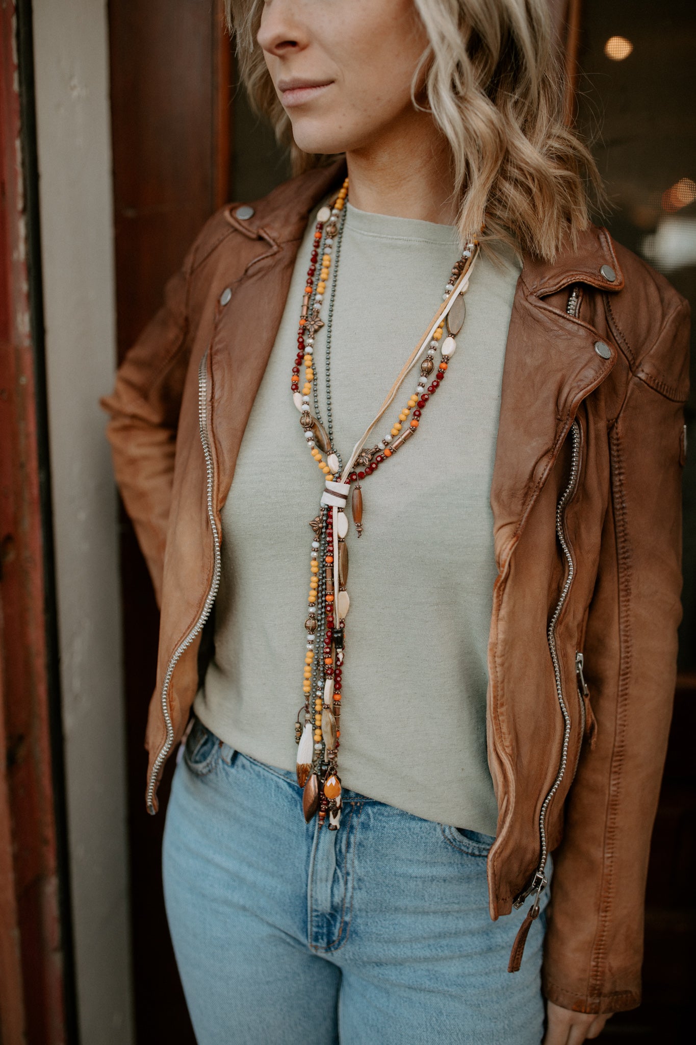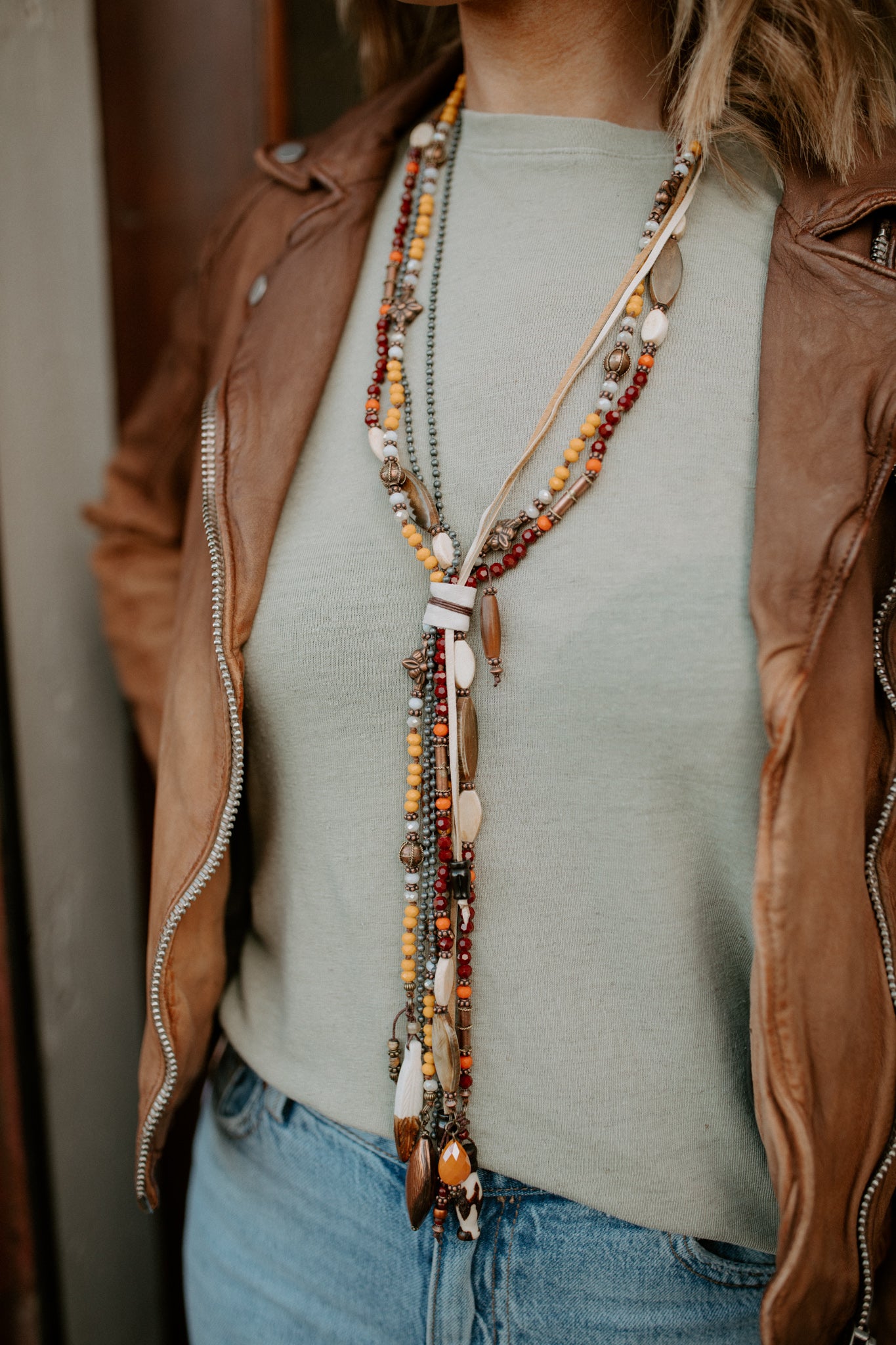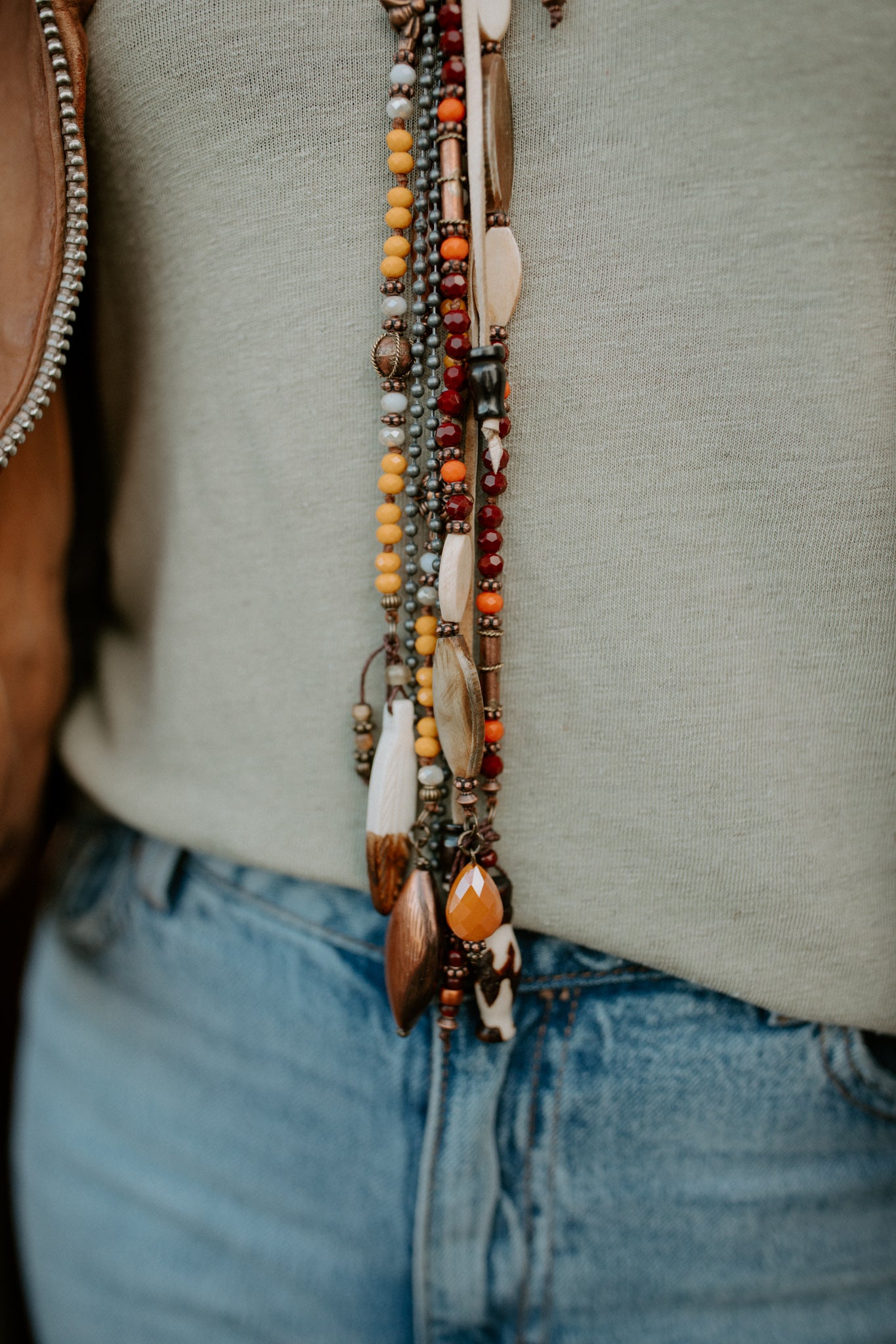 The Pendleton Clutch Necklace is a true work of art. Various strands of beautiful beadwork come together in a lariat style. A unique array of "charms" dangle from the necklace. Spice up your outfit with this piece!