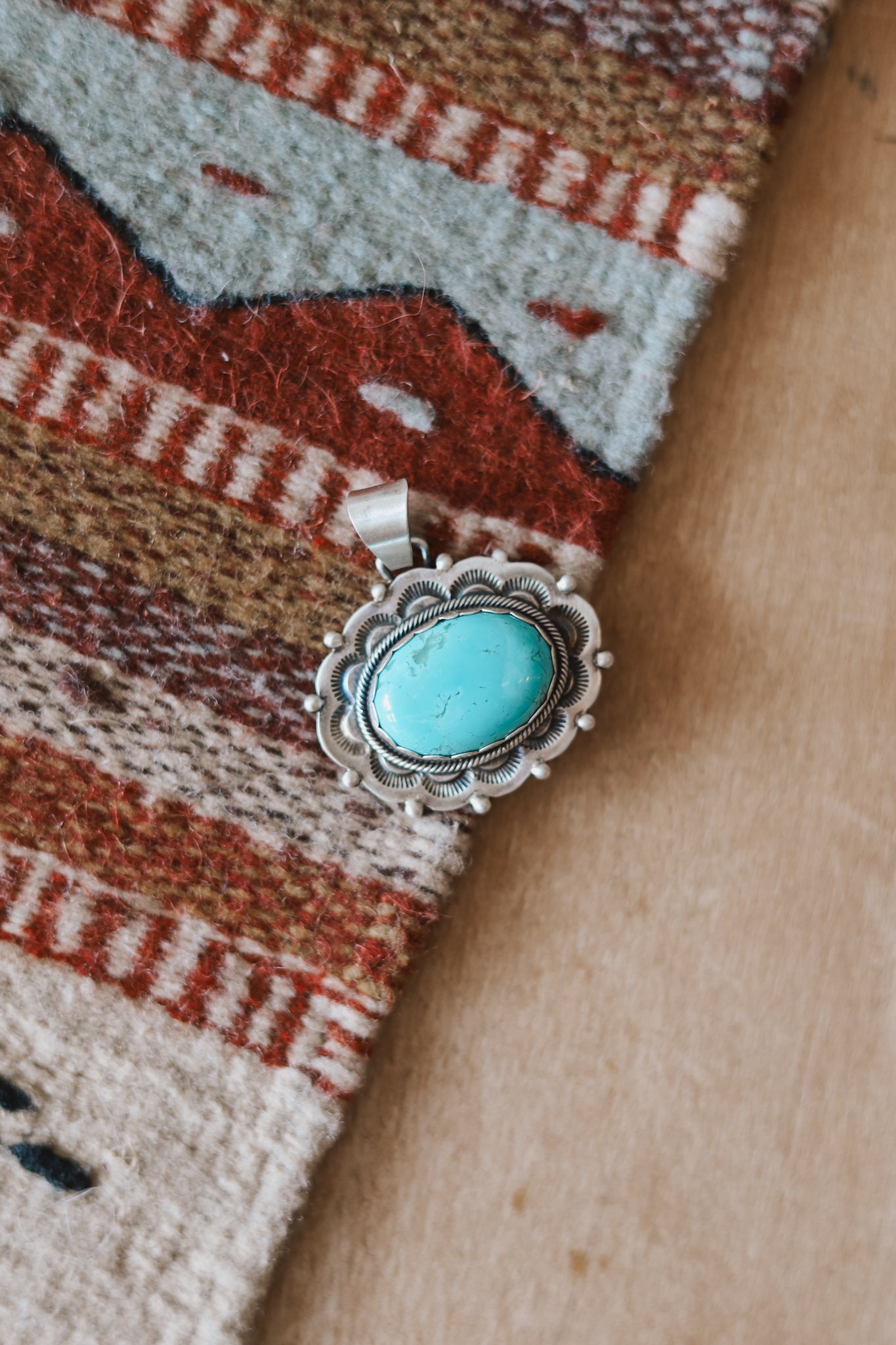 The Rosalee Pendant features a beautiful turquoise stone set in sterling silver.