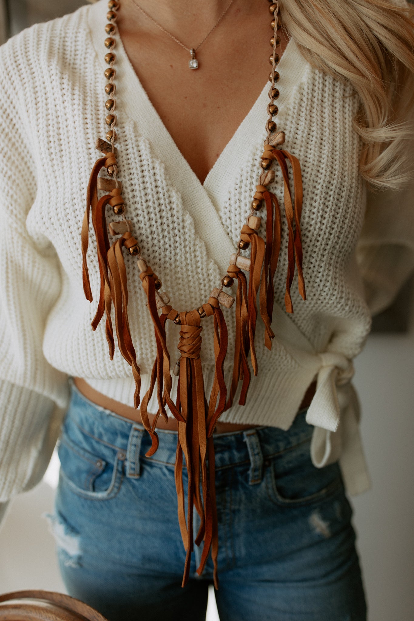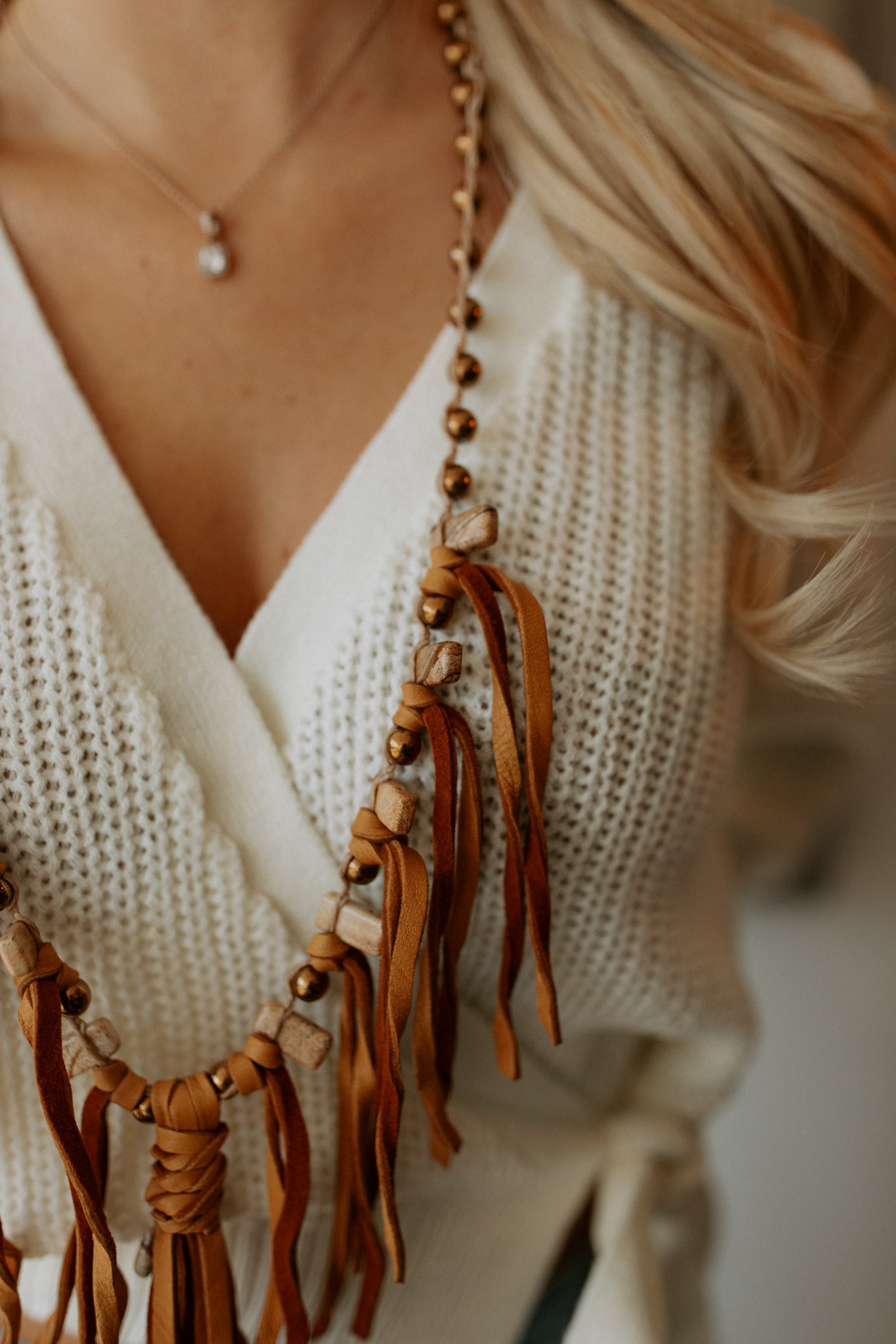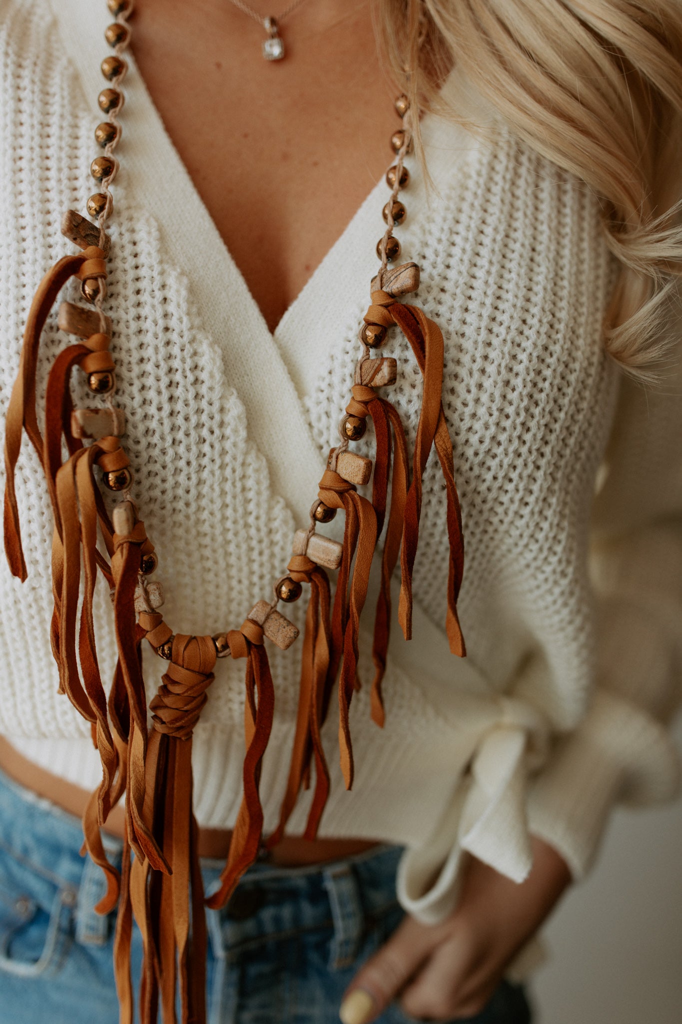 Regular price $169.95 CADThe Scout Necklace by Linn & Laurel Jewelry co. is as unique as it is beautiful! A statement mix of picture jasper and hematite stones, as well as ultra soft deerskin leather tassels. We love the way this necklace brings a rugged beauty and western vibe to any outfit!
