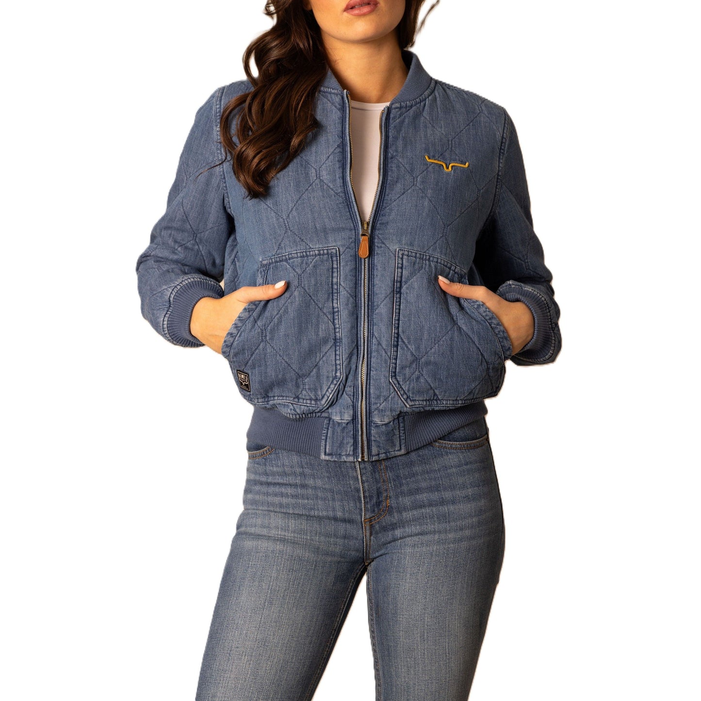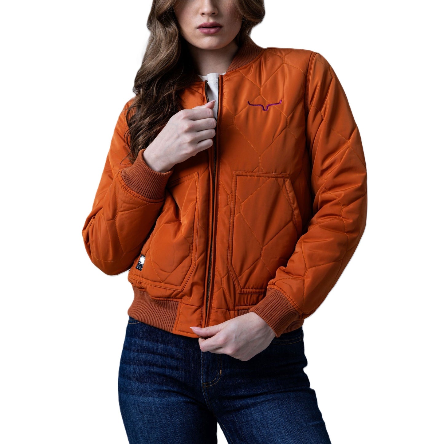 Details: Long Sleeve, Quilted Fabric, Full Front Zip, 2 Large Hand Pockets, Ribbed Stretch Hem and Cuffs, Contrast Color Lining, Embroidered Horns Logo and Kimes Ranch Patch at Pocket