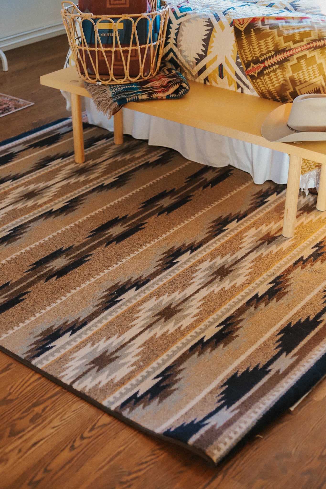 ¢ These fine Southwest-inspired area rugs are made in the U.S. on American machines.