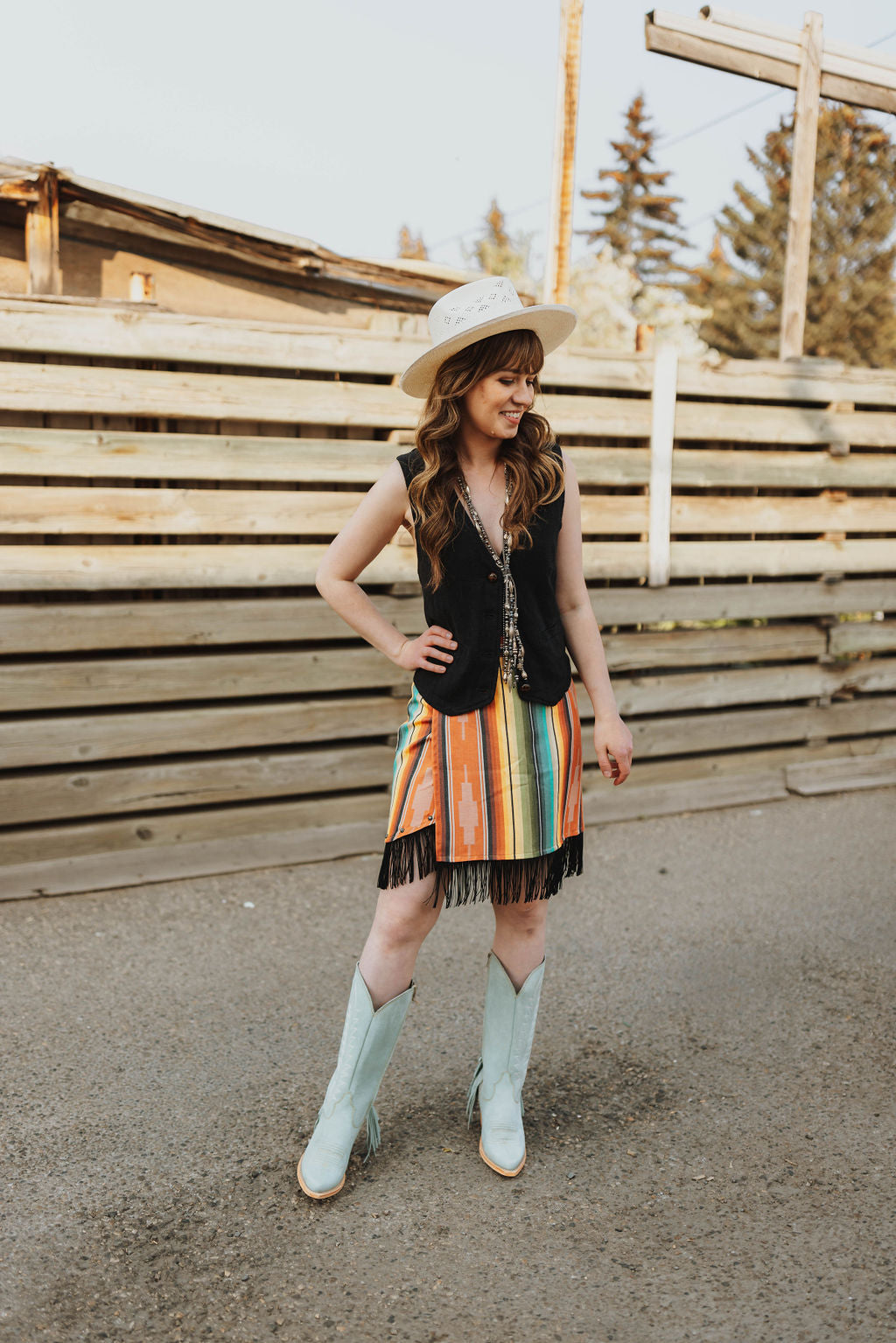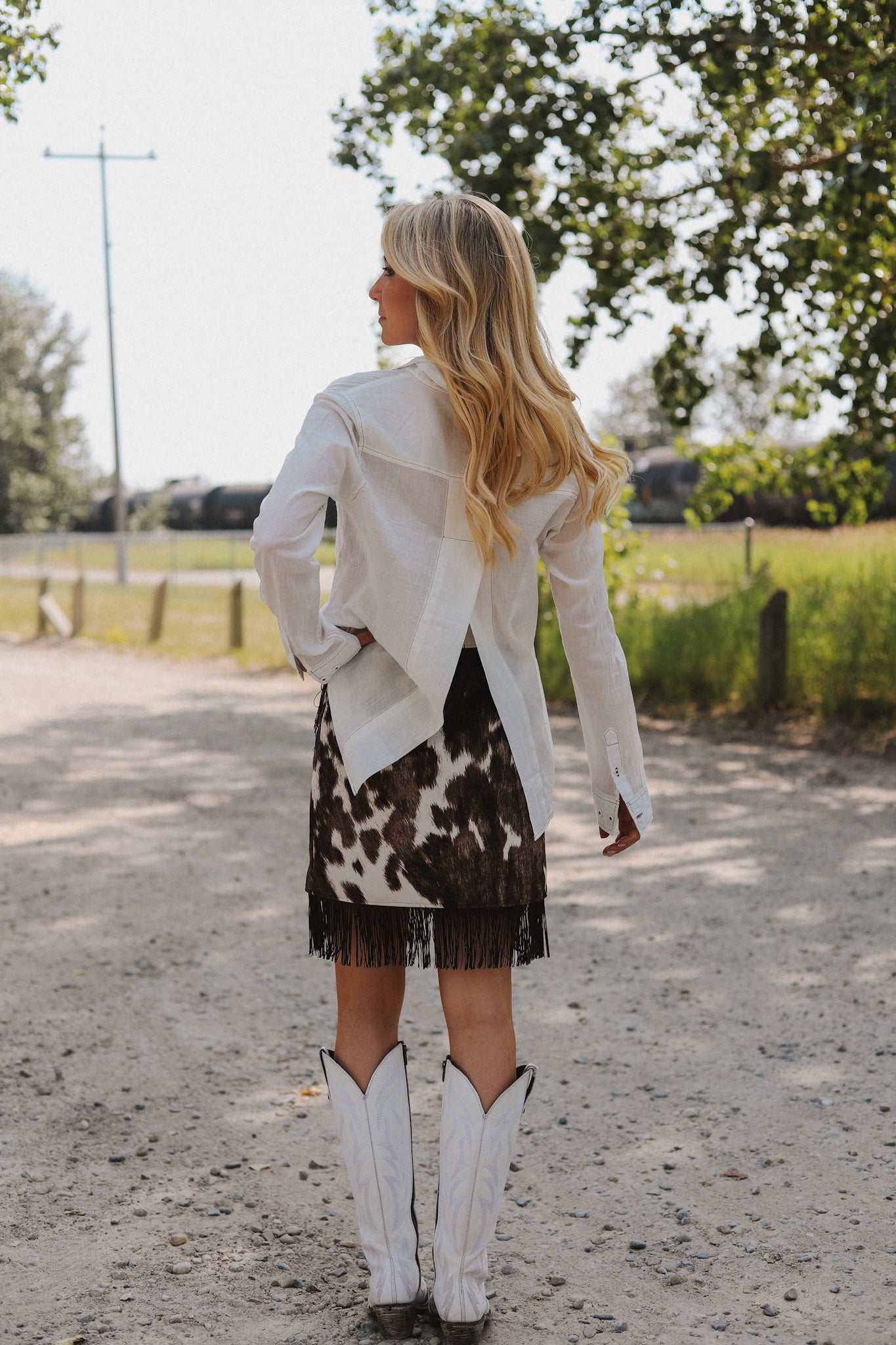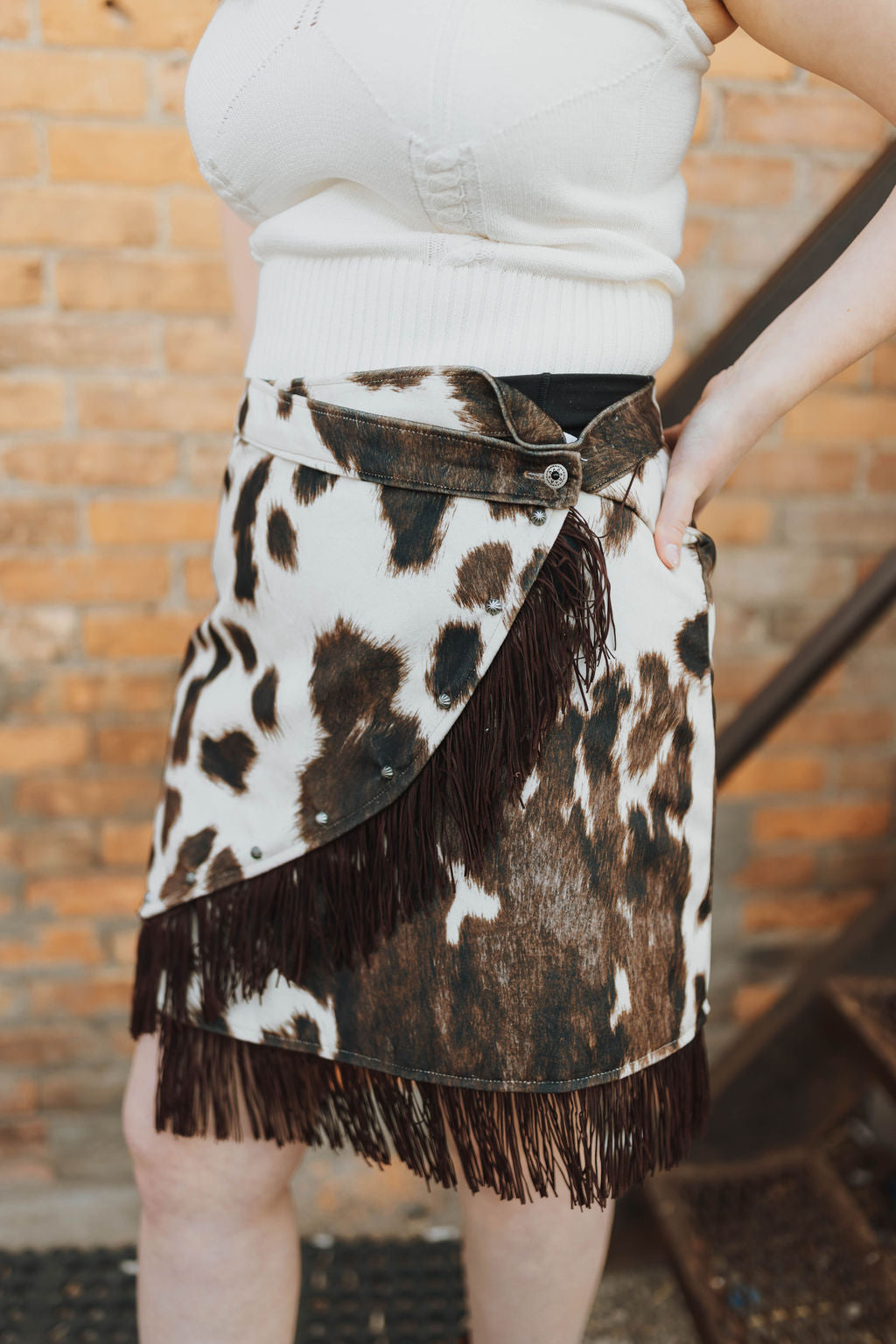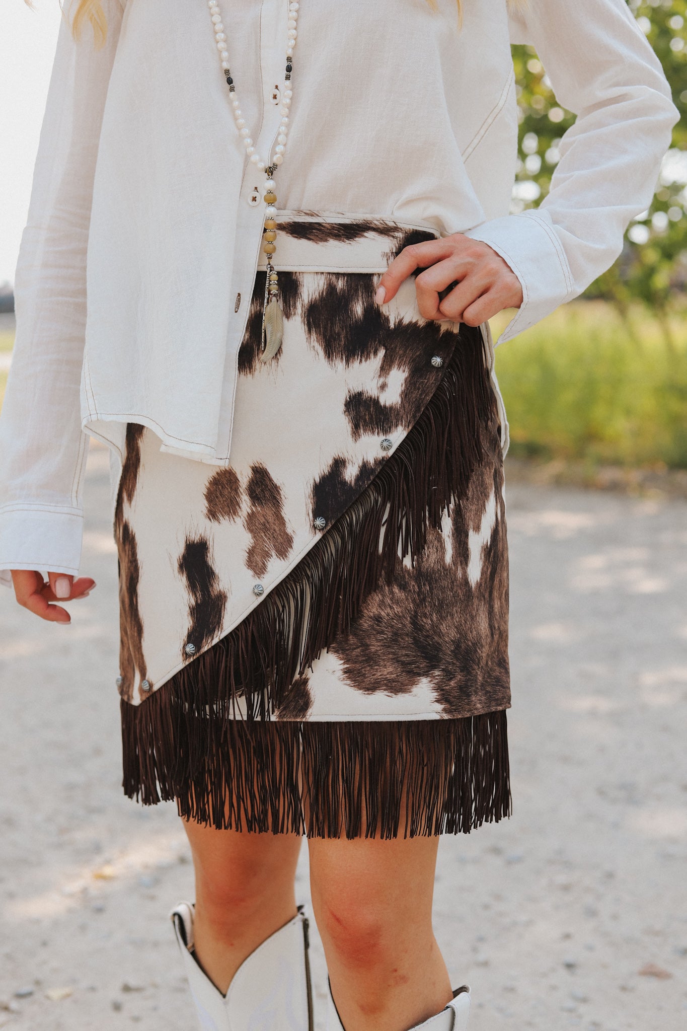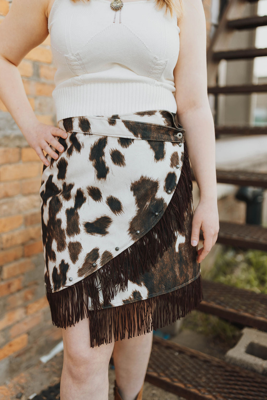 This fringe, small label made skirt is the perfect summer and transitioning to fall addition to your closet! Get this look in a serape style or cow print style.