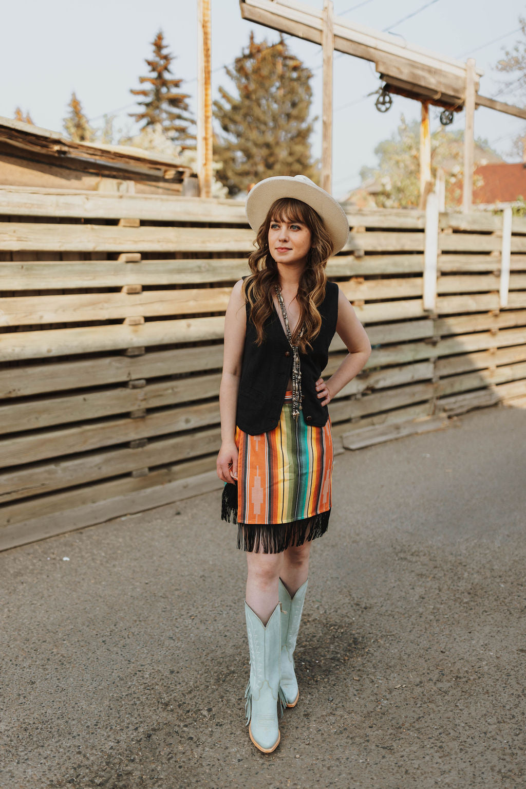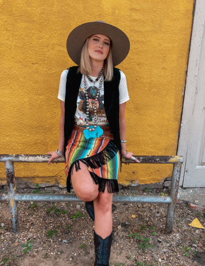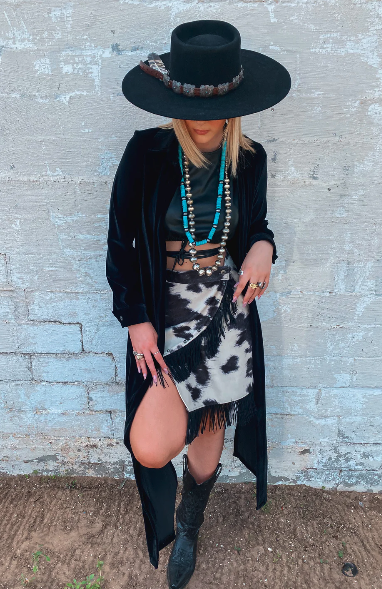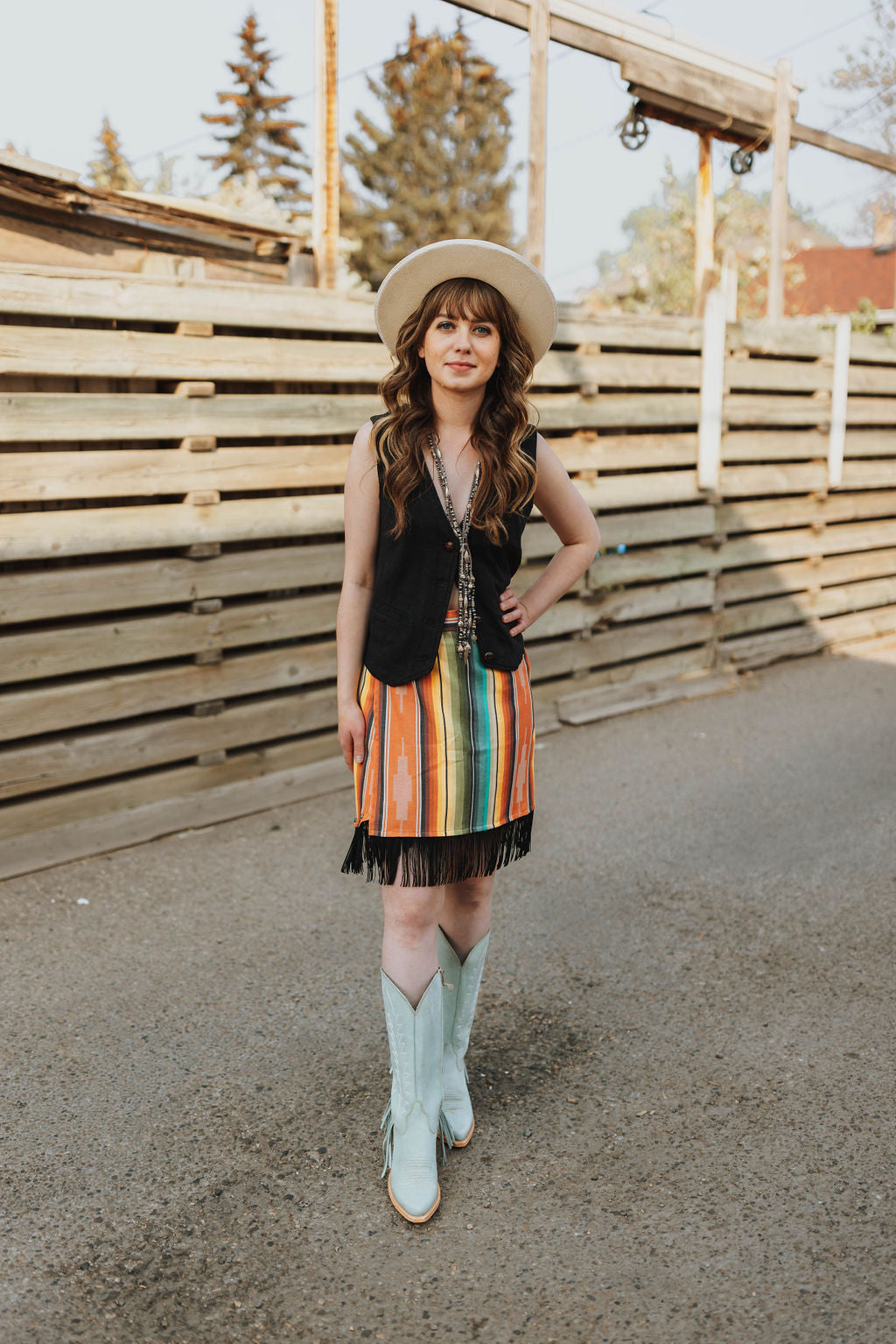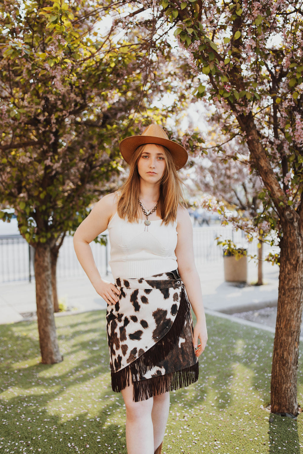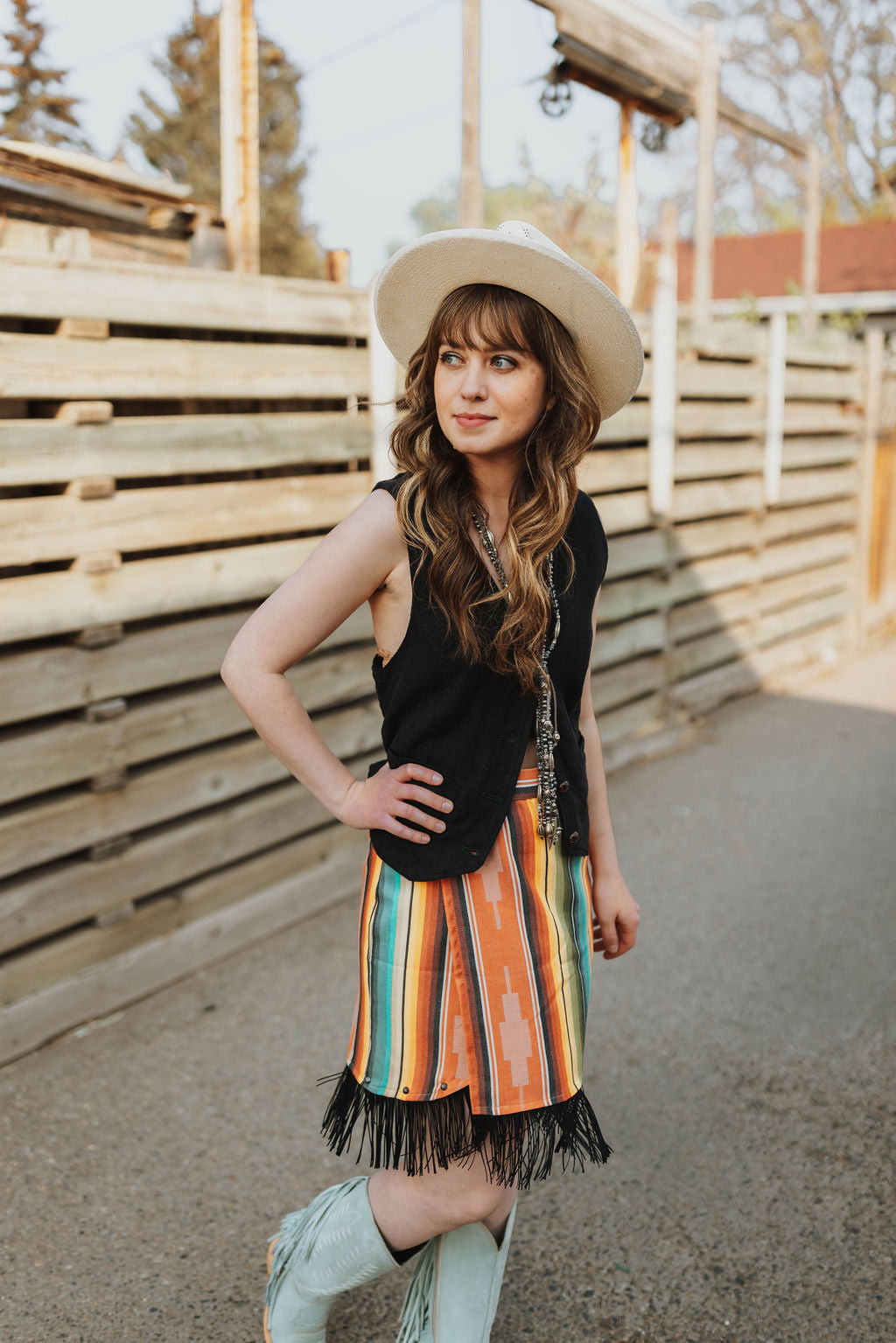 This fringe, small label made skirt is the perfect summer and transitioning to fall addition to your closet! Get this look in a serape style or cow print style.