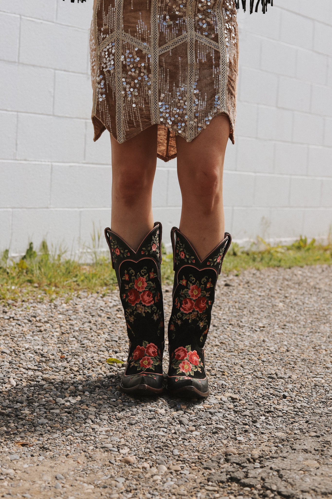 An ode to our Signature Bonnie, this pair of black cowgirl boot is a must have for the season. Crocheted red floral embroidery pops up beautifully against the black leather. Interplay of suede and distressed leather adds a textural intrigue. It is the perfect black boot you have been looking for.