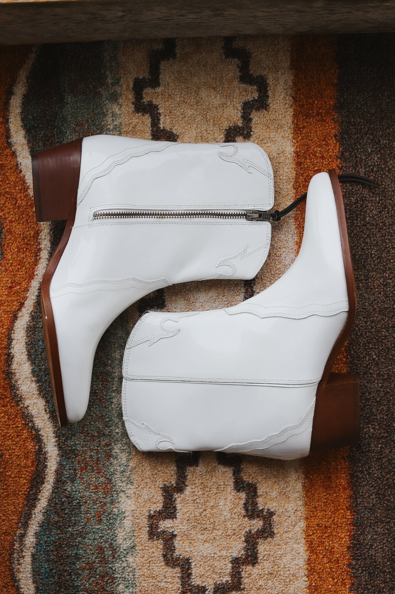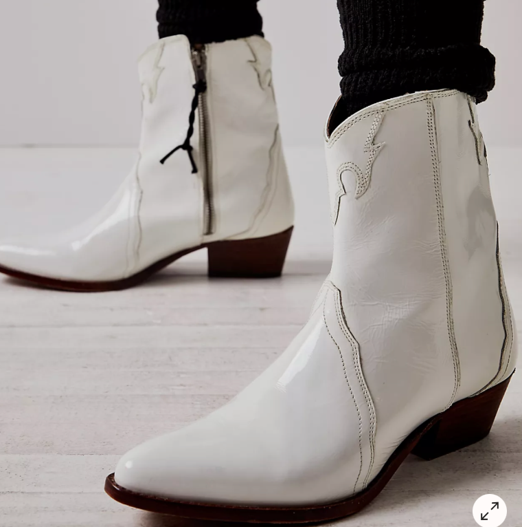 Stand out in these patent leather ankle boots in a western-inspired silhouette featuring a stacked heel and pointed toe.