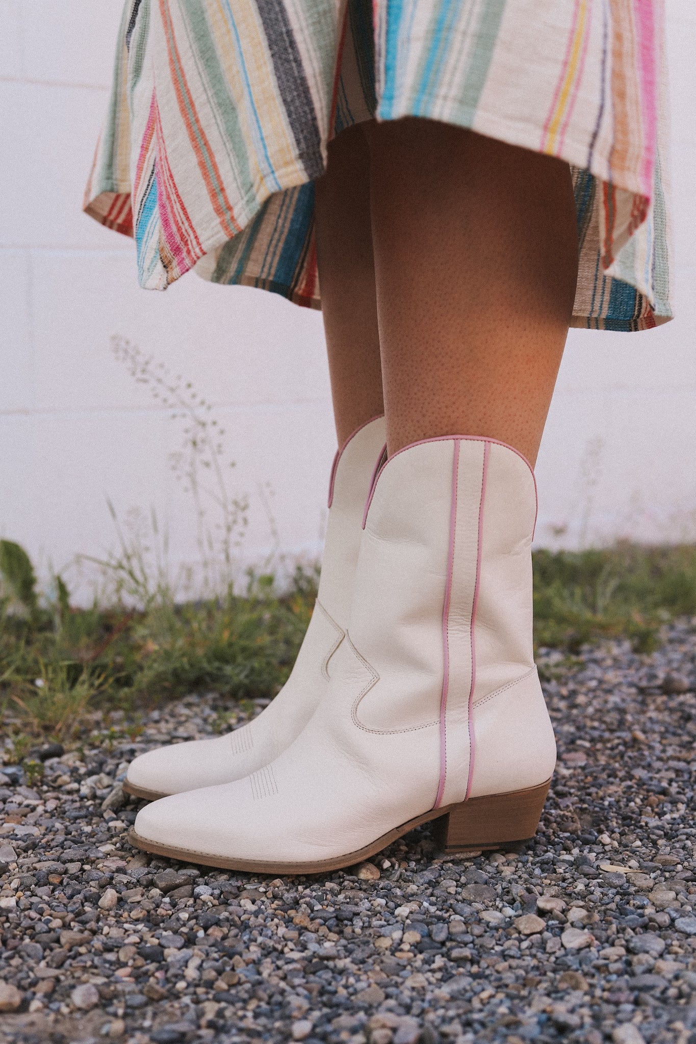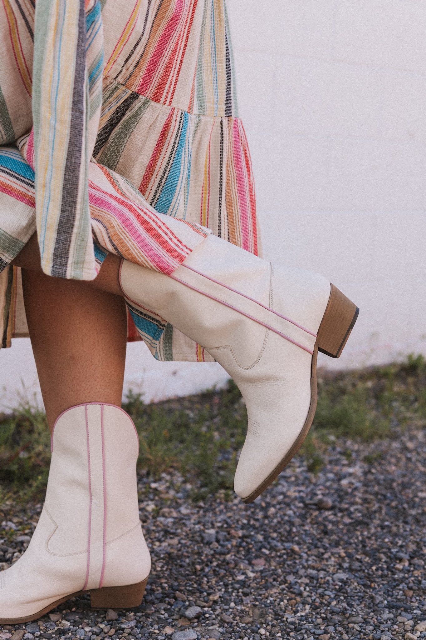 So simple with a subtle pop of color, these essential Western boots are featured in an ankle length with a lived-in leather fabrication and colorful piping details.