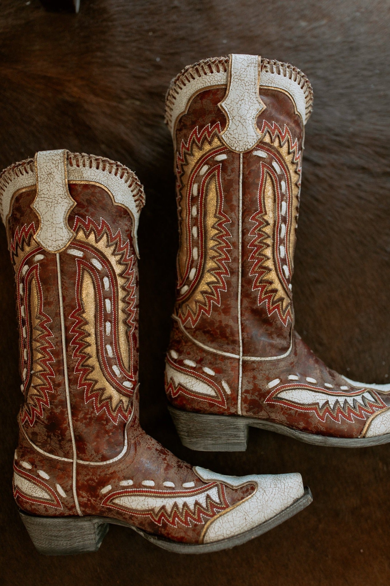 Regular price $594.95 CADWe are loving the Quirogo Boot from Old Gringo. These chic cowgirl boots feature the most beautiful distressed finish on leather. Just check out the pop of white from the overlay designs, that brown Aztec cut-outs, and those fancy white toes. They're versatile and classic with tons of wow factor.