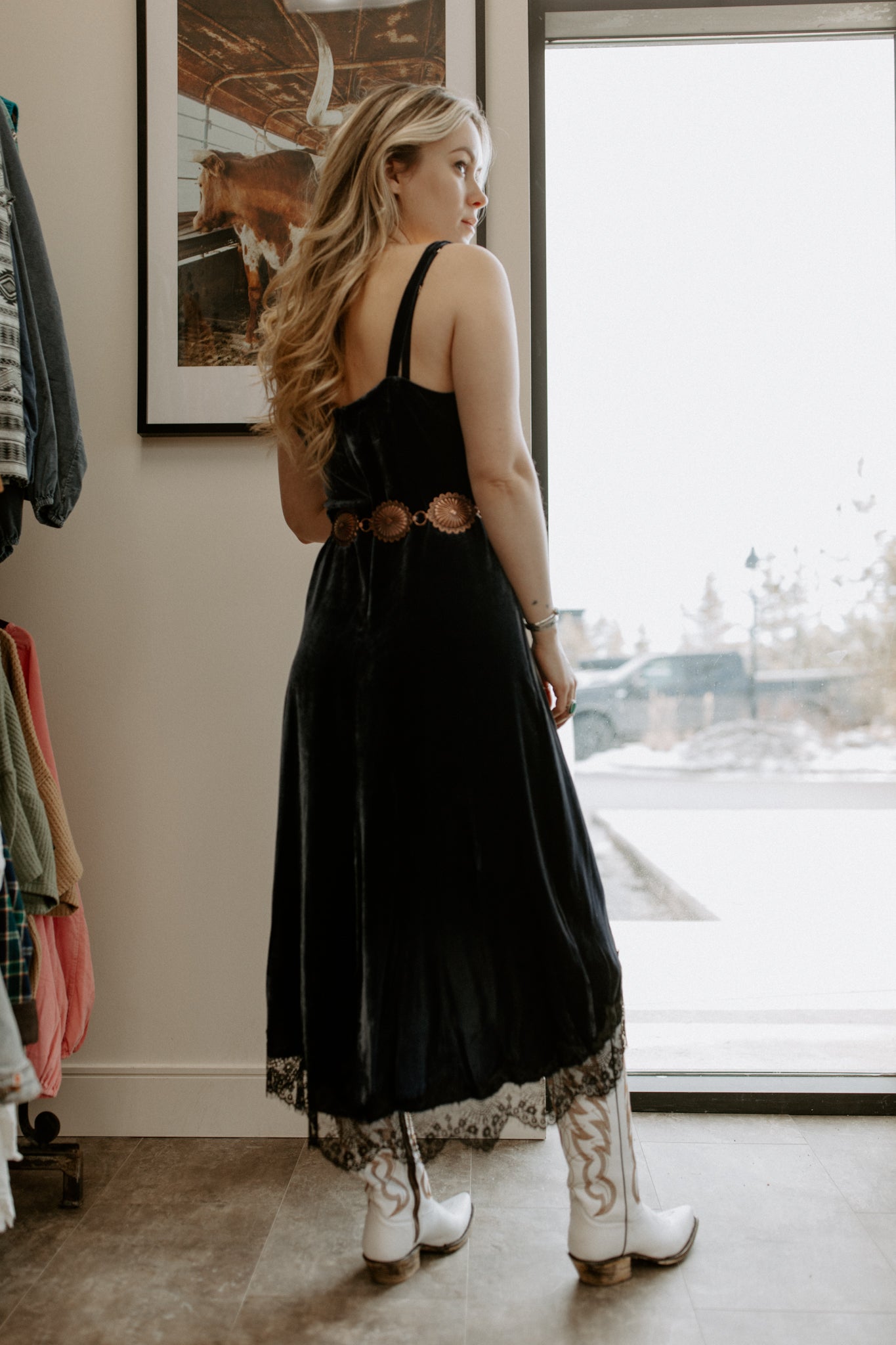 Regular price $142.00 CADLounge in style with this stunning velvet slip dress. The smooth silk blend, embroidery details, and delicate fit make this gorgeous slip dress a fashion must-have, while the lace embellished hem adds some structure to the piece. This soft slip dress is an ideal piece for layering underneath a comfortable silk kimono.