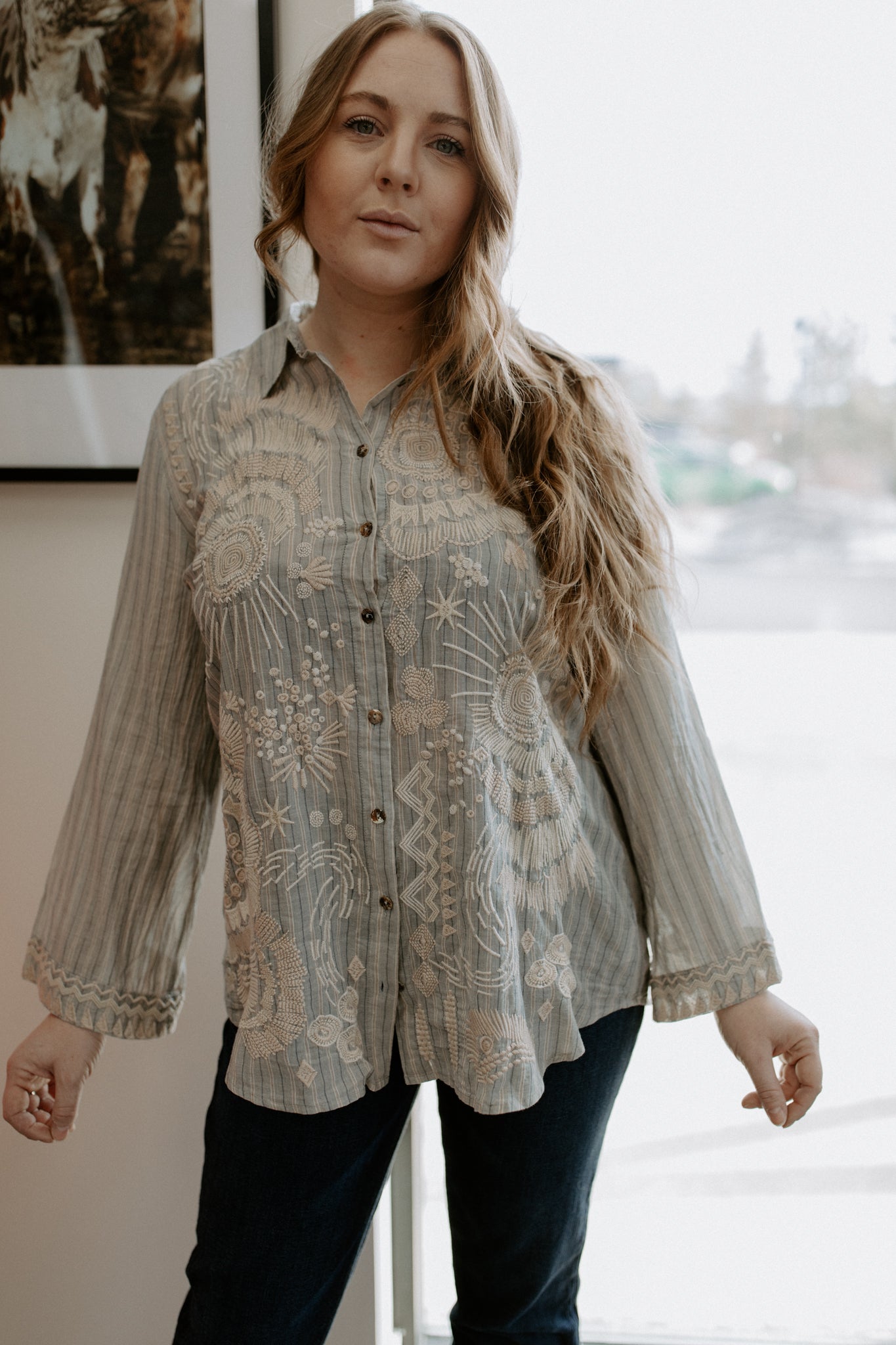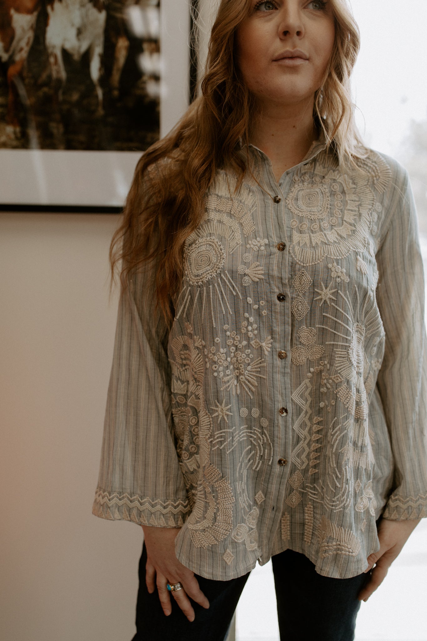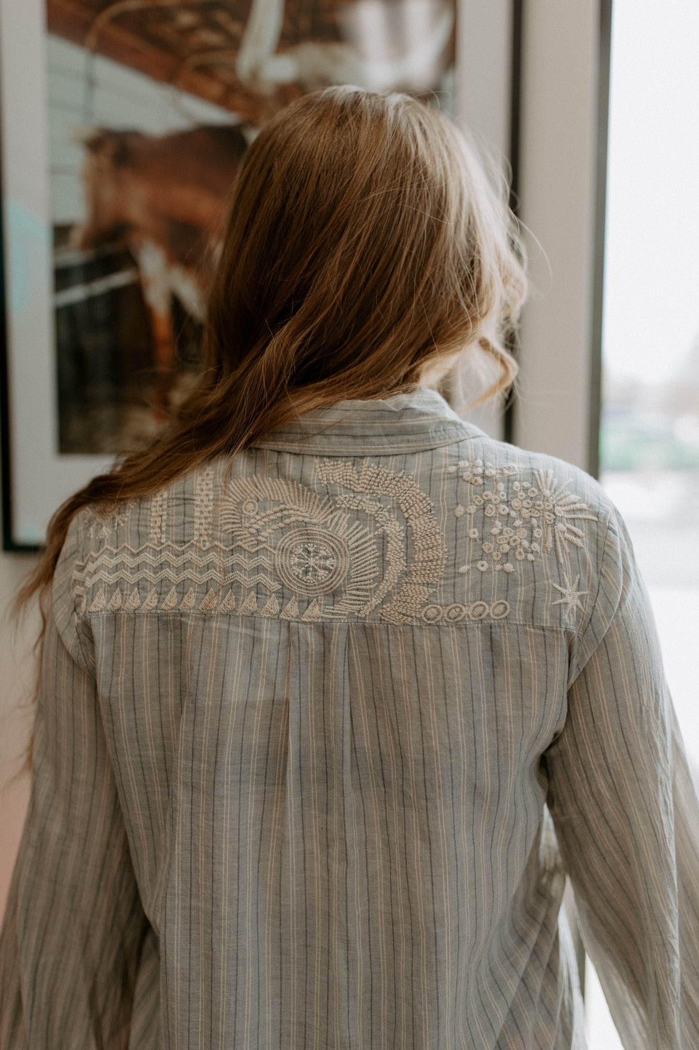 Regular price $118.00 CADFeaturing a lightweight pinstriped fabric with gorgeous contrasting embroidery. We are smitten with this elegant top. Featuring a button front and slight flare to the sleeves.