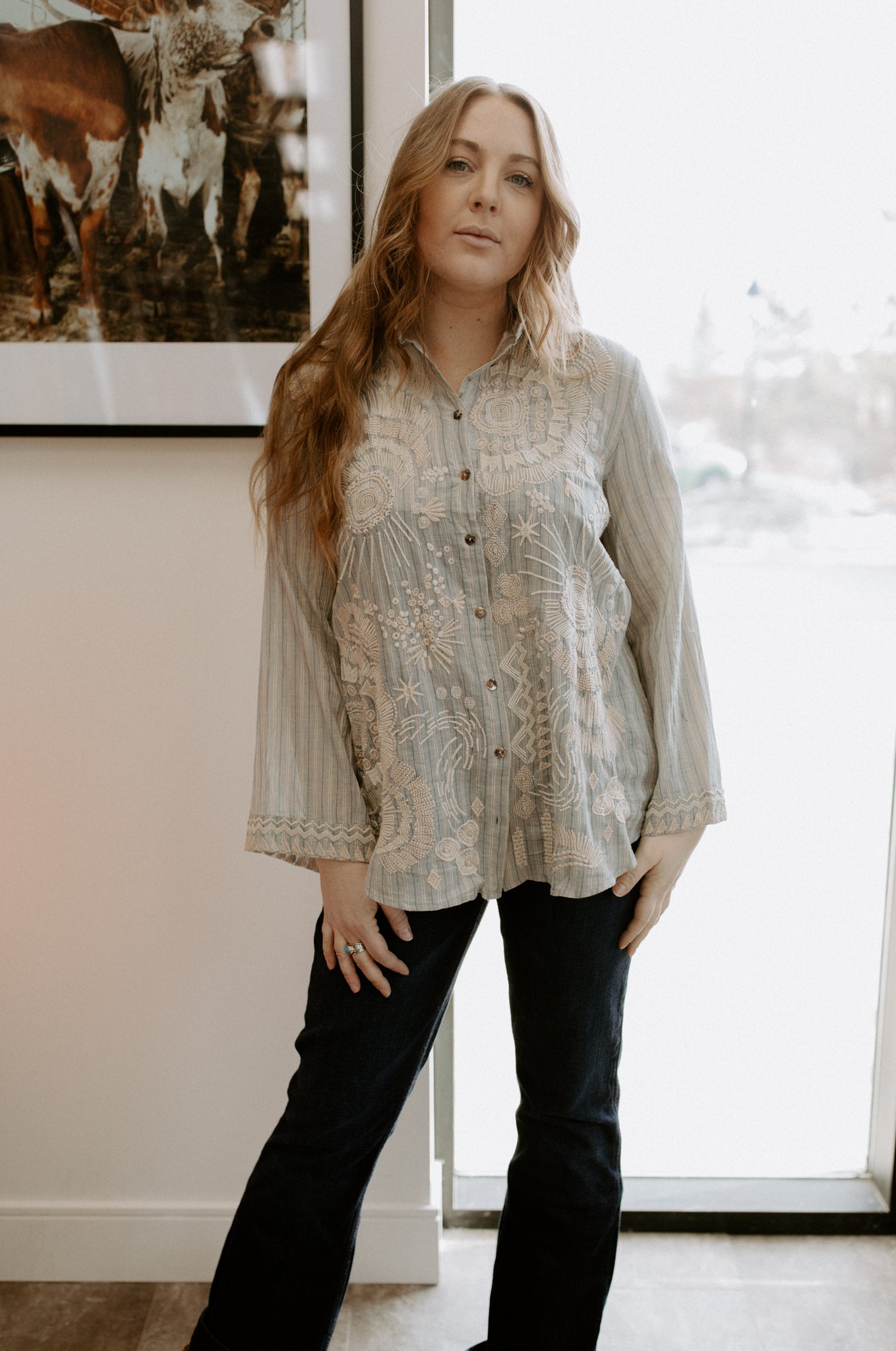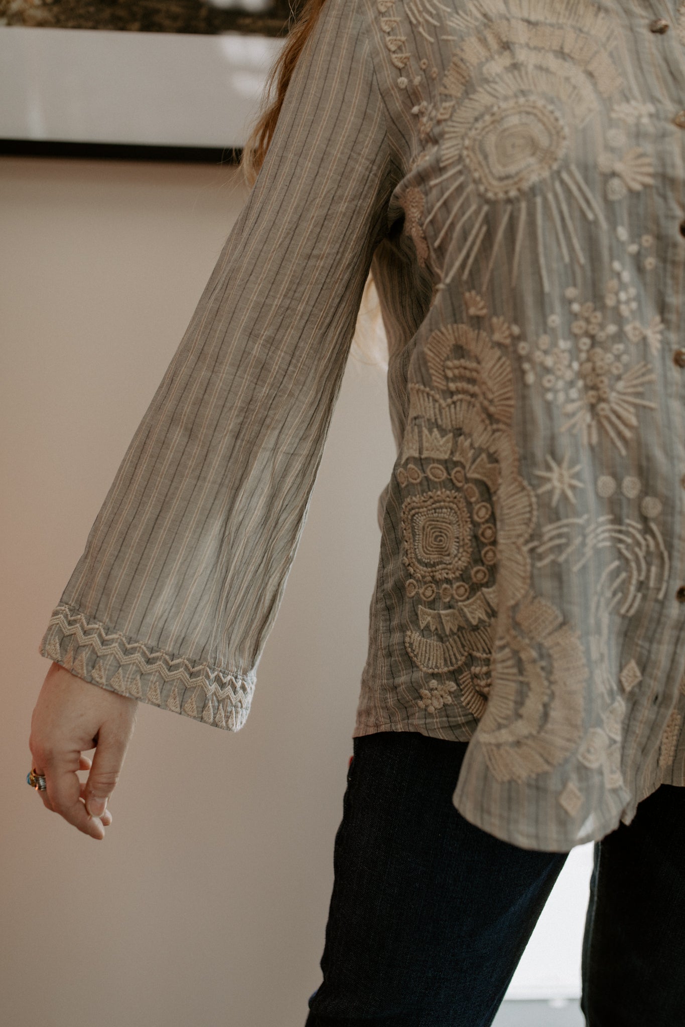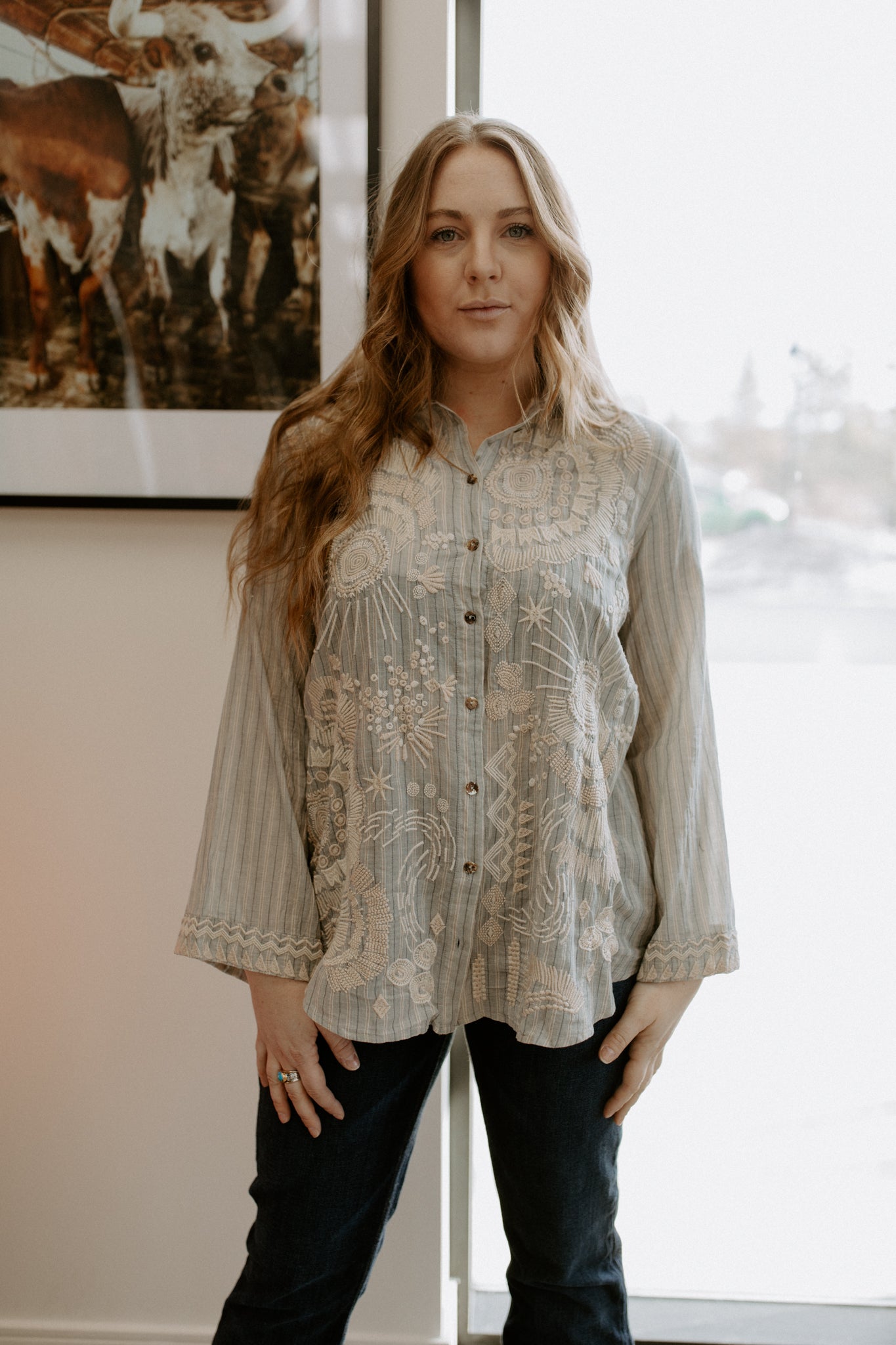 Regular price $118.00 CADFeaturing a lightweight pinstriped fabric with gorgeous contrasting embroidery. We are smitten with this elegant top. Featuring a button front and slight flare to the sleeves.