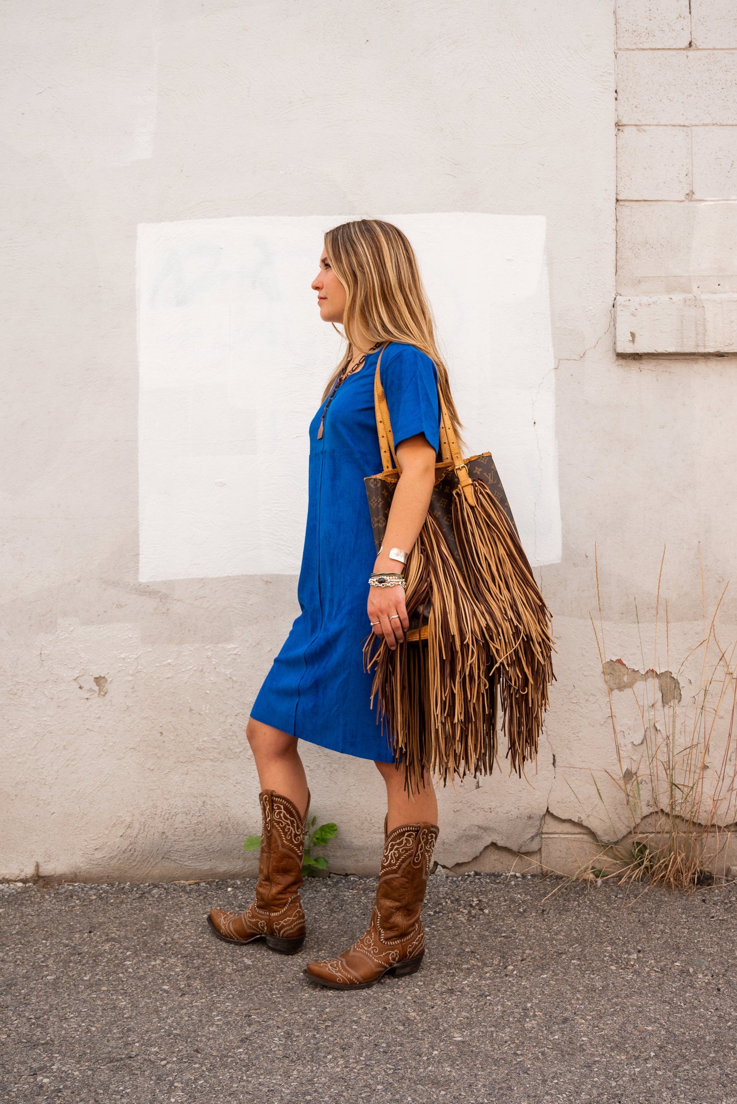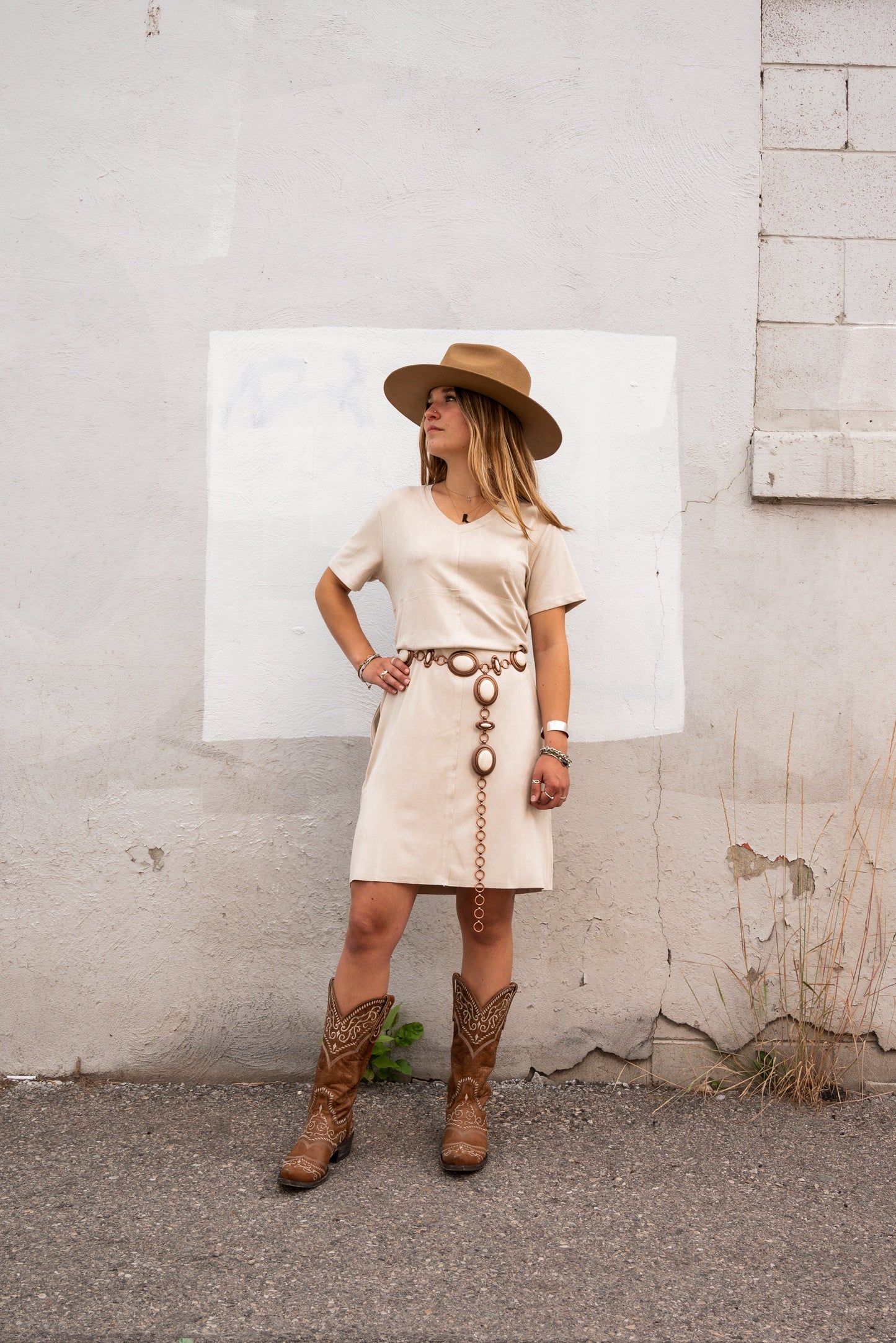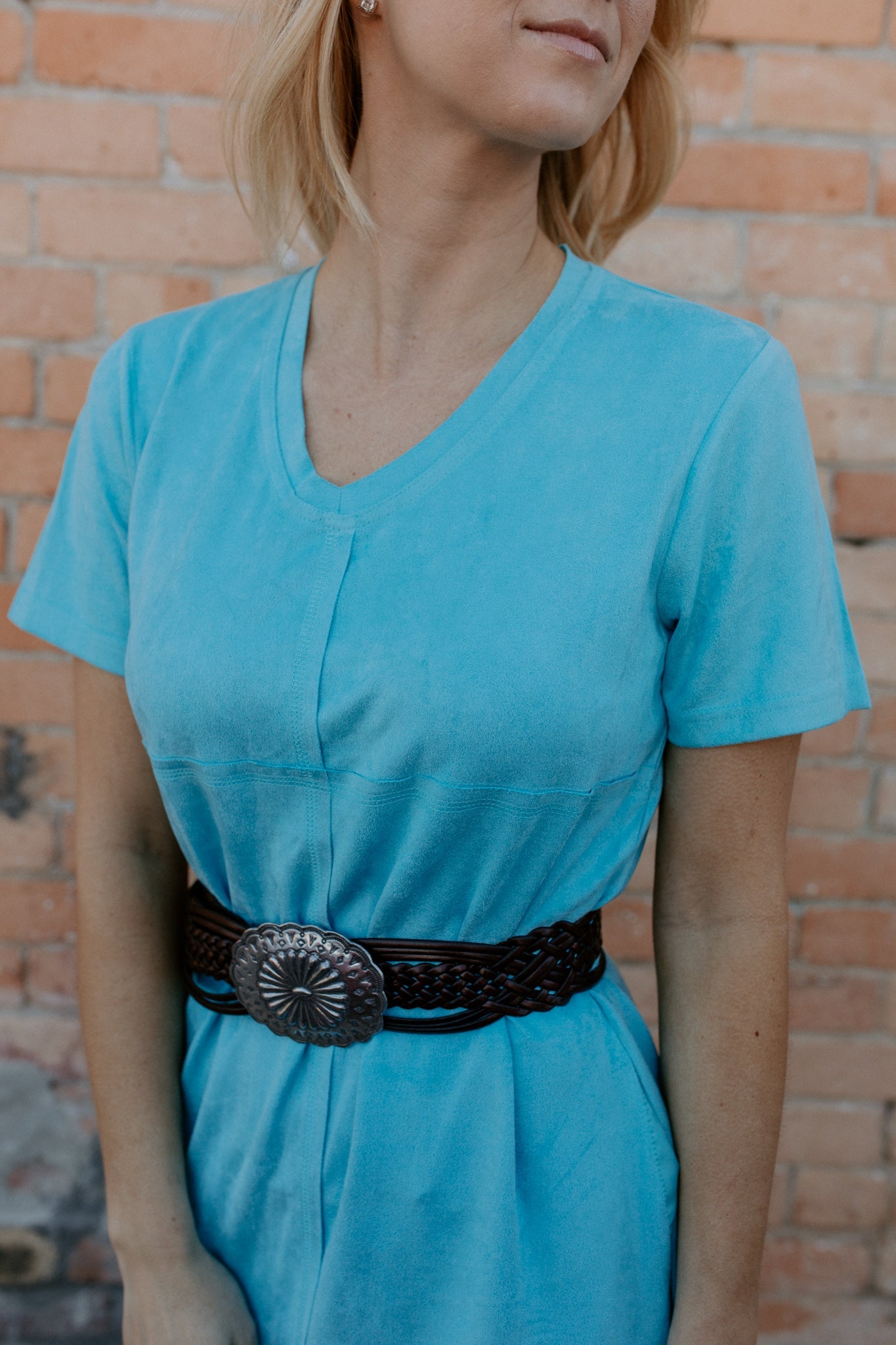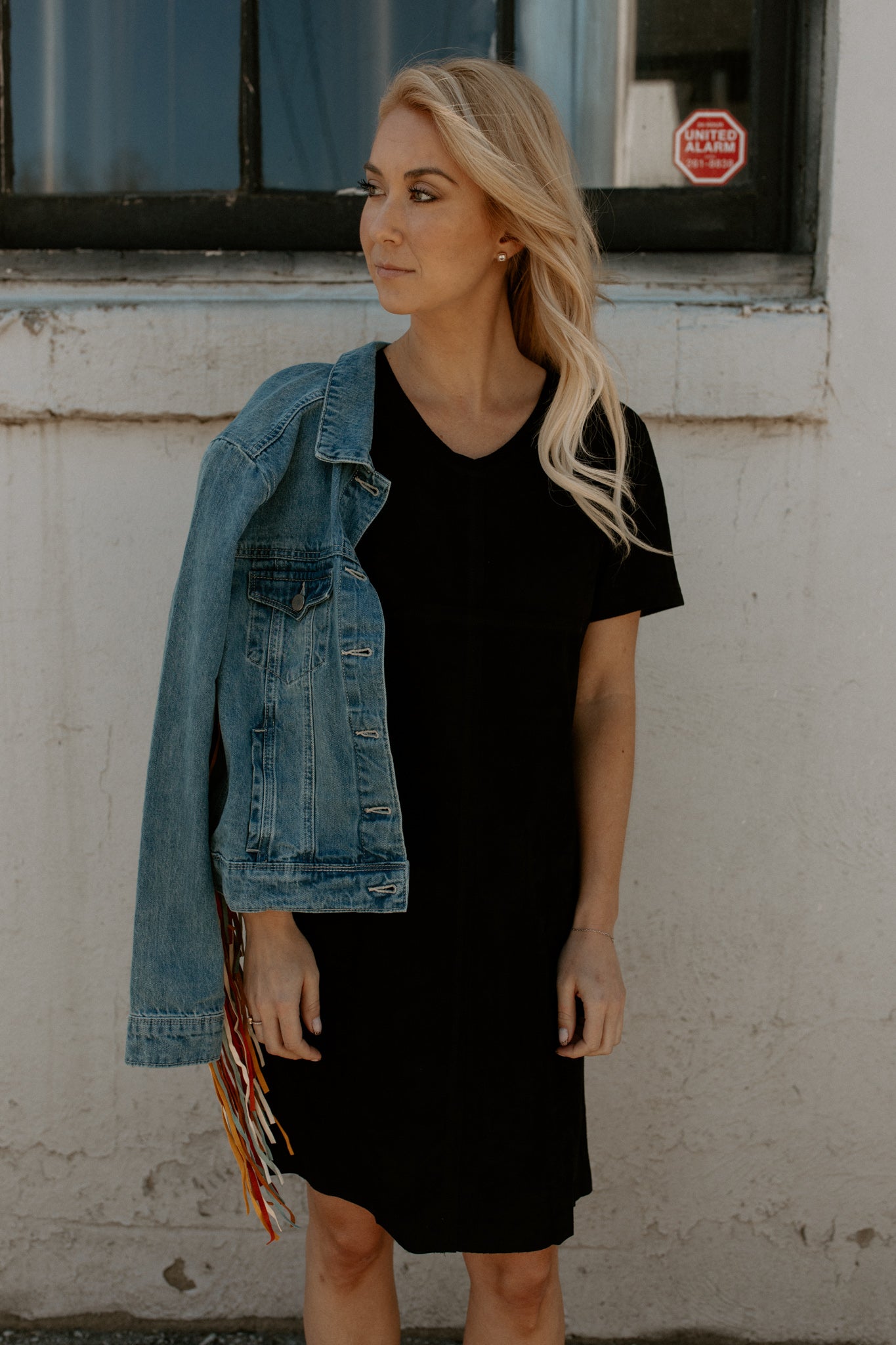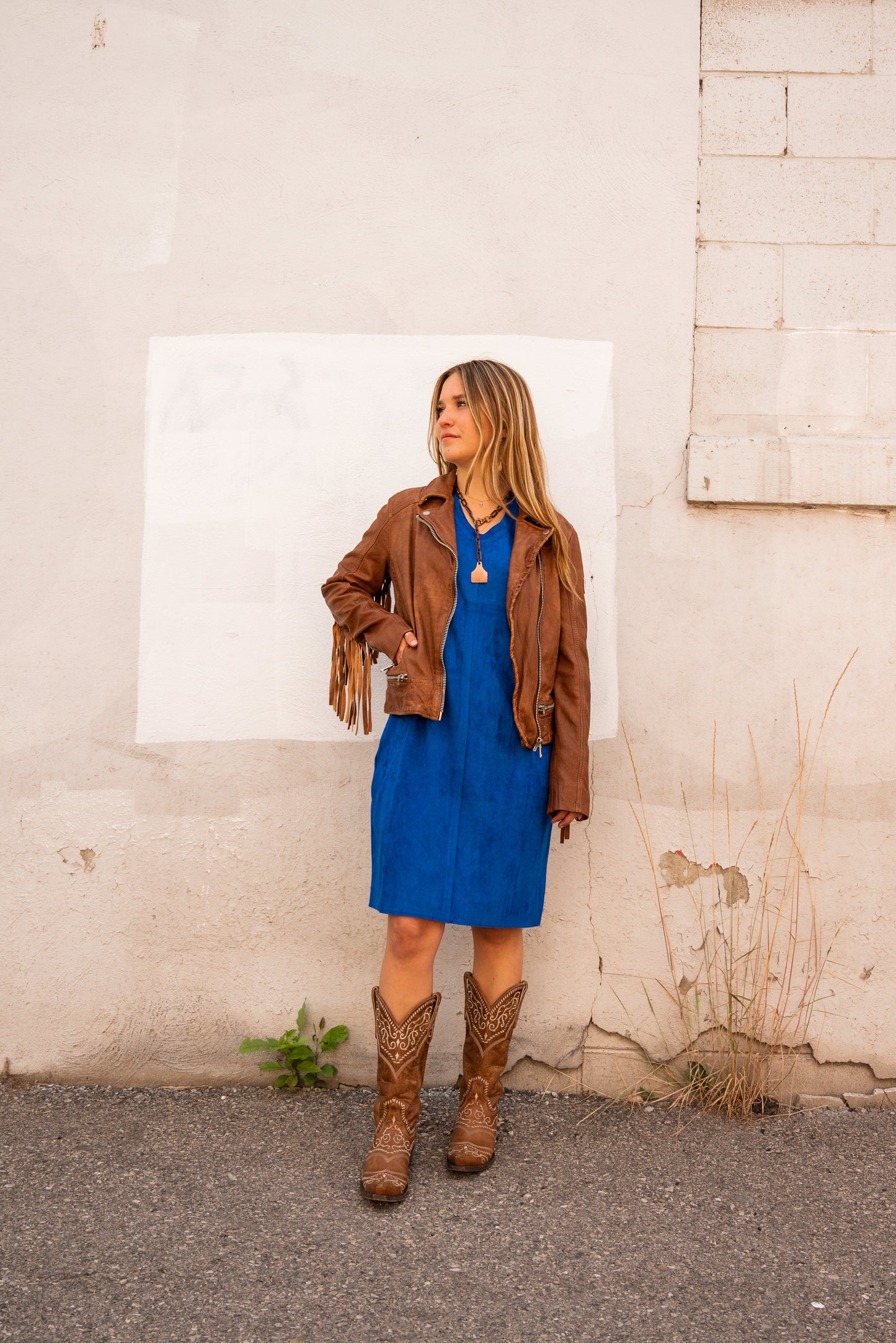 The Audrey Mini Faux Suede Dress is a gorgeous base piece. Light as a feather and with pockets. You can dress down this stylish piece with some sneakers or dress it up with a blazer and boots. Any of our jewelry pieces will look amazing on it.Â