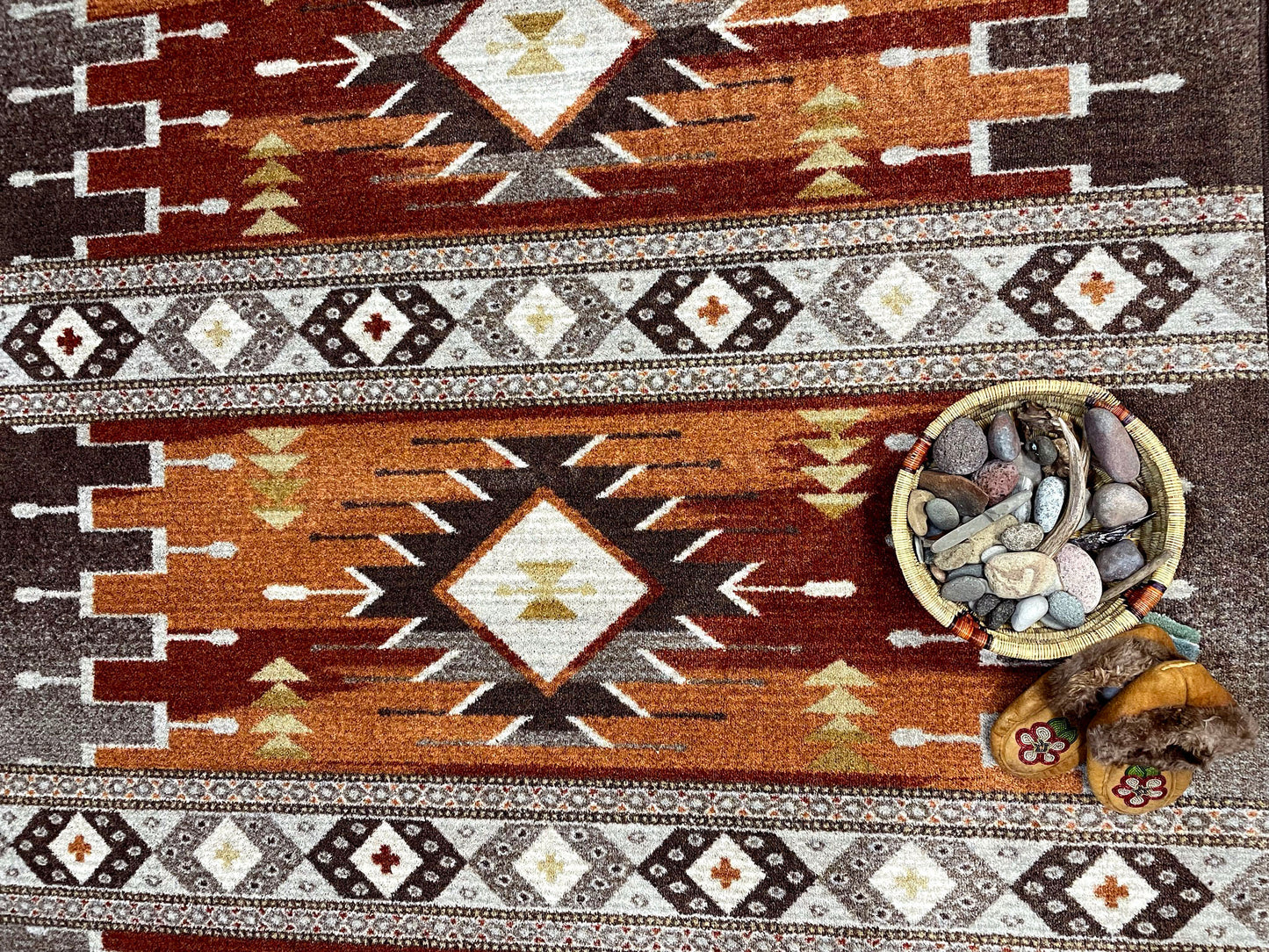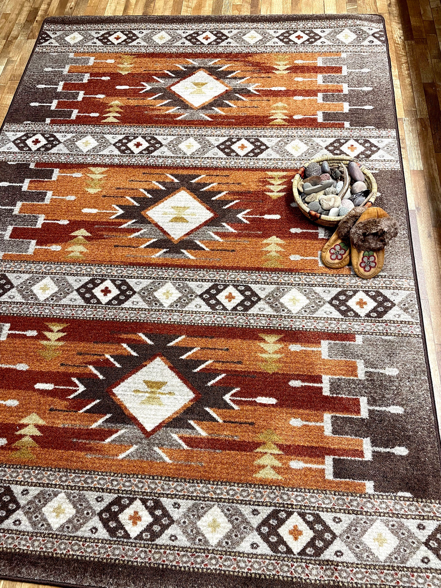 These fine Southwest-inspired area rugs are made in the U.S. on American machines. Colors are inspired by the plant and mineral dyes found in the Southwest and Native American art. These designs look perfect in your home, cabin or workplace.