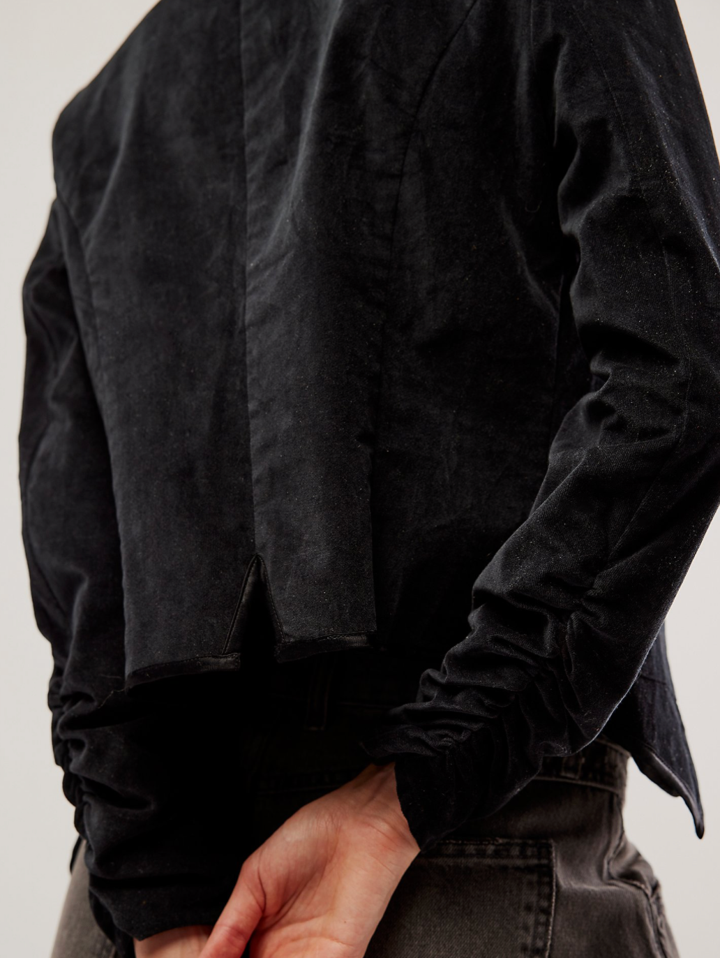 - Scoop neckline, button-front closure, ruching at sleeve cuffs, pointed bottom hem at front