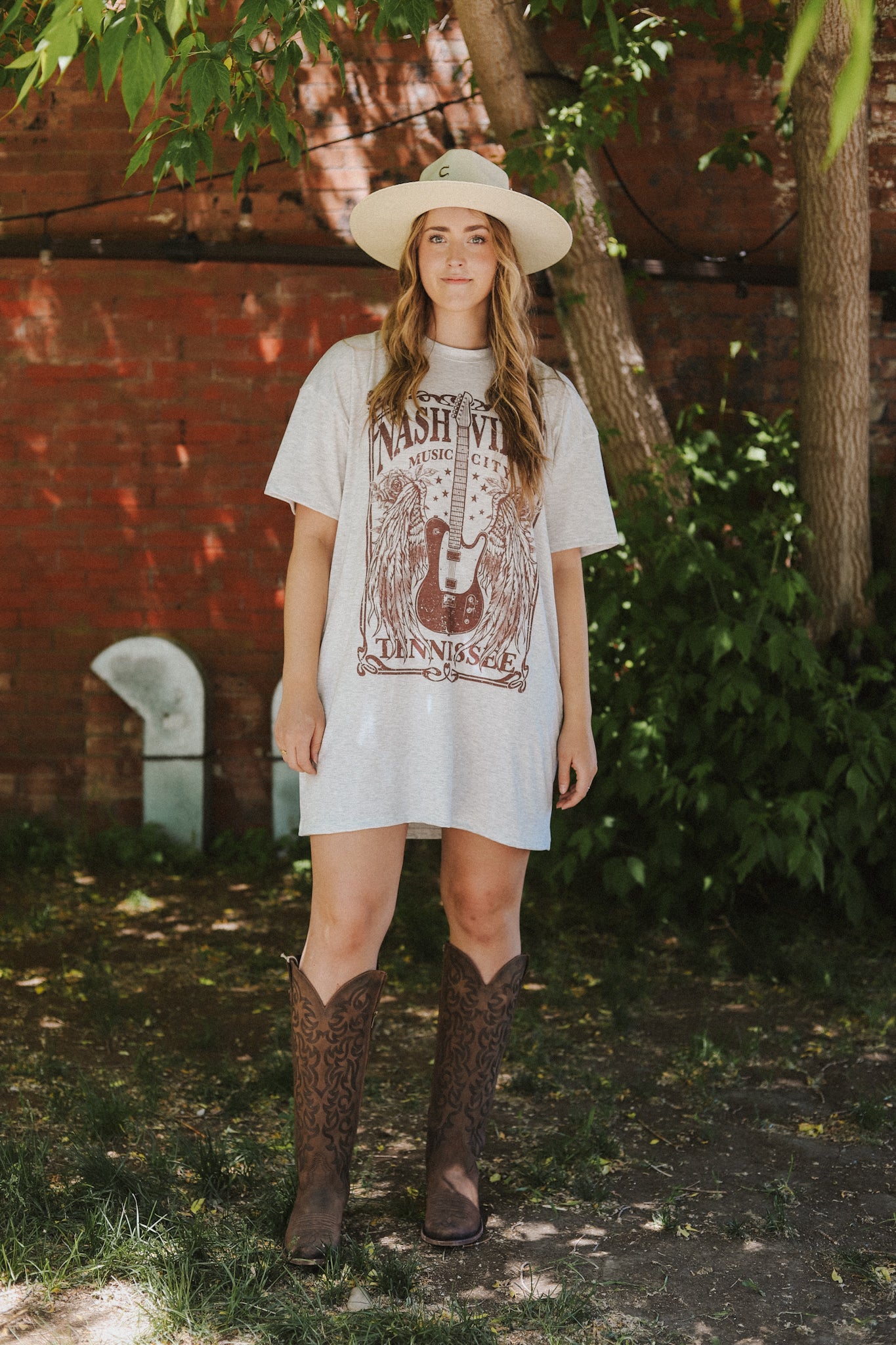 Regular price $75.95 CADUnleash your wild west spirit with the Blake Nashville Graphic Tee Dress. With its unique graphic design featuring cowboy boots and guitars, this dress is perfect for country music lovers. The soft and comfortable fabric will make you want to wear it all day long. Get ready to hit the Nashville streets in style.