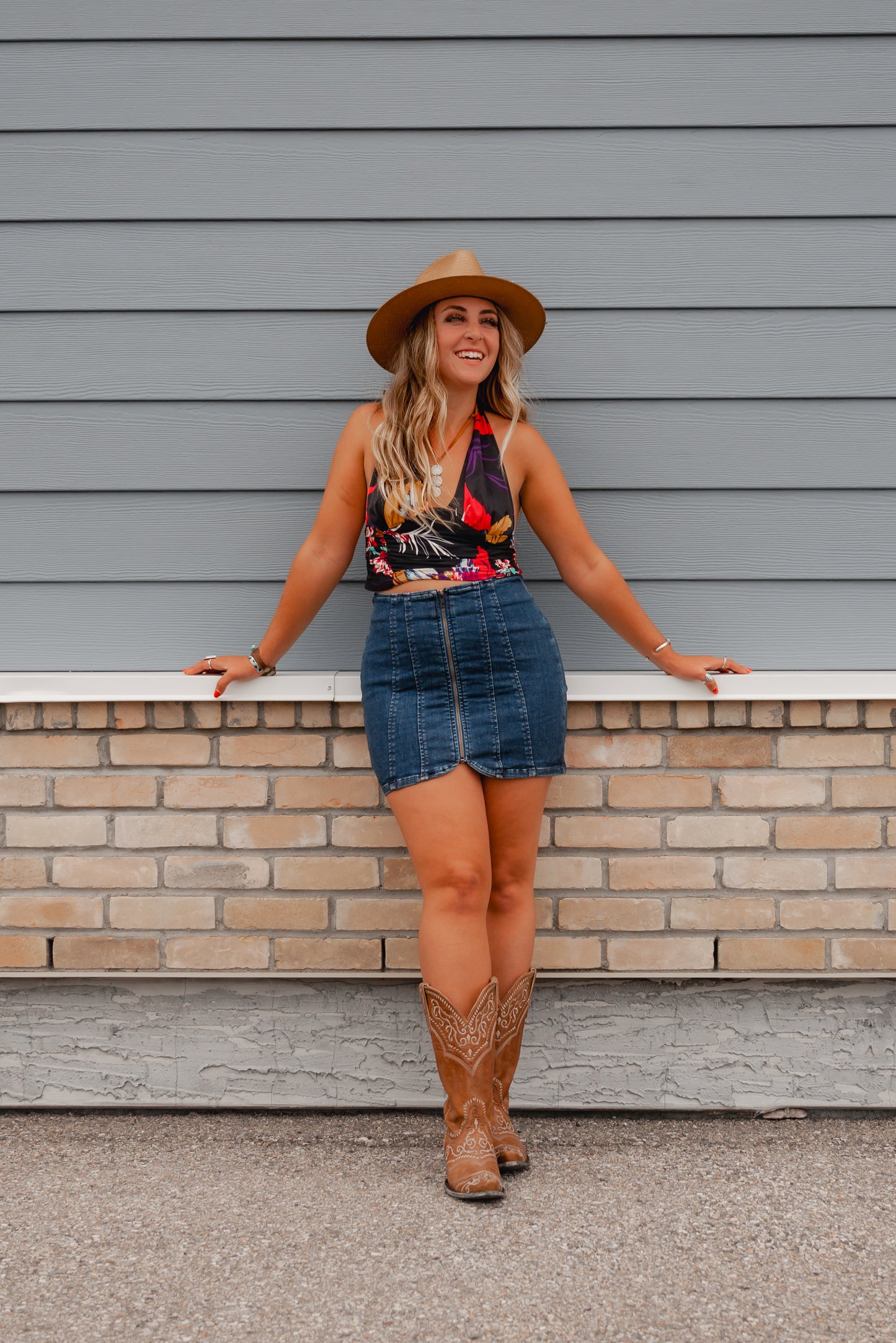 Forever timeless in a cropped, halter-style design, this stand-out top features tropical floral printing throughput for an added special touch.