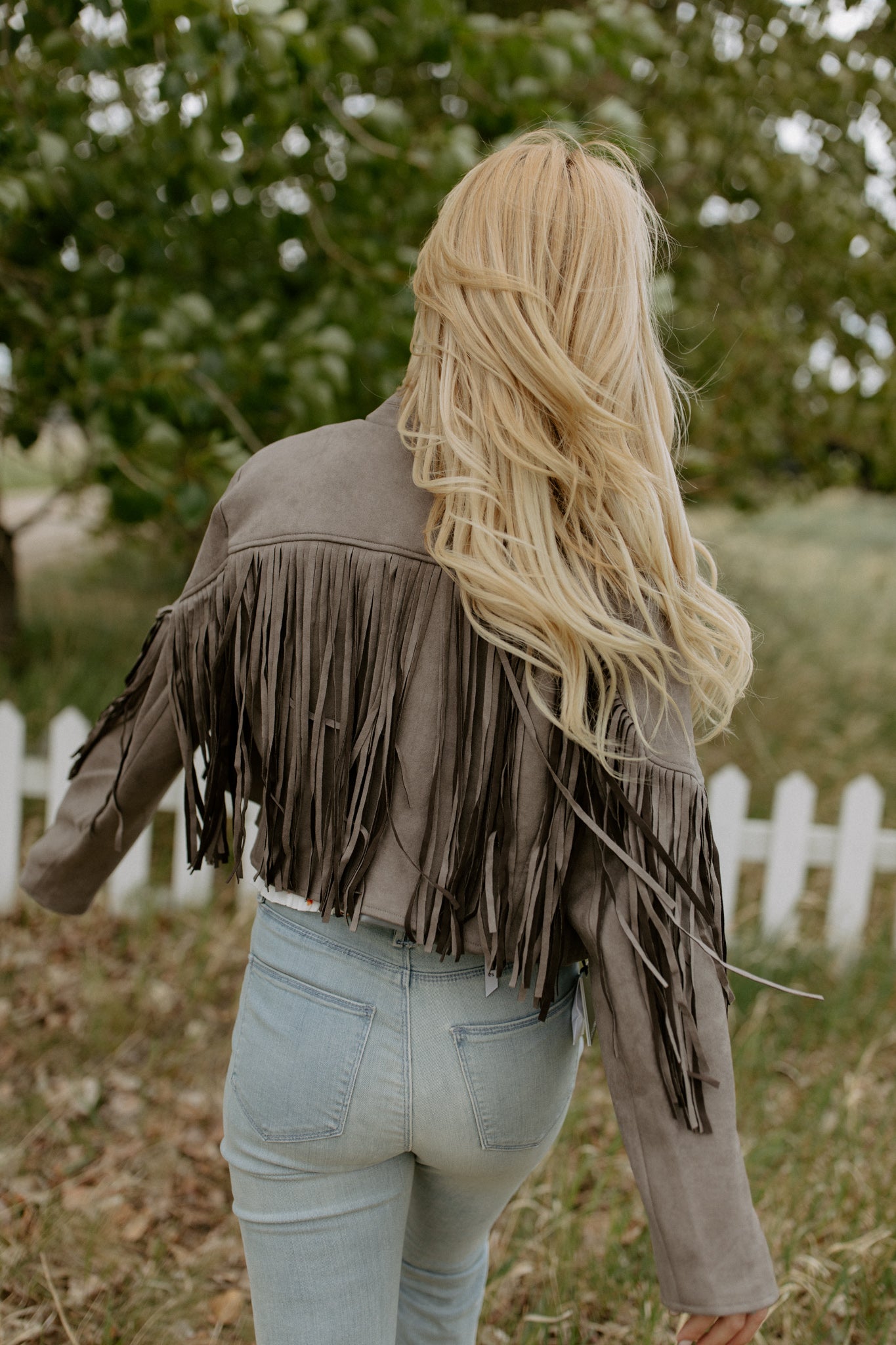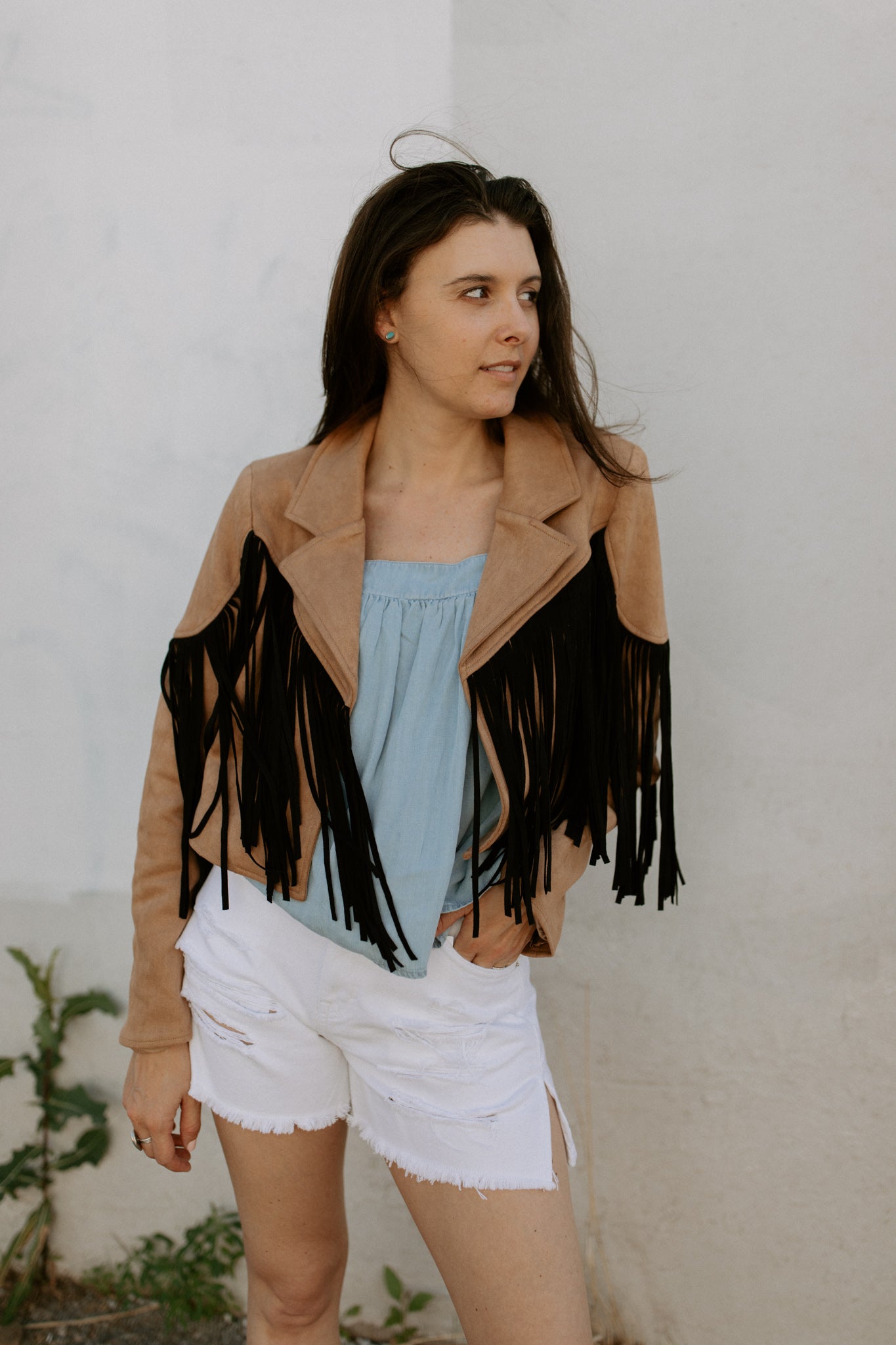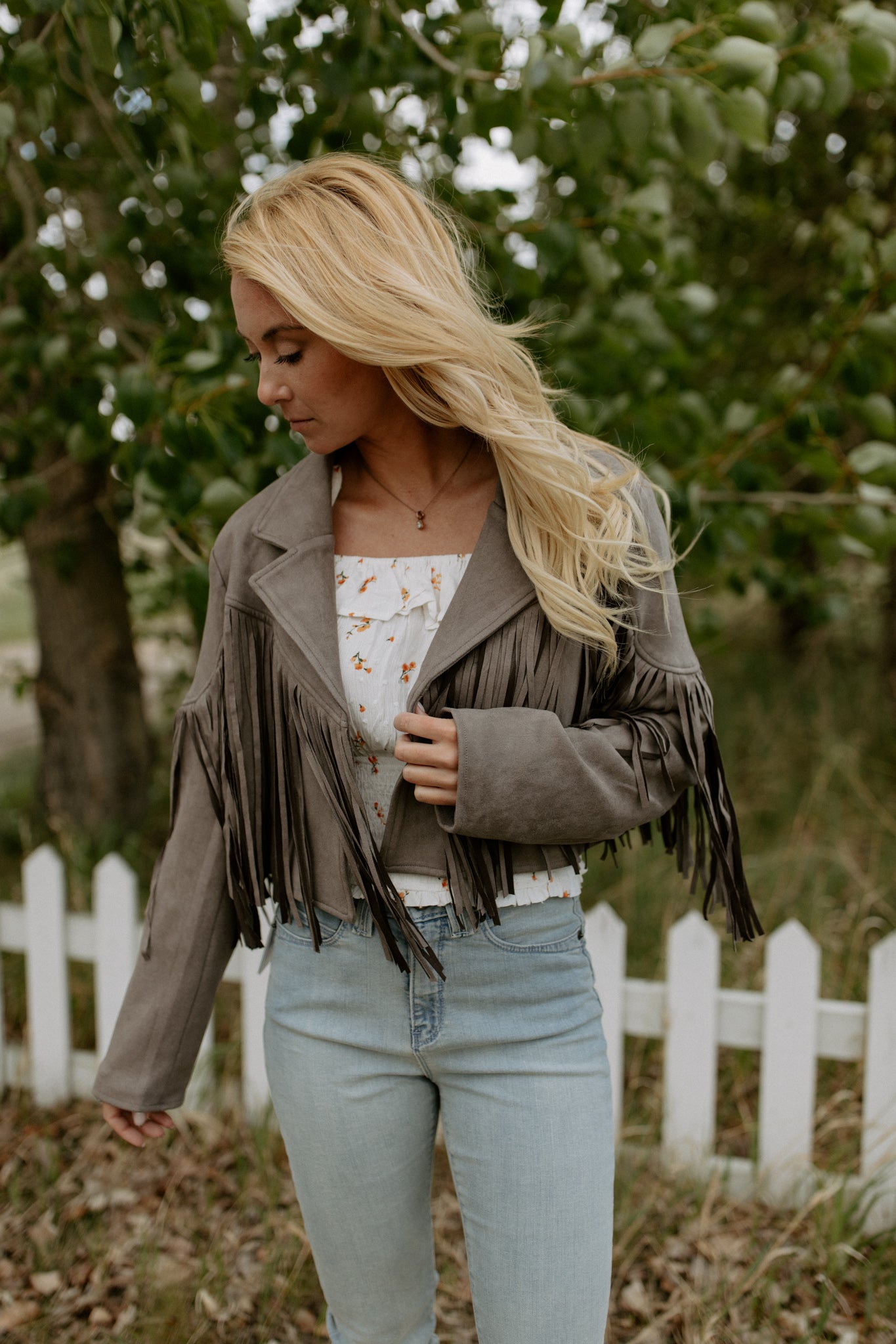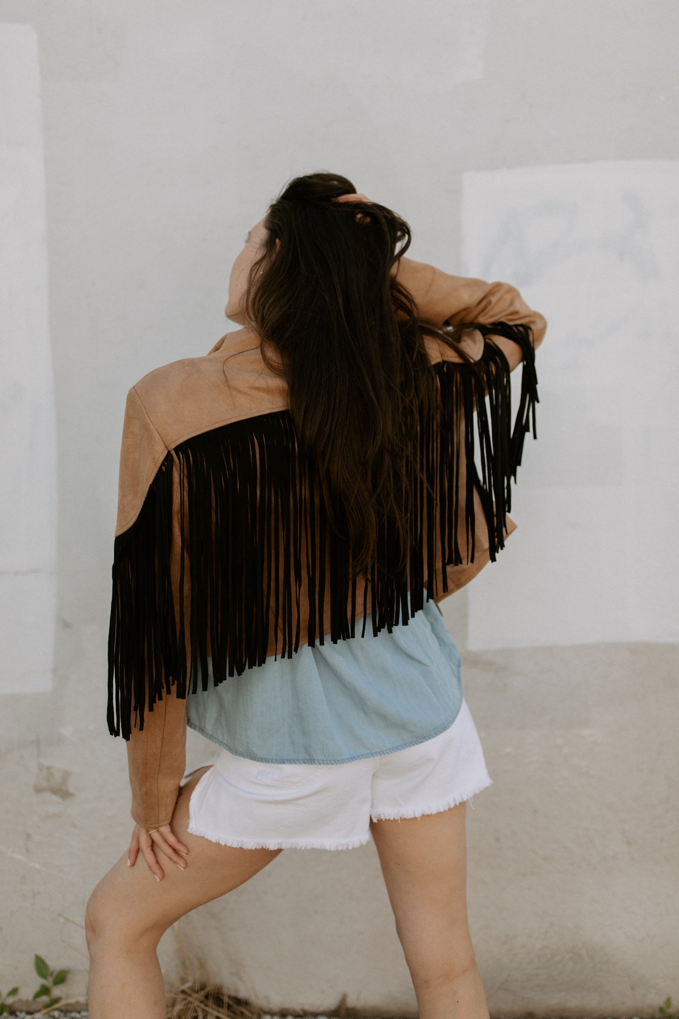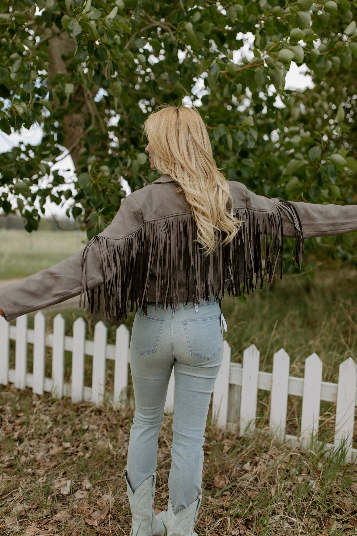 Let's go girls! The jacket everyone wants - for good reason. This faux suede jacket is slightly cropped and is adorned with fringe across the back and along the shoulders. A modern take on a western jacket!