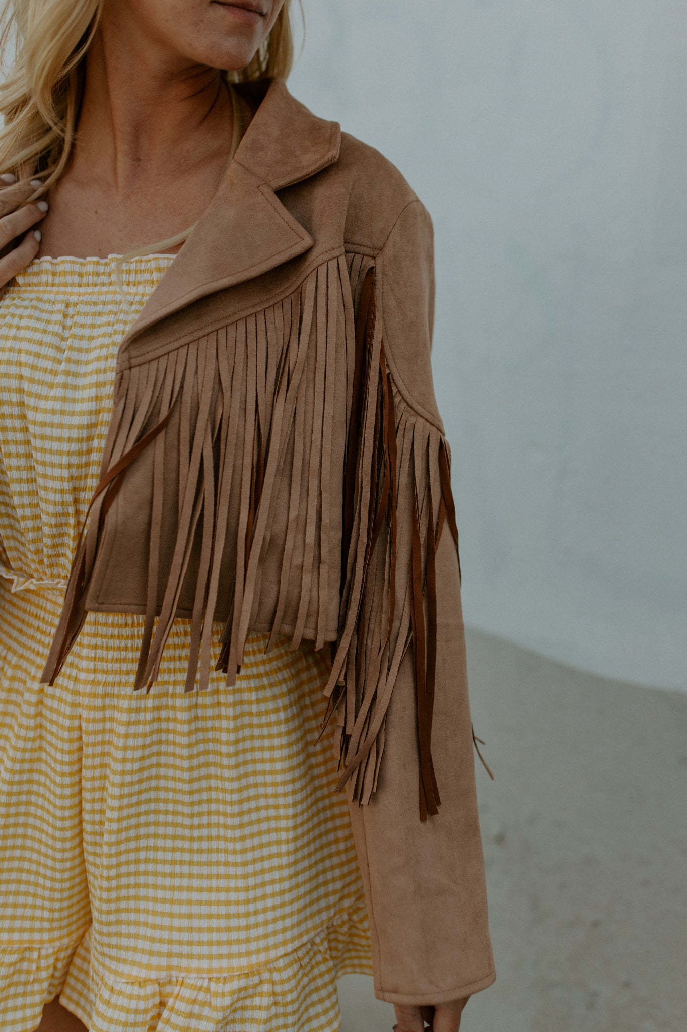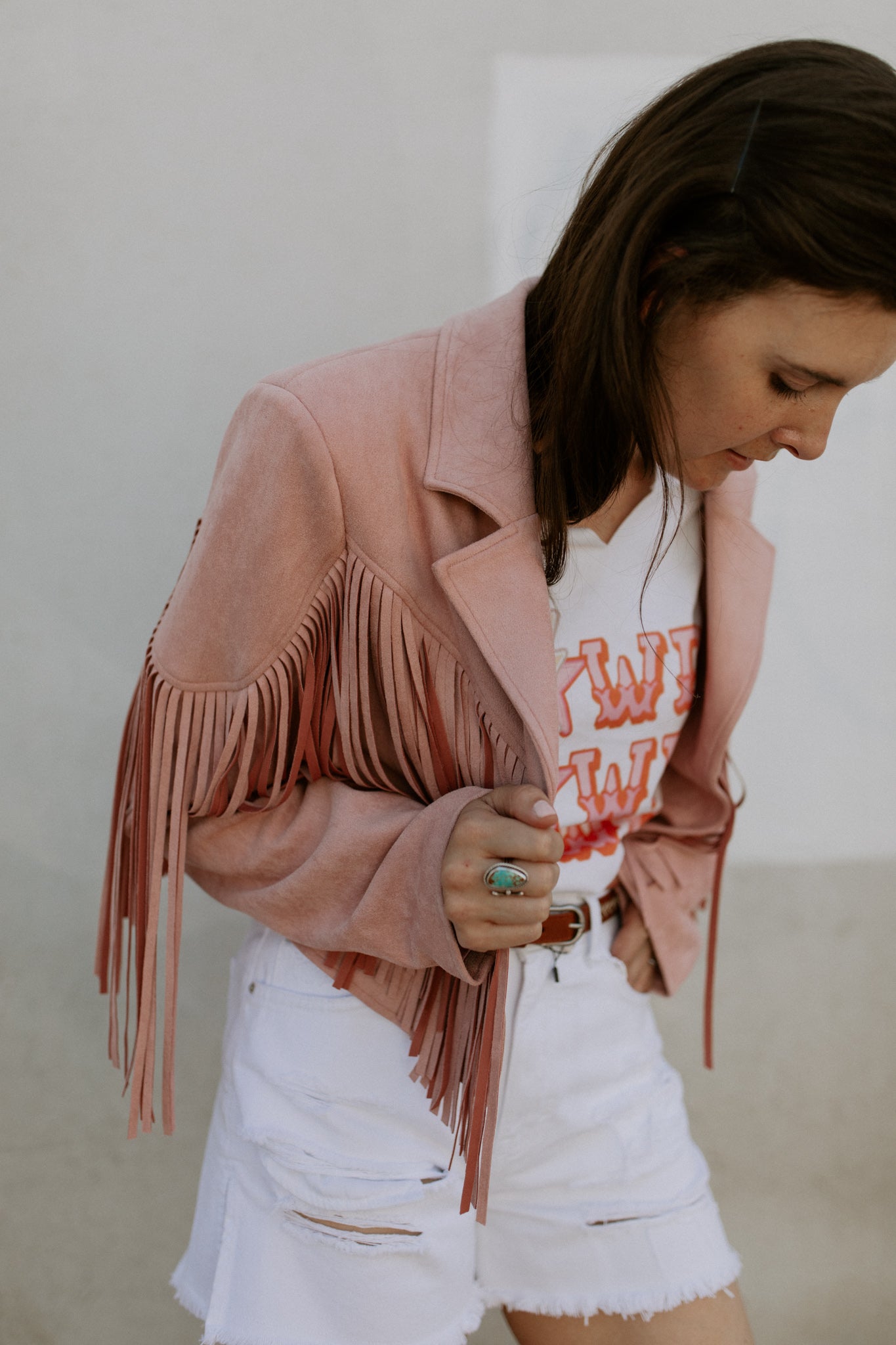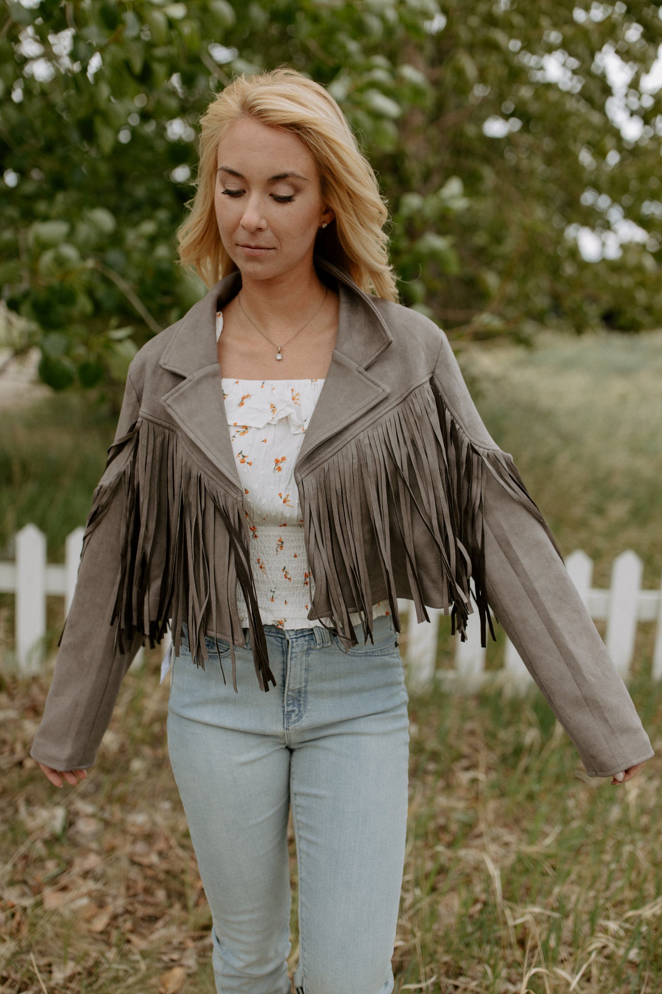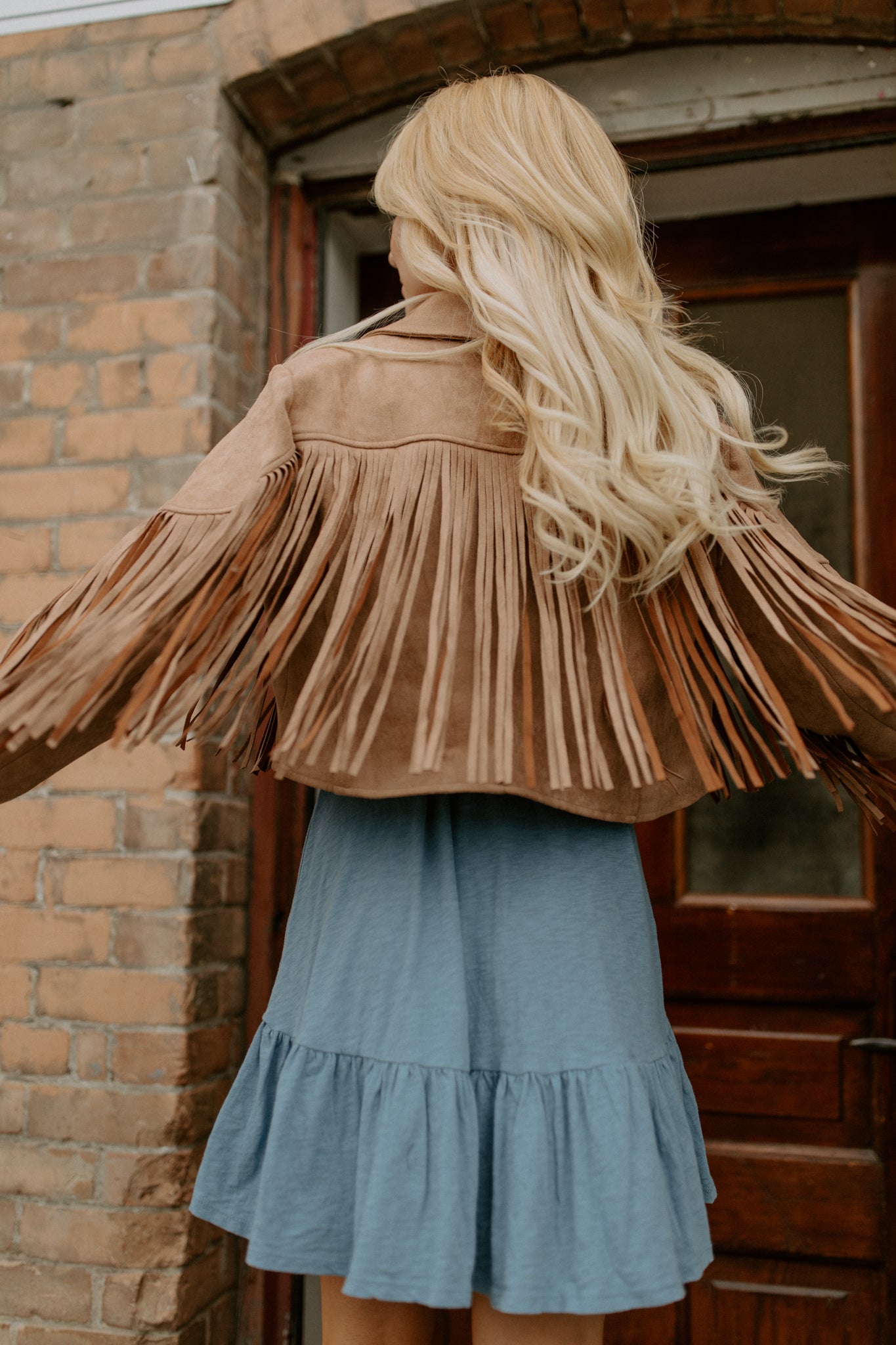 Let's go girls! The jacket everyone wants - for good reason. This faux suede jacket is slightly cropped and is adorned with fringe across the back and along the shoulders. A modern take on a western jacket!