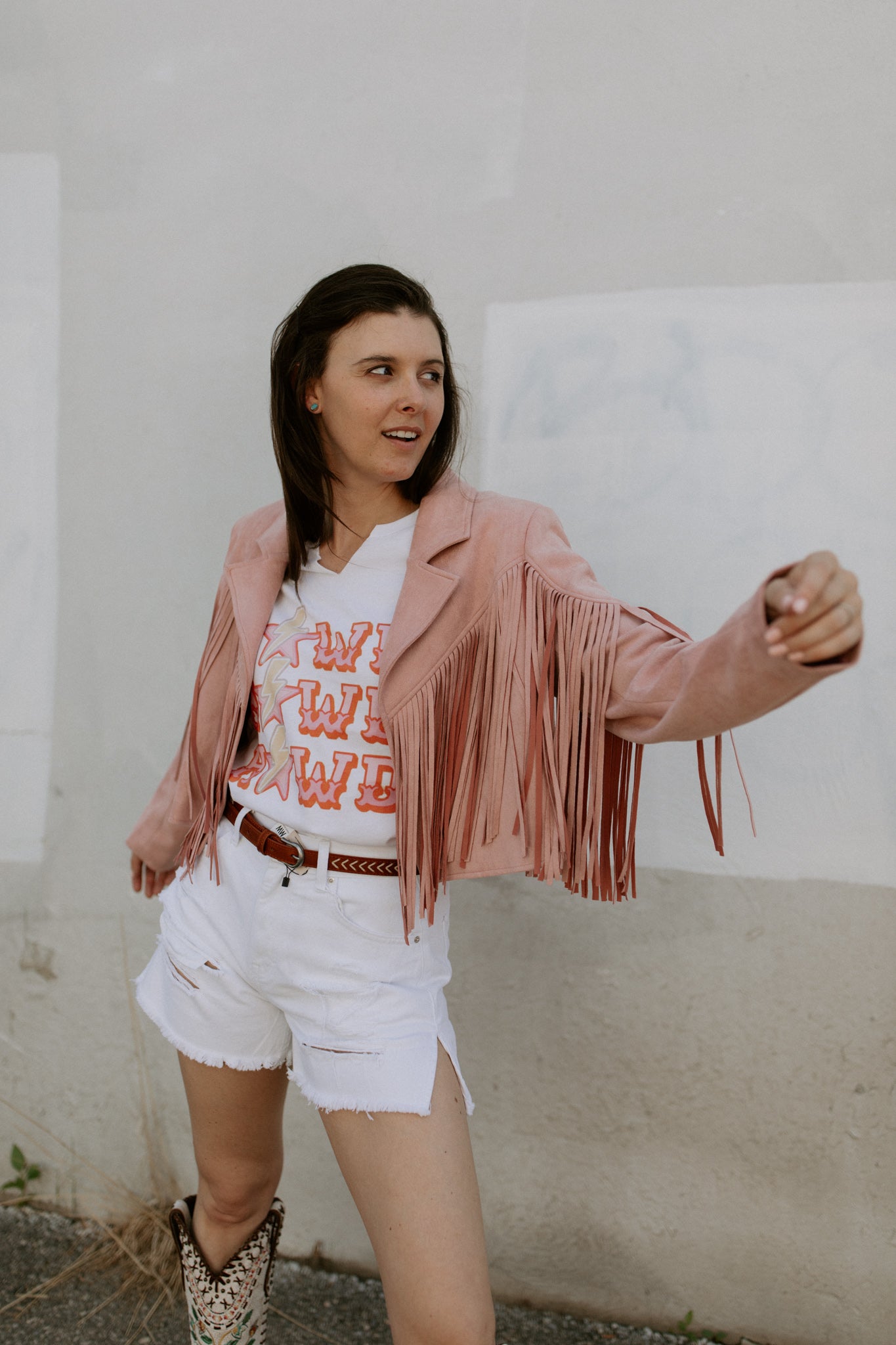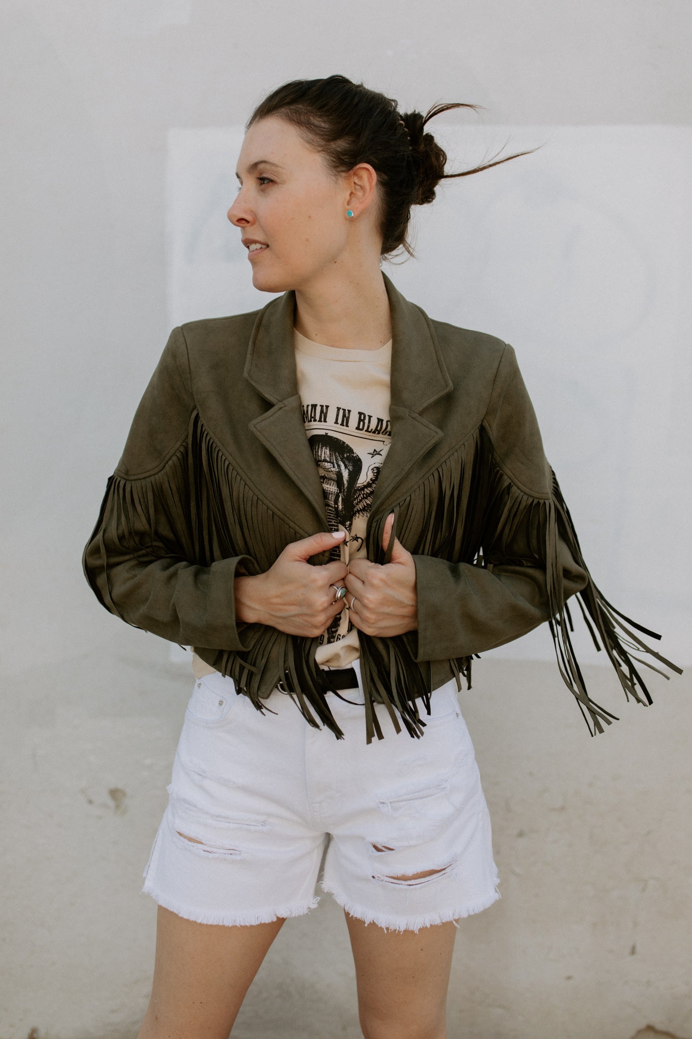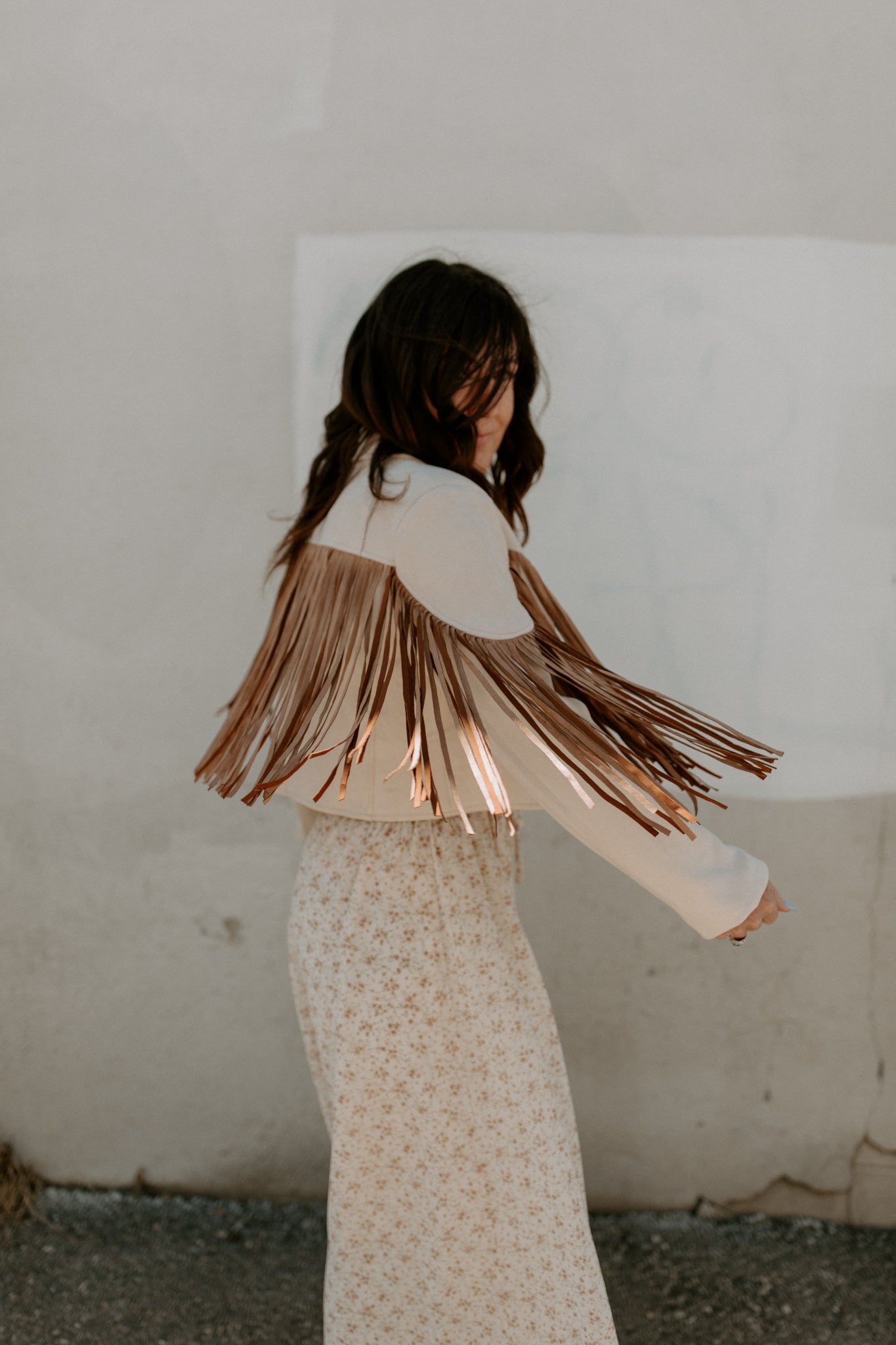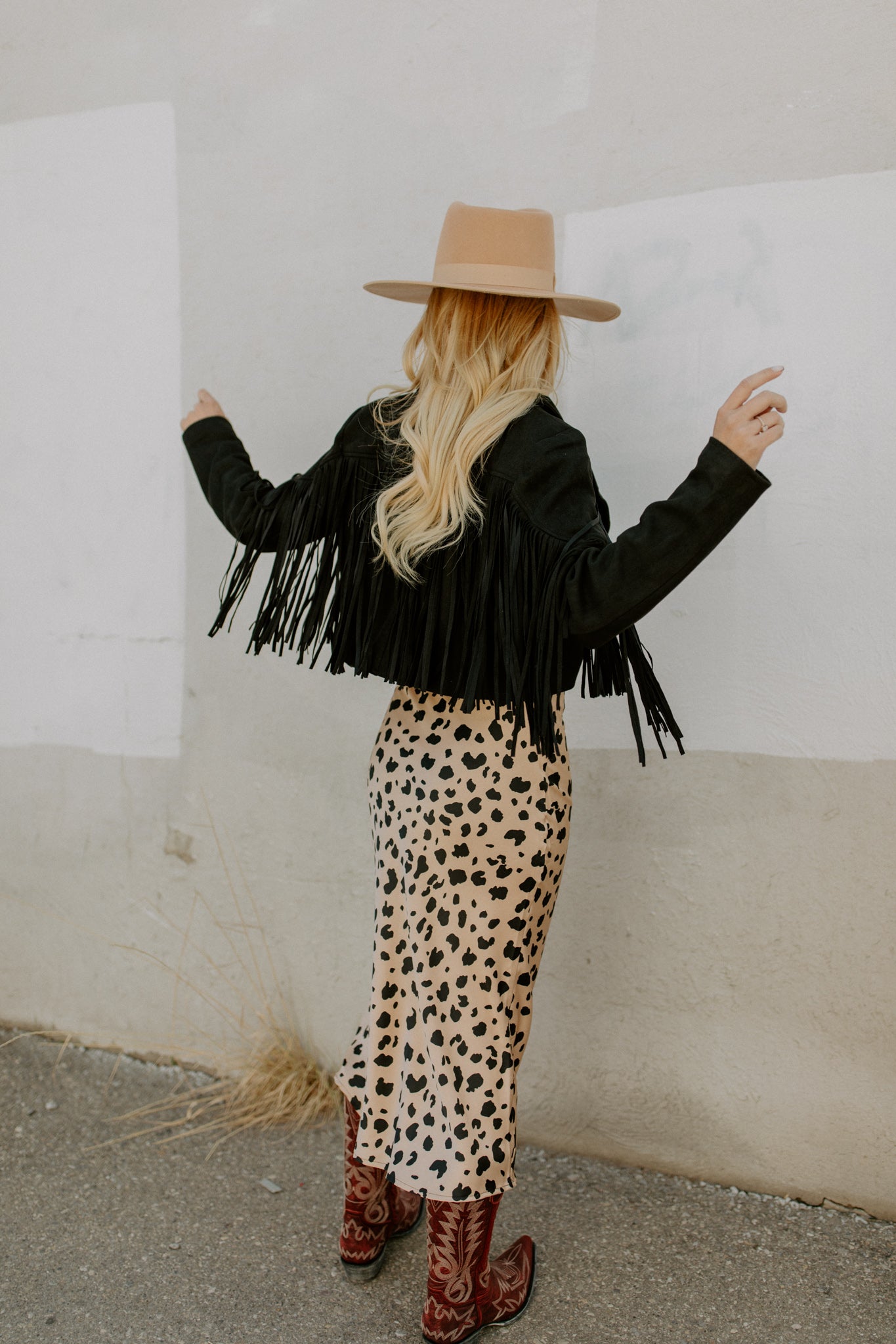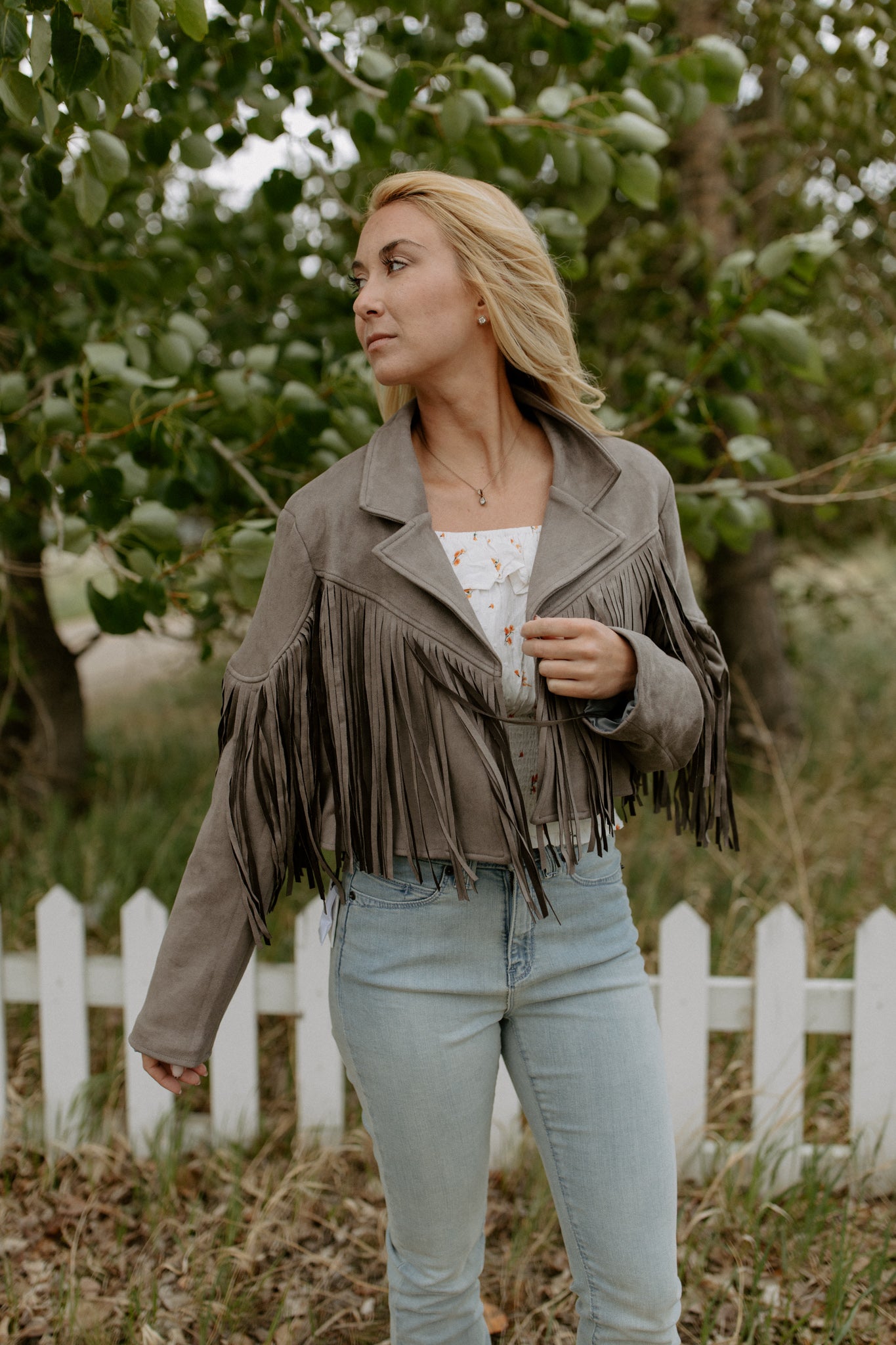 Let's go girls! The jacket everyone wants - for good reason. This faux suede jacket is slightly cropped and is adorned with fringe across the back and along the shoulders. A modern take on a western jacket!