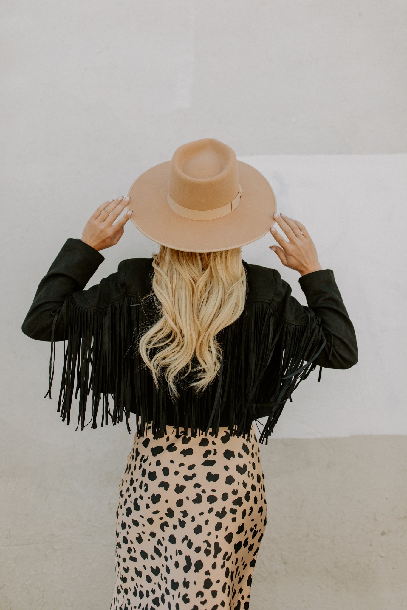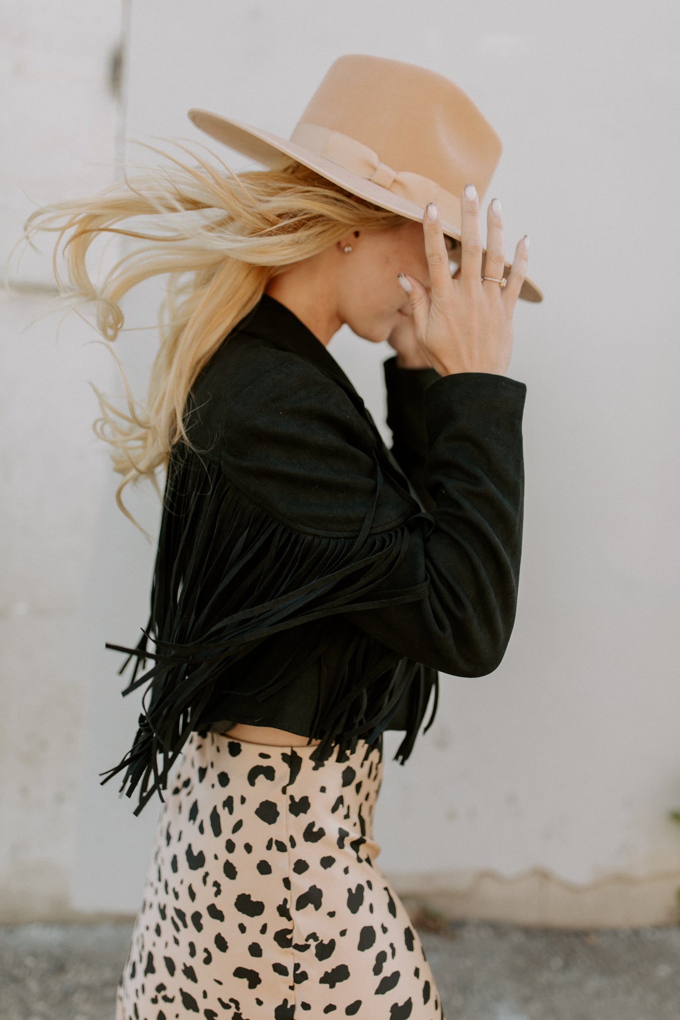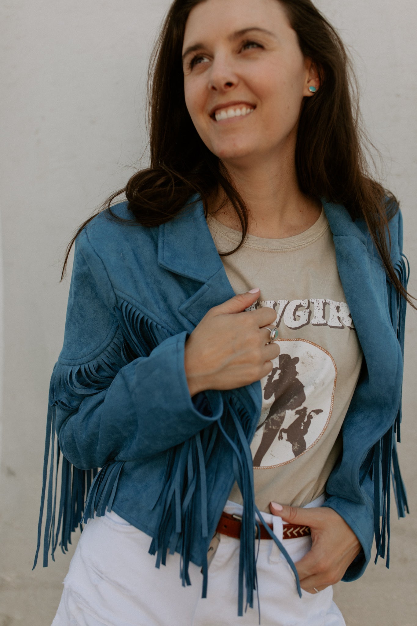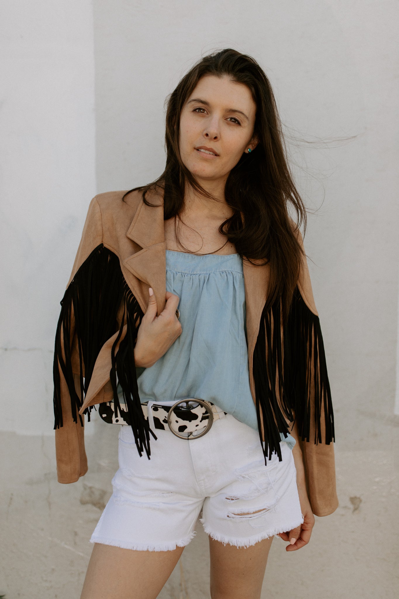 Let's go girls! The jacket everyone wants - for good reason. This faux suede jacket is slightly cropped and is adorned with fringe across the back and along the shoulders. A modern take on a western jacket!