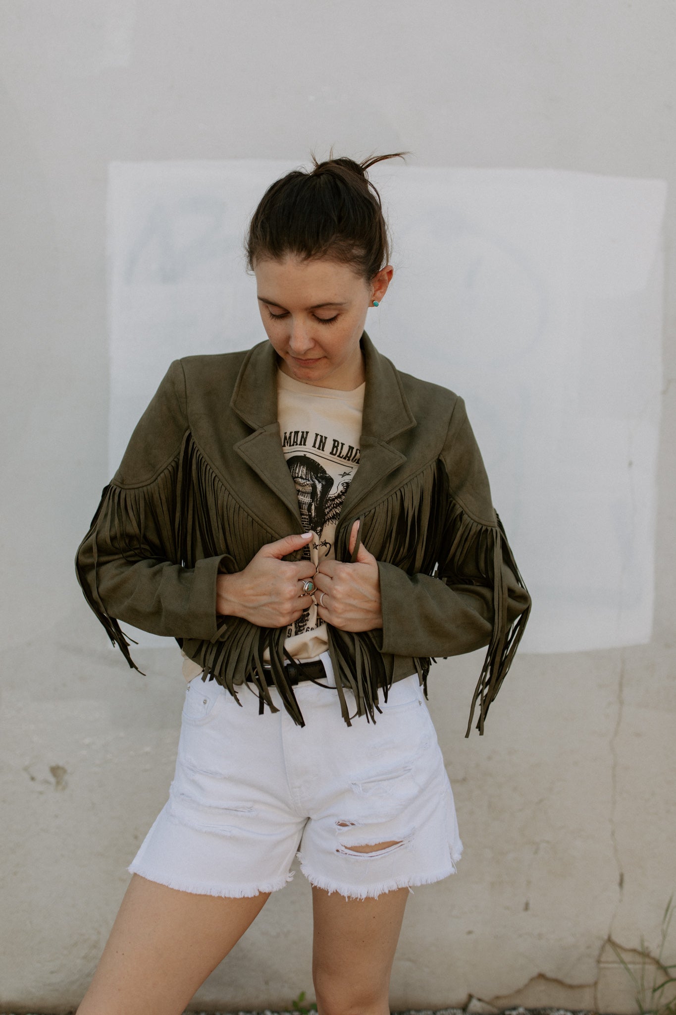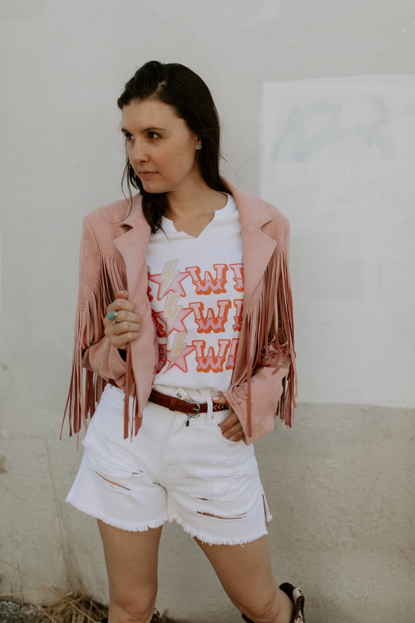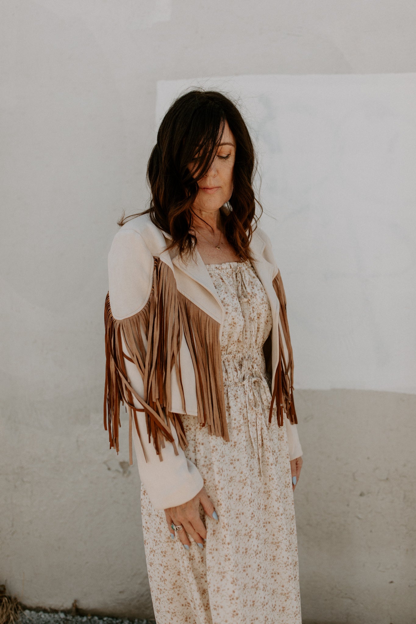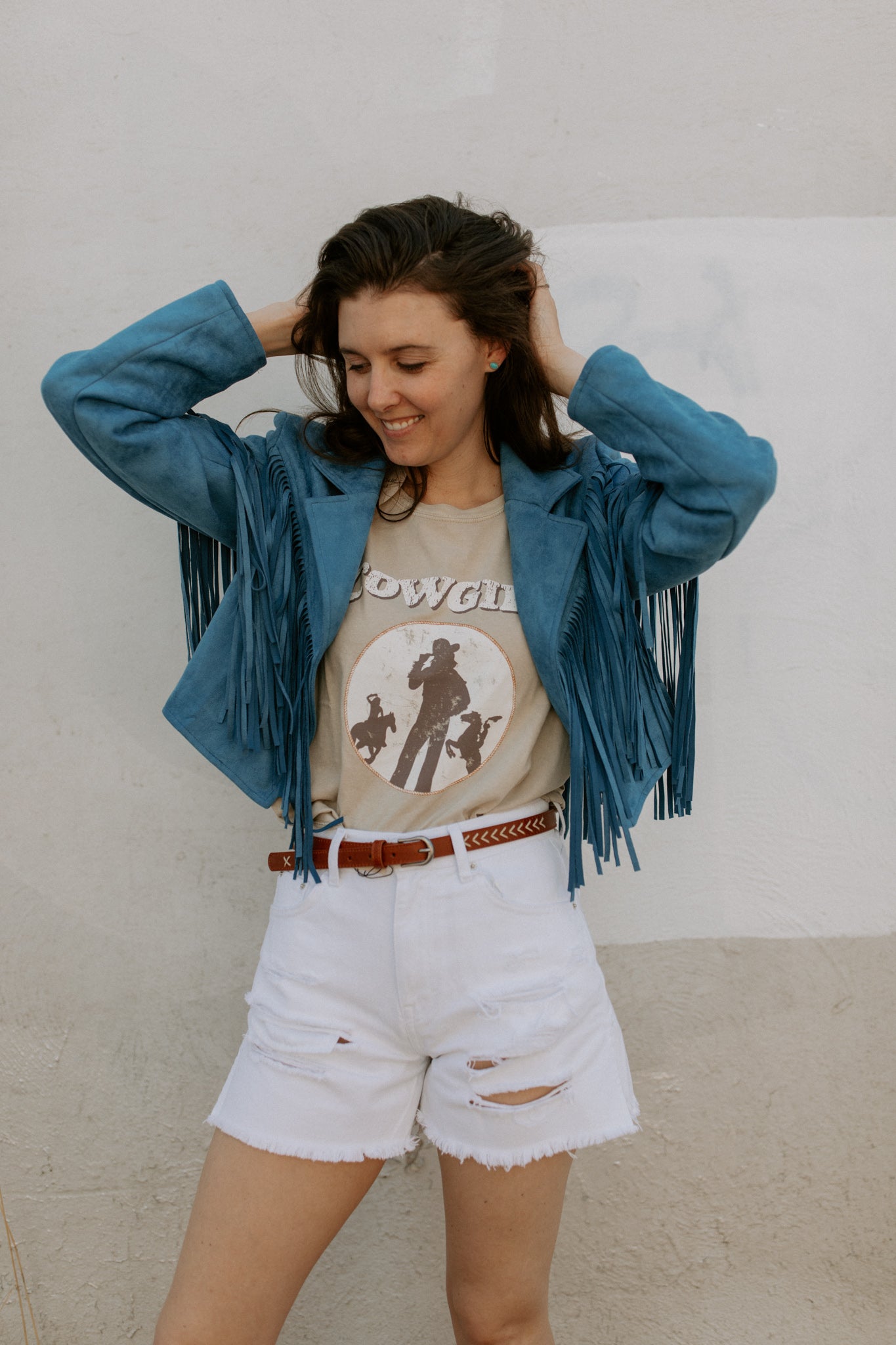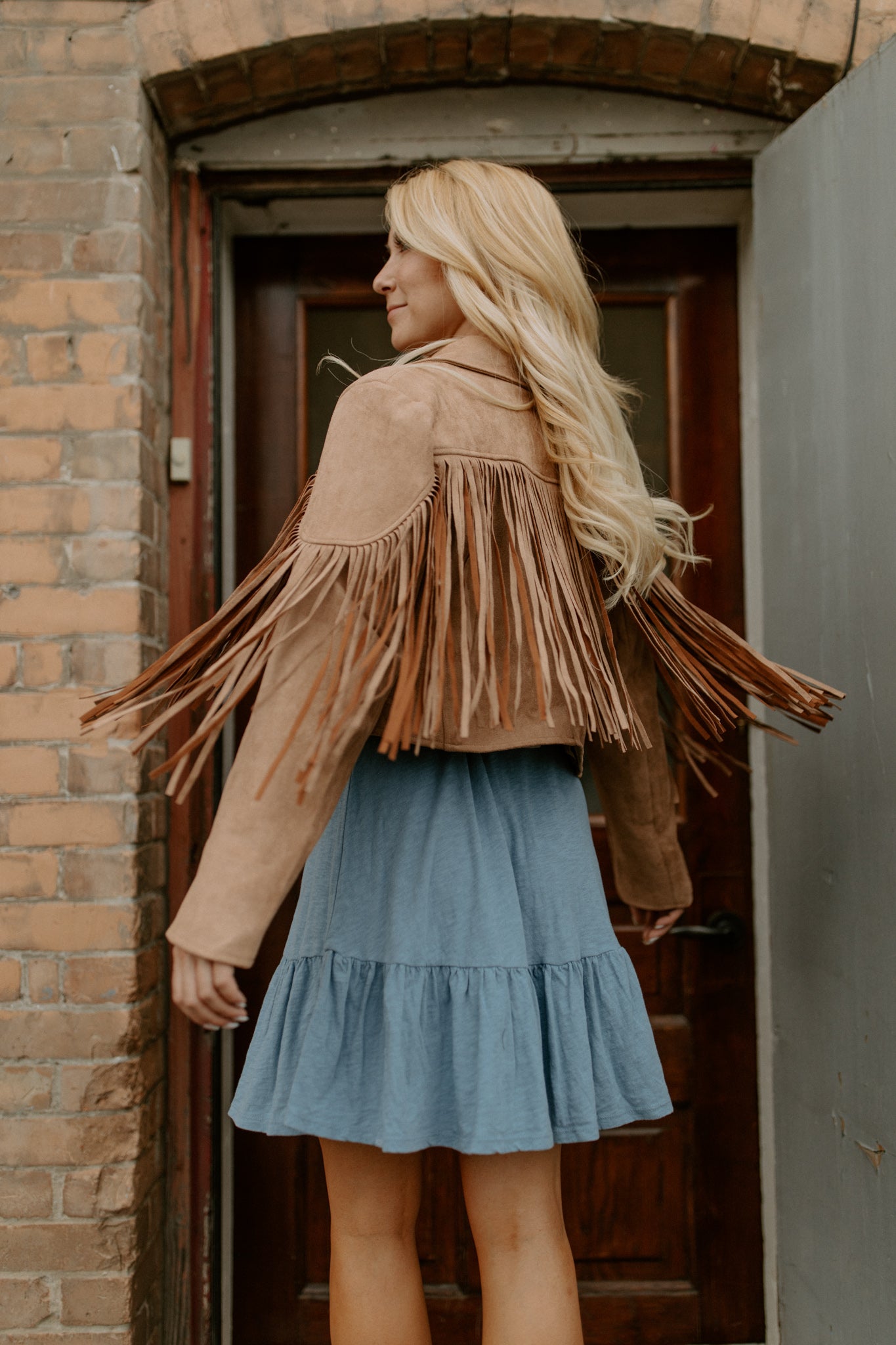 Let's go girls! The jacket everyone wants - for good reason. This faux suede jacket is slightly cropped and is adorned with fringe across the back and along the shoulders. A modern take on a western jacket!