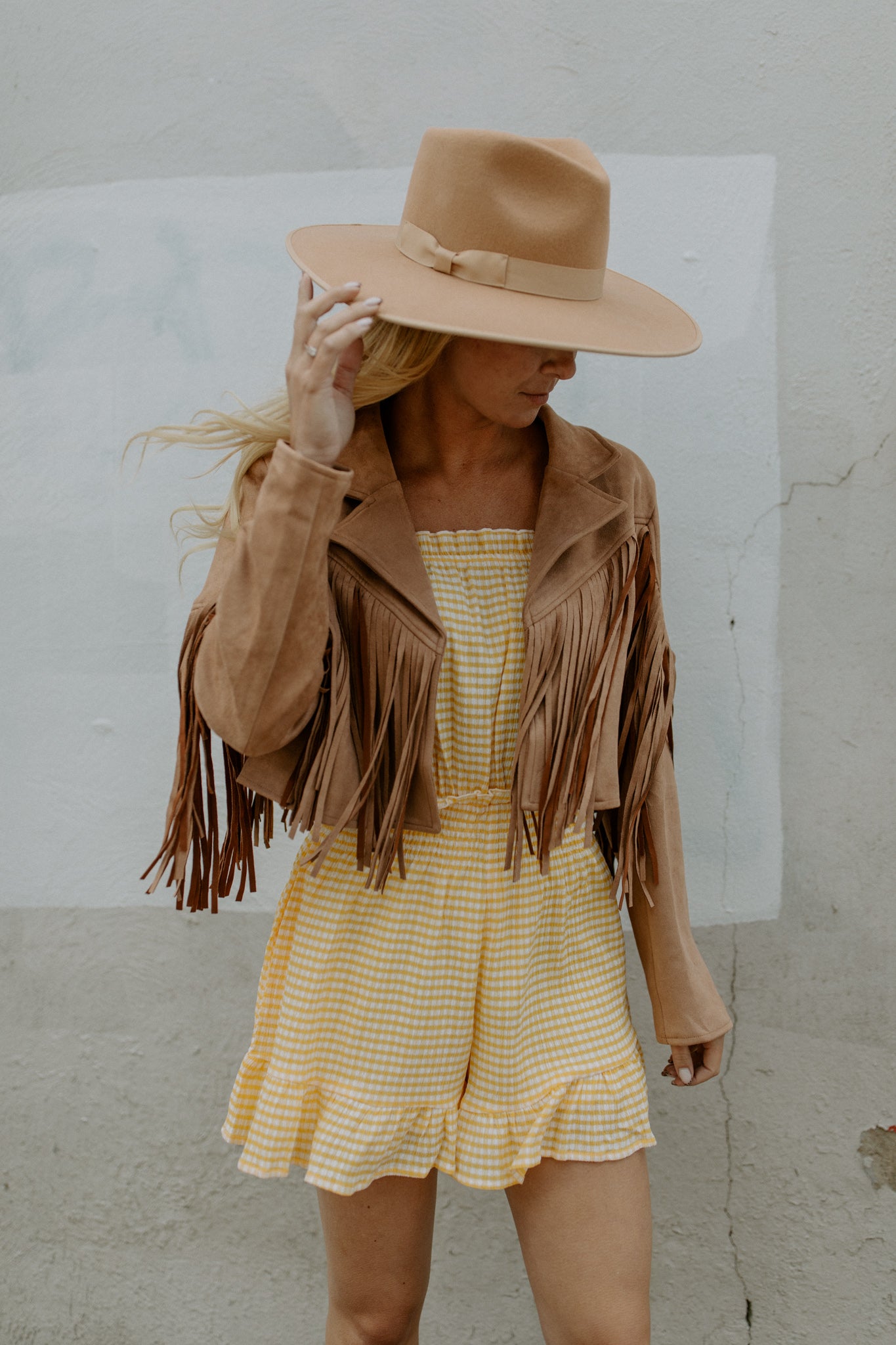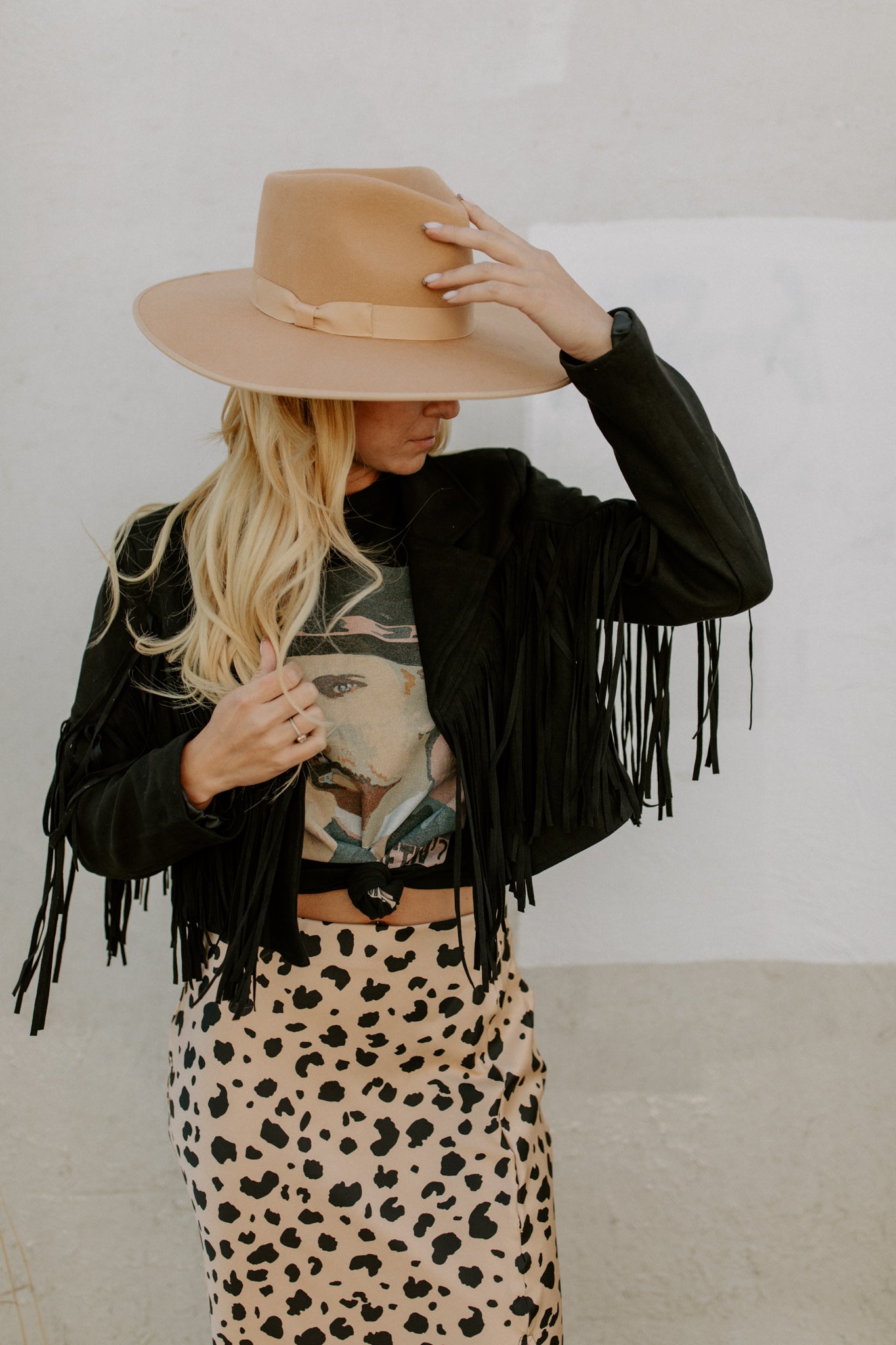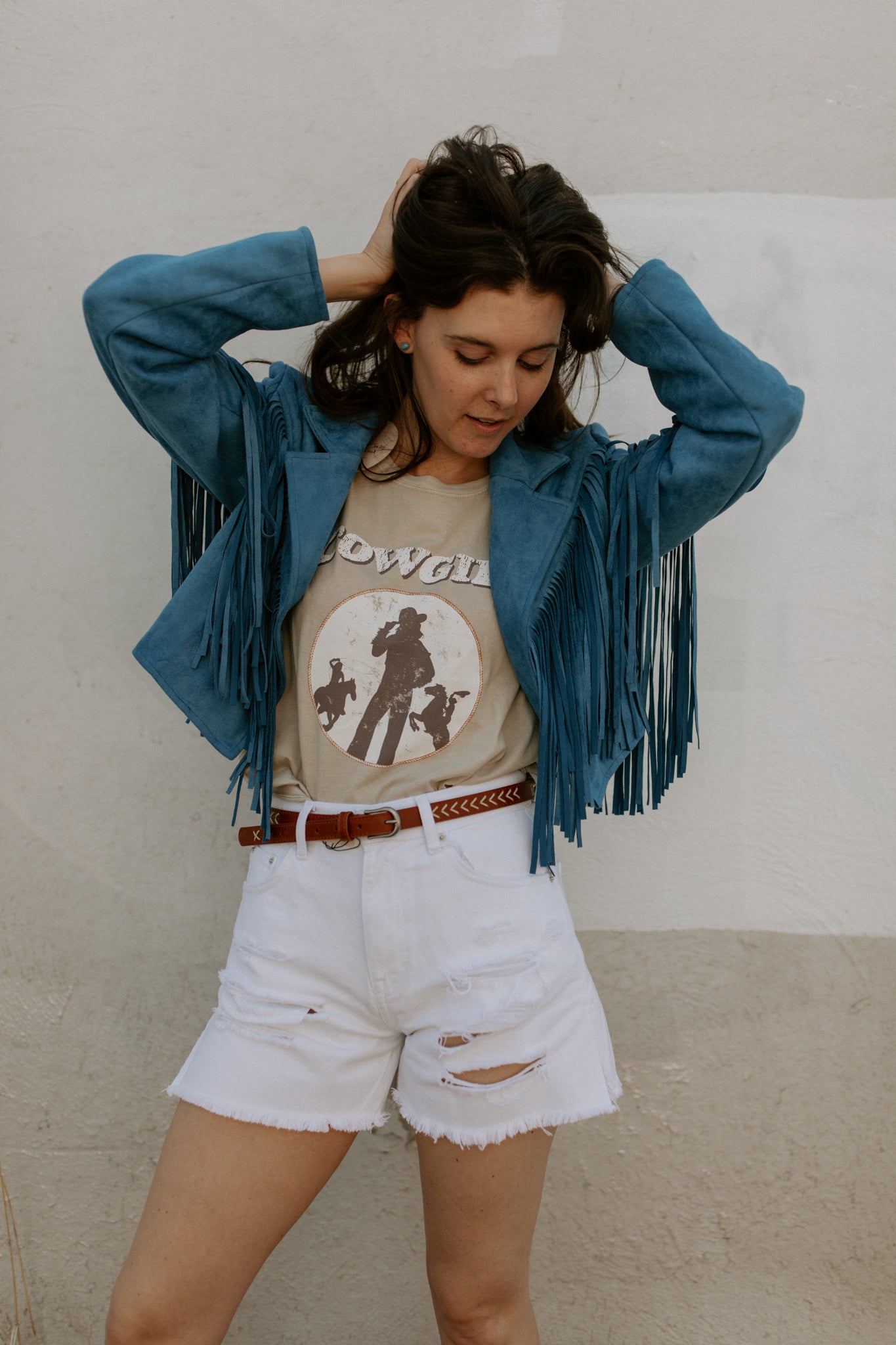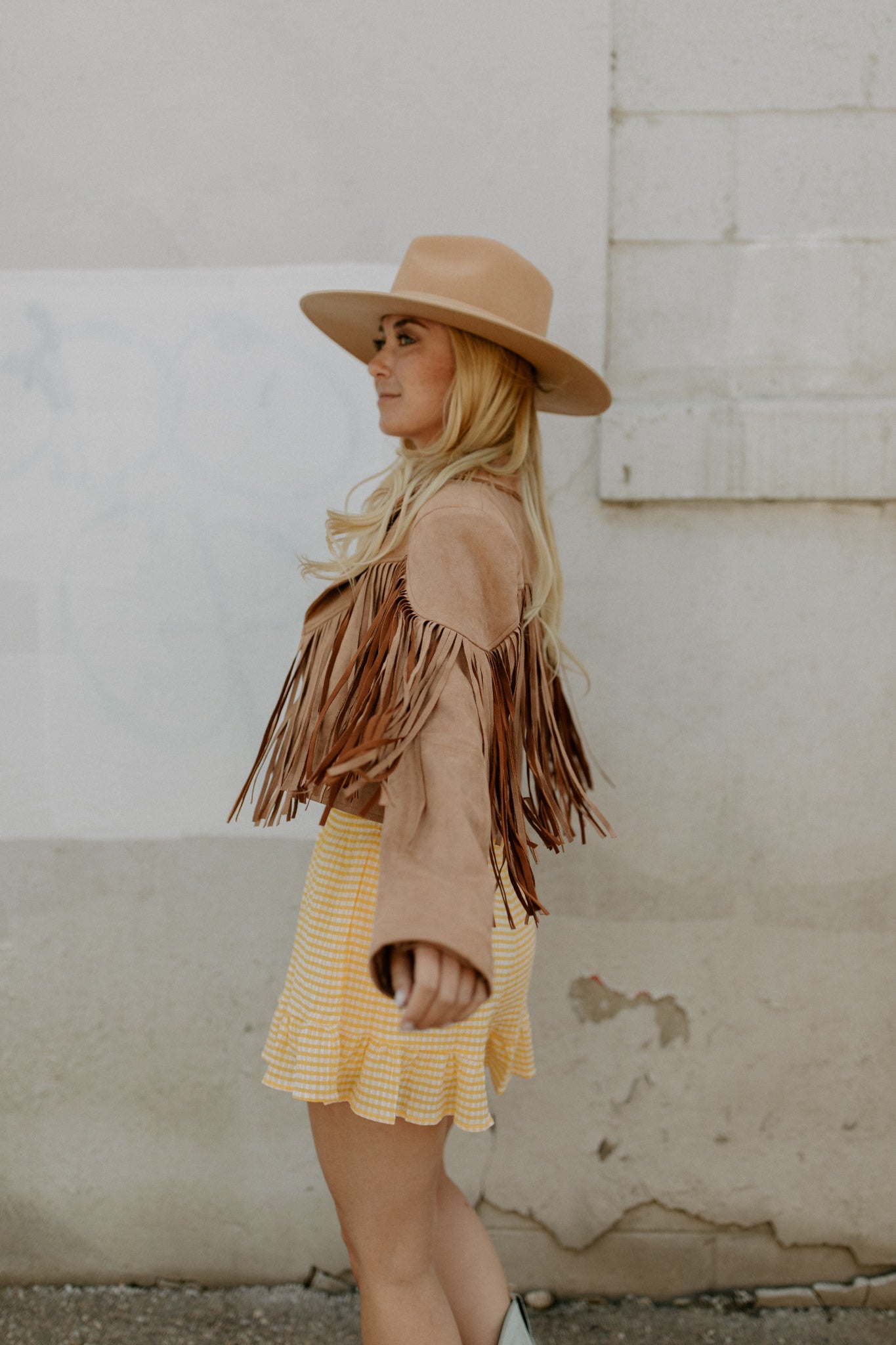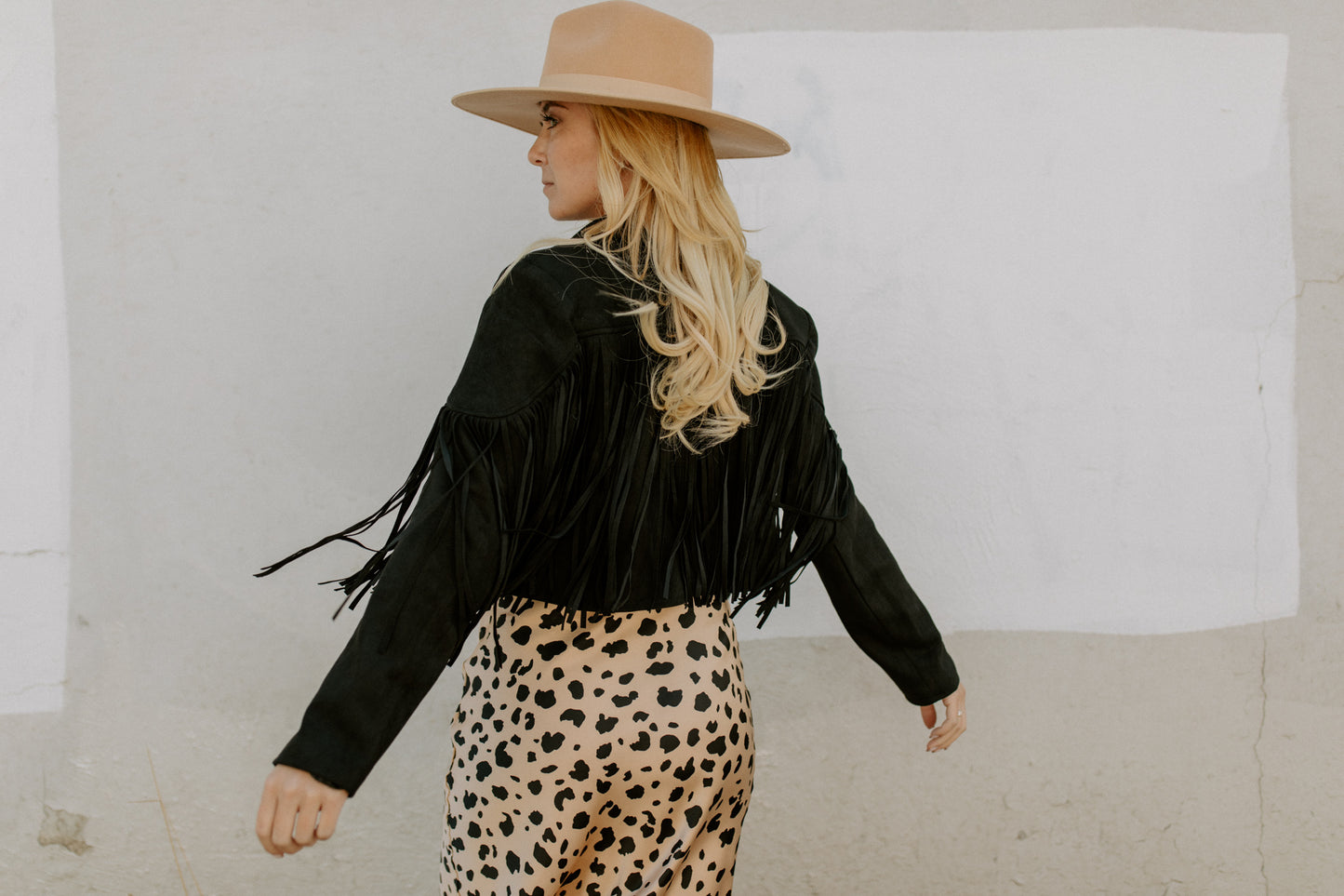 Let's go girls! The jacket everyone wants - for good reason. This faux suede jacket is slightly cropped and is adorned with fringe across the back and along the shoulders. A modern take on a western jacket!