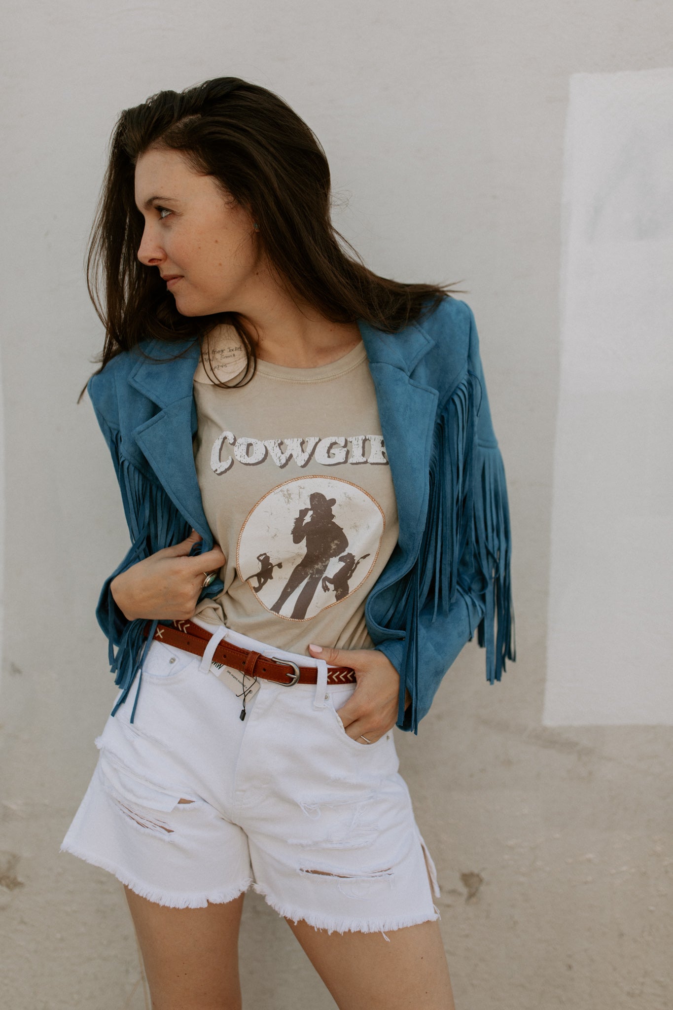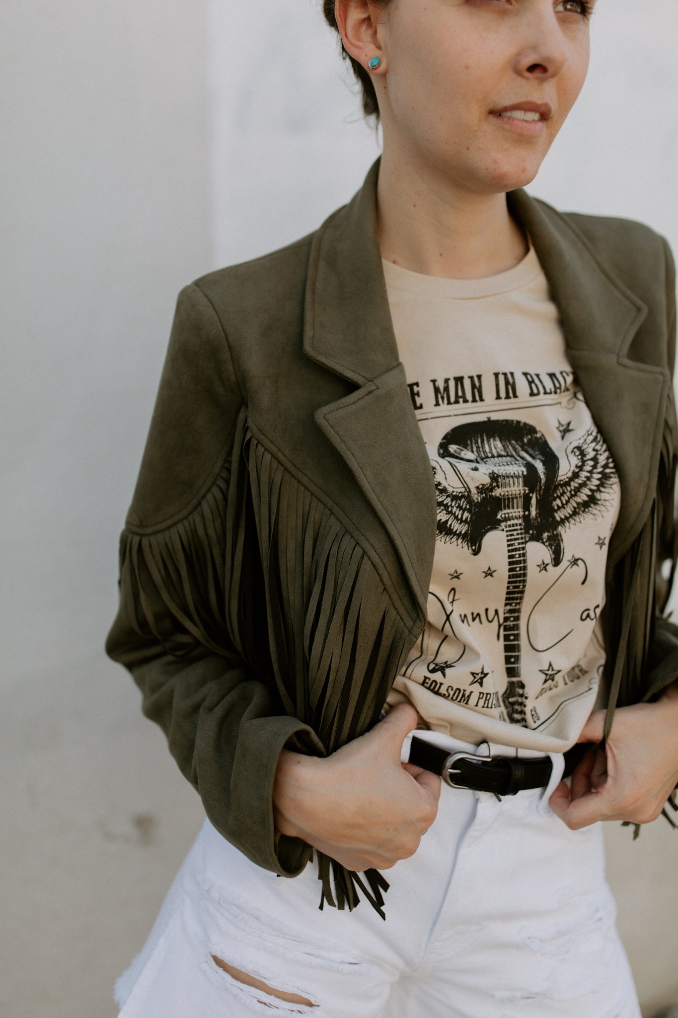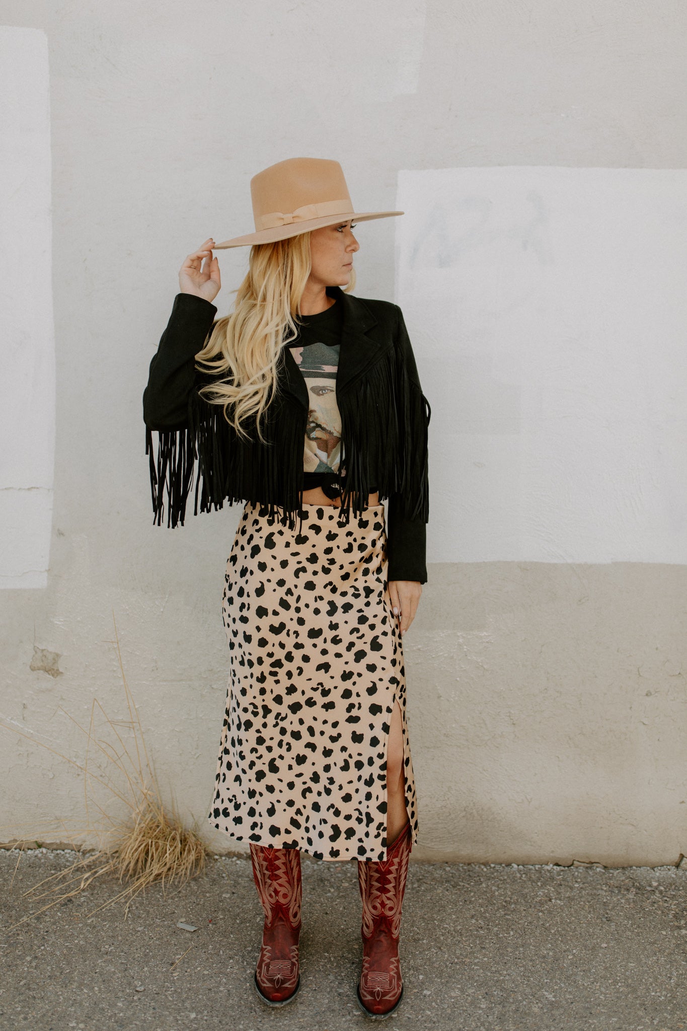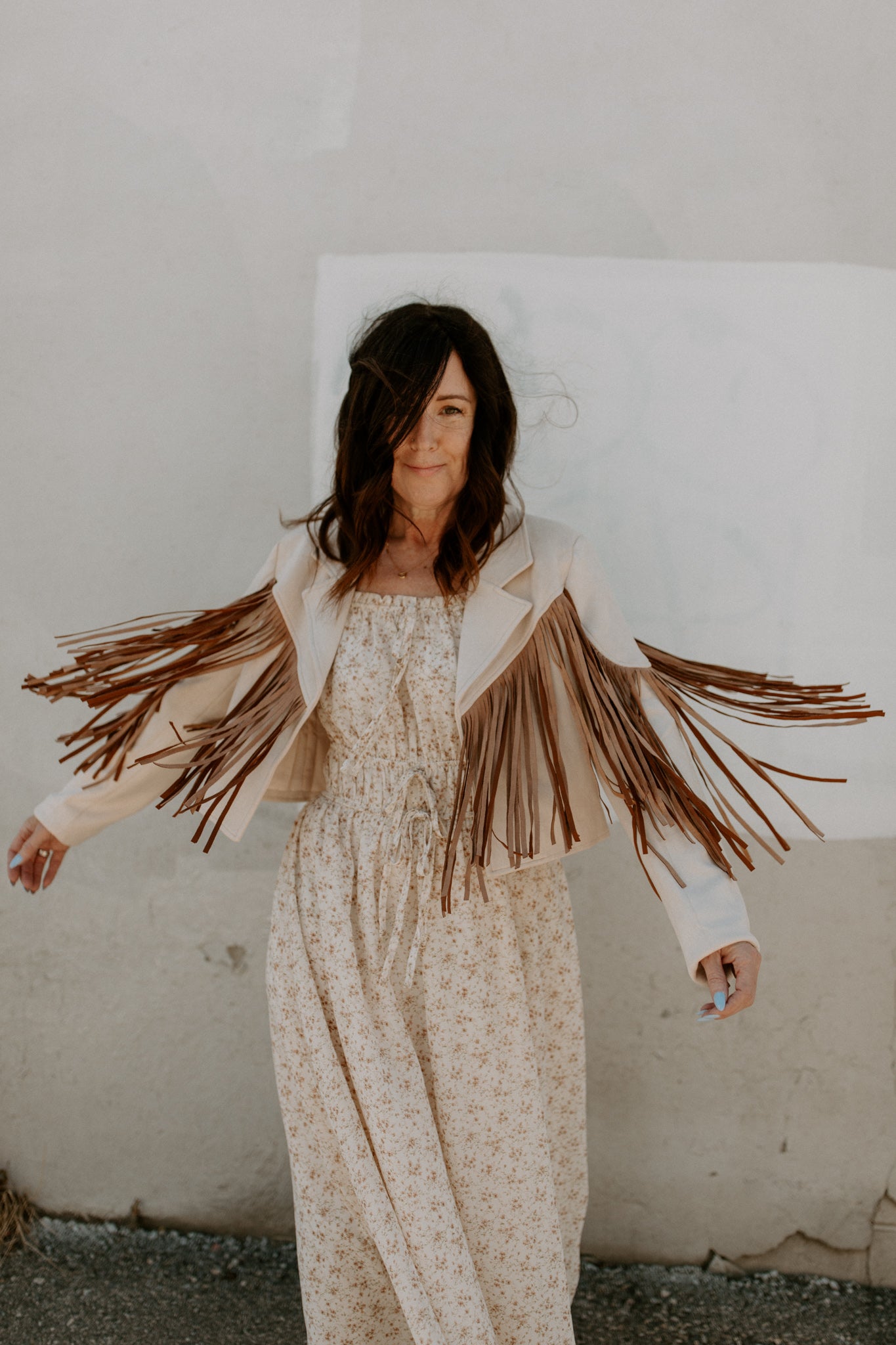 Let's go girls! The jacket everyone wants - for good reason. This faux suede jacket is slightly cropped and is adorned with fringe across the back and along the shoulders. A modern take on a western jacket!