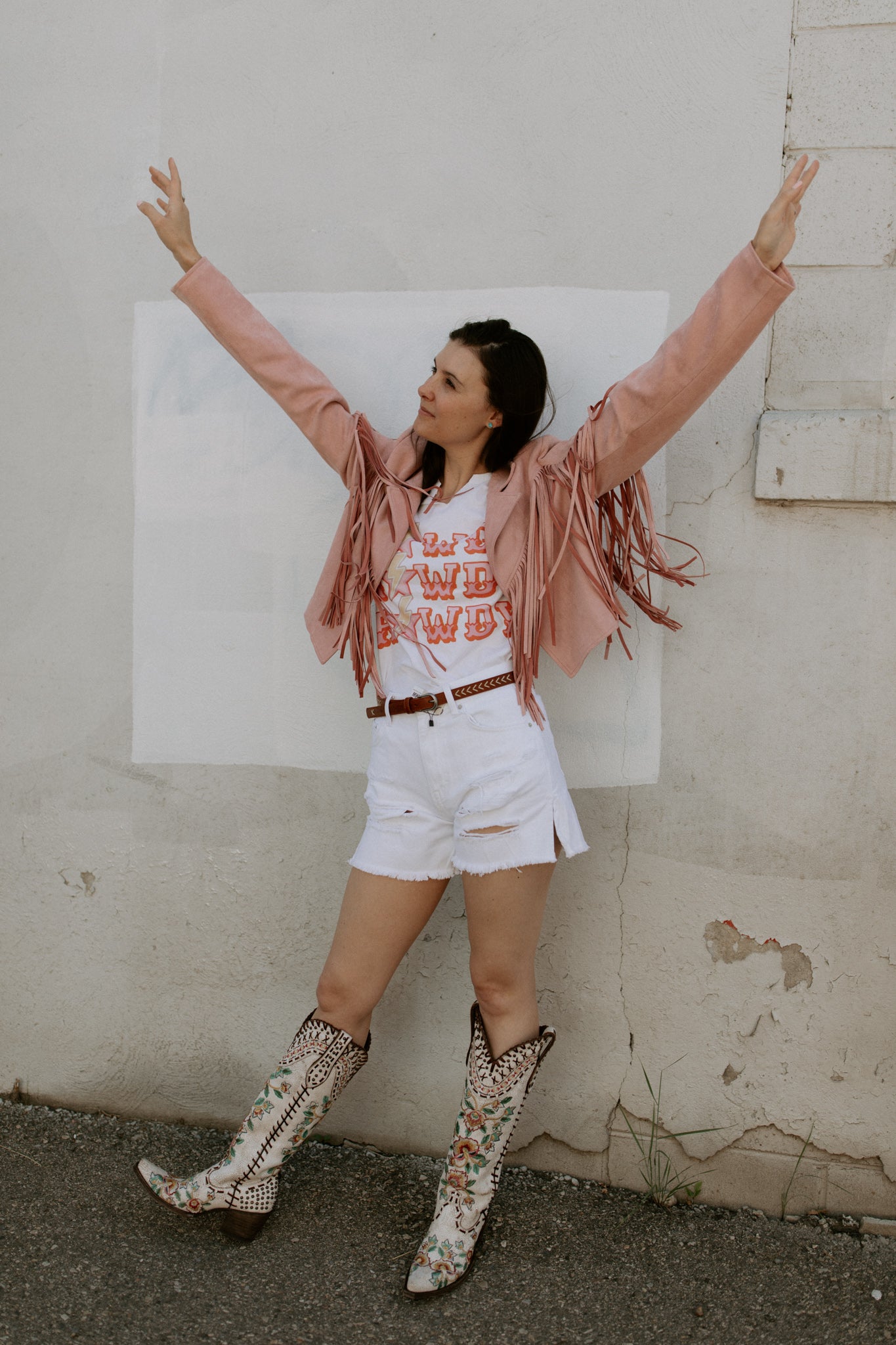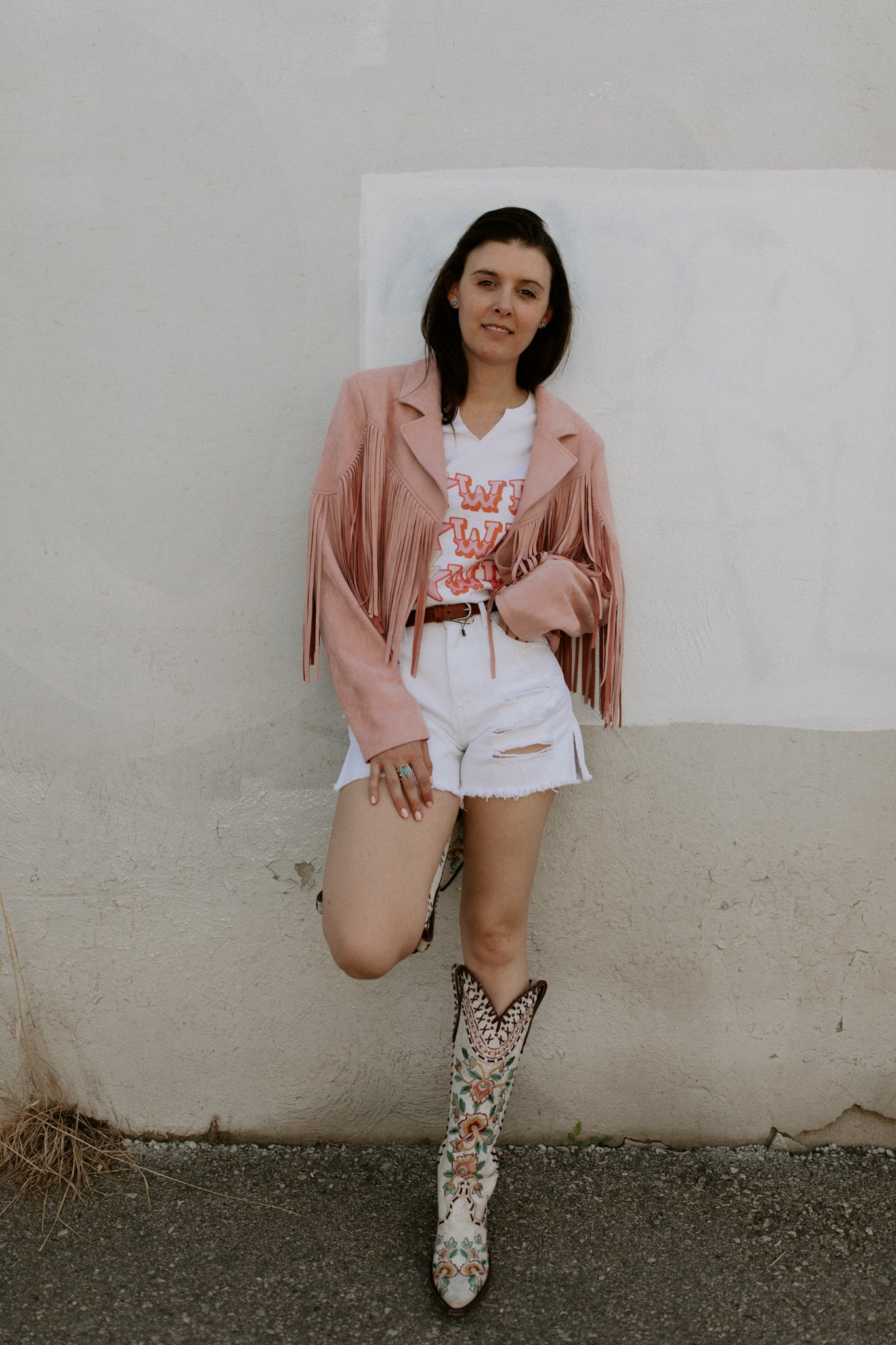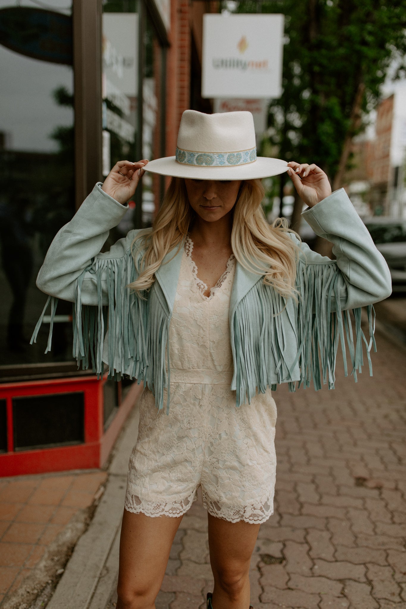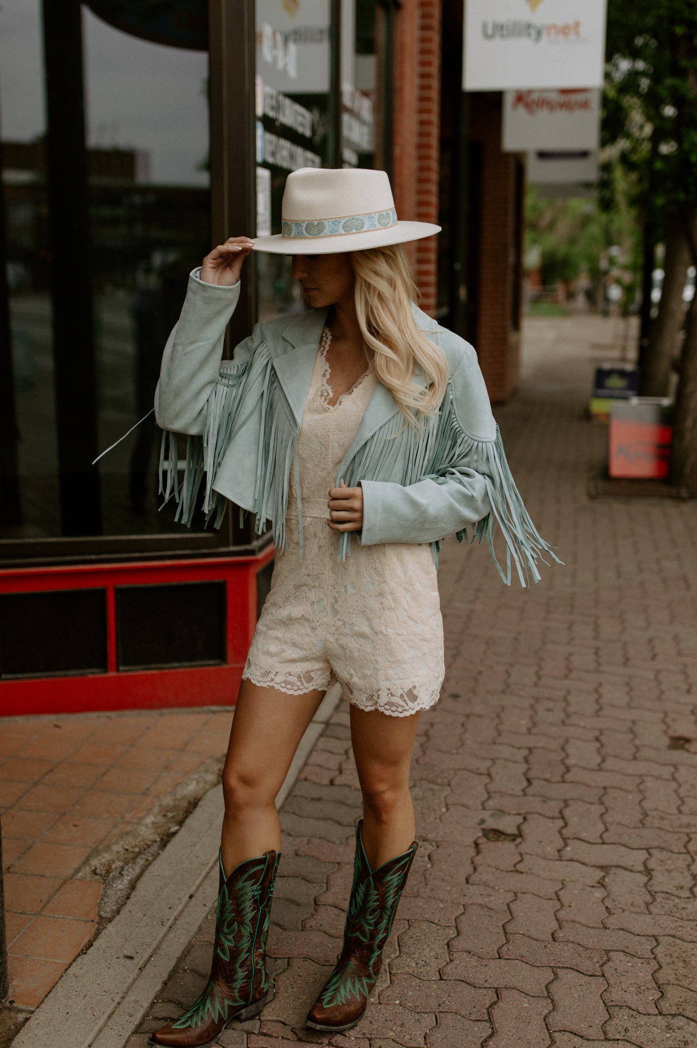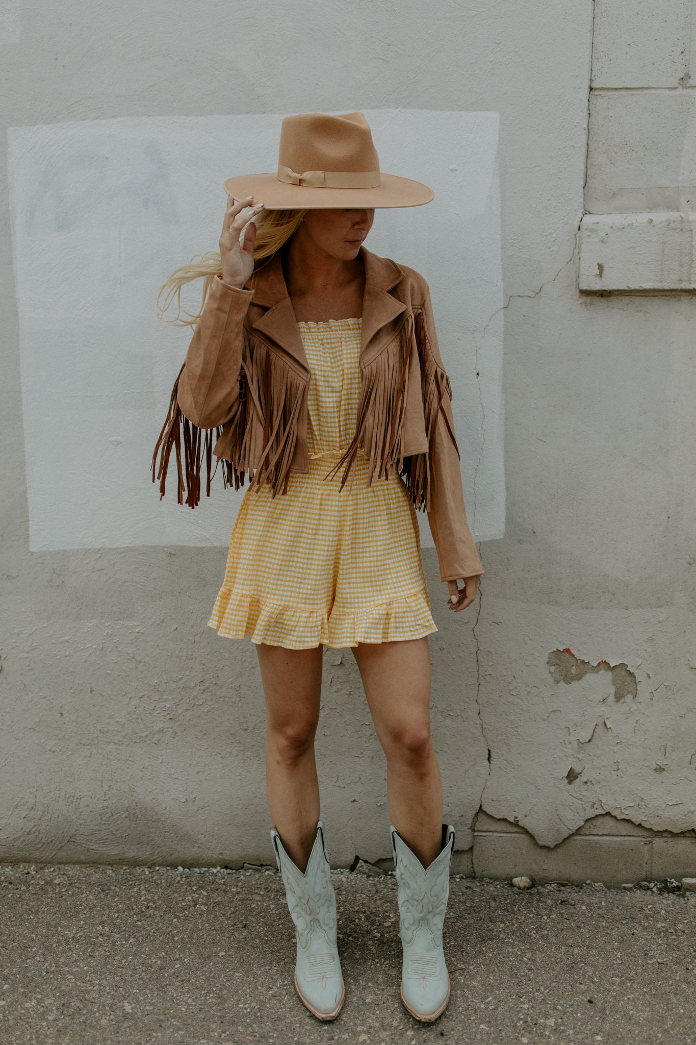 Let's go girls! The jacket everyone wants - for good reason. This faux suede jacket is slightly cropped and is adorned with fringe across the back and along the shoulders. A modern take on a western jacket!