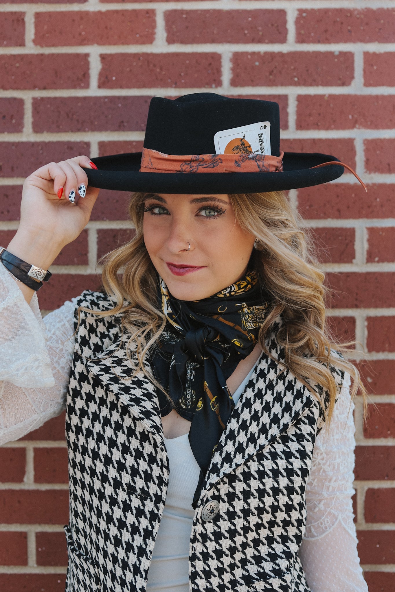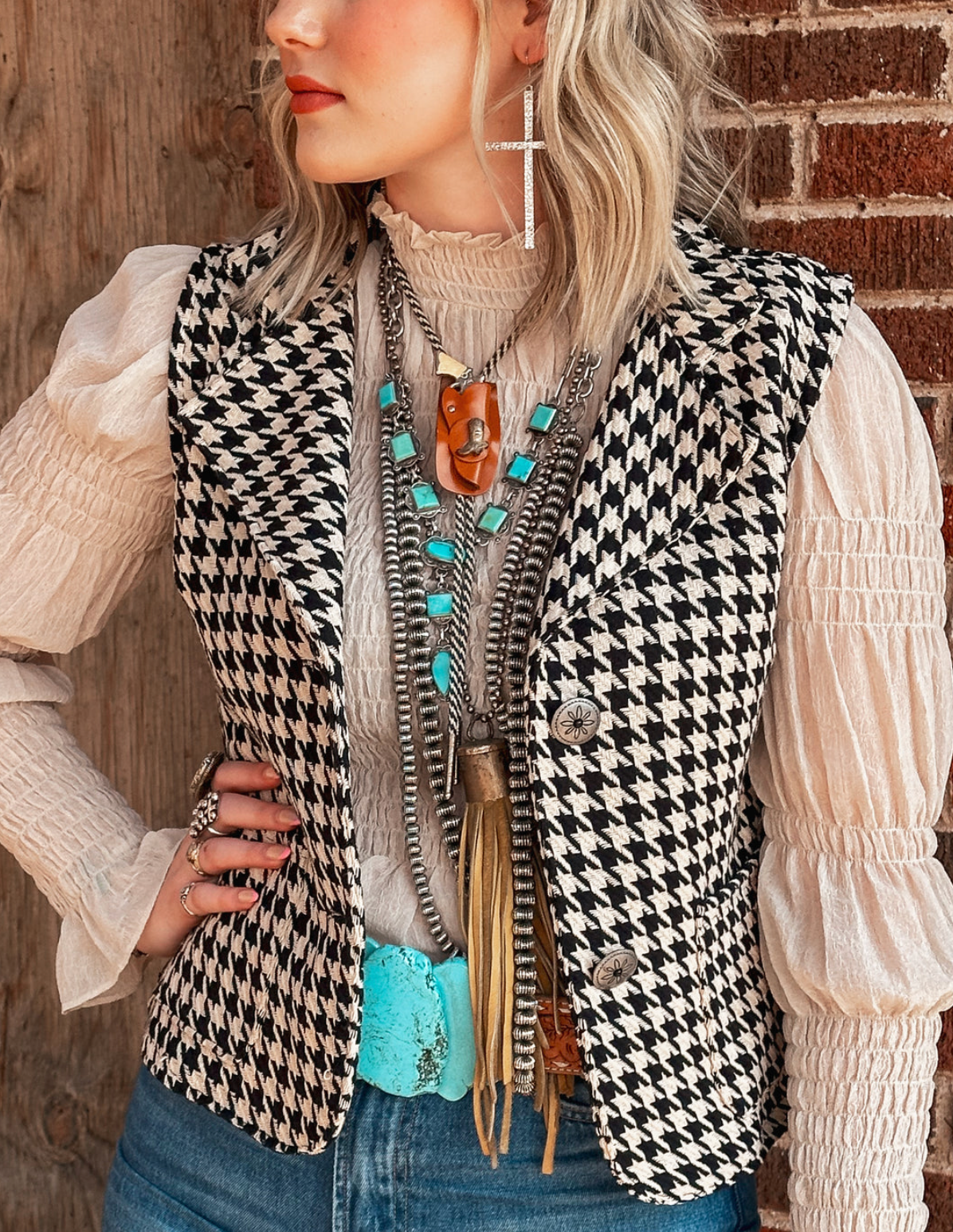 Stand out with this versatile and trendy vest. Embrace your inner cowgirl with the Shelby Vest. This houndstooth vest combines festival style with a modern western flair, making it the perfect addition to your summer and autumn wardrobe. Small label made.