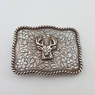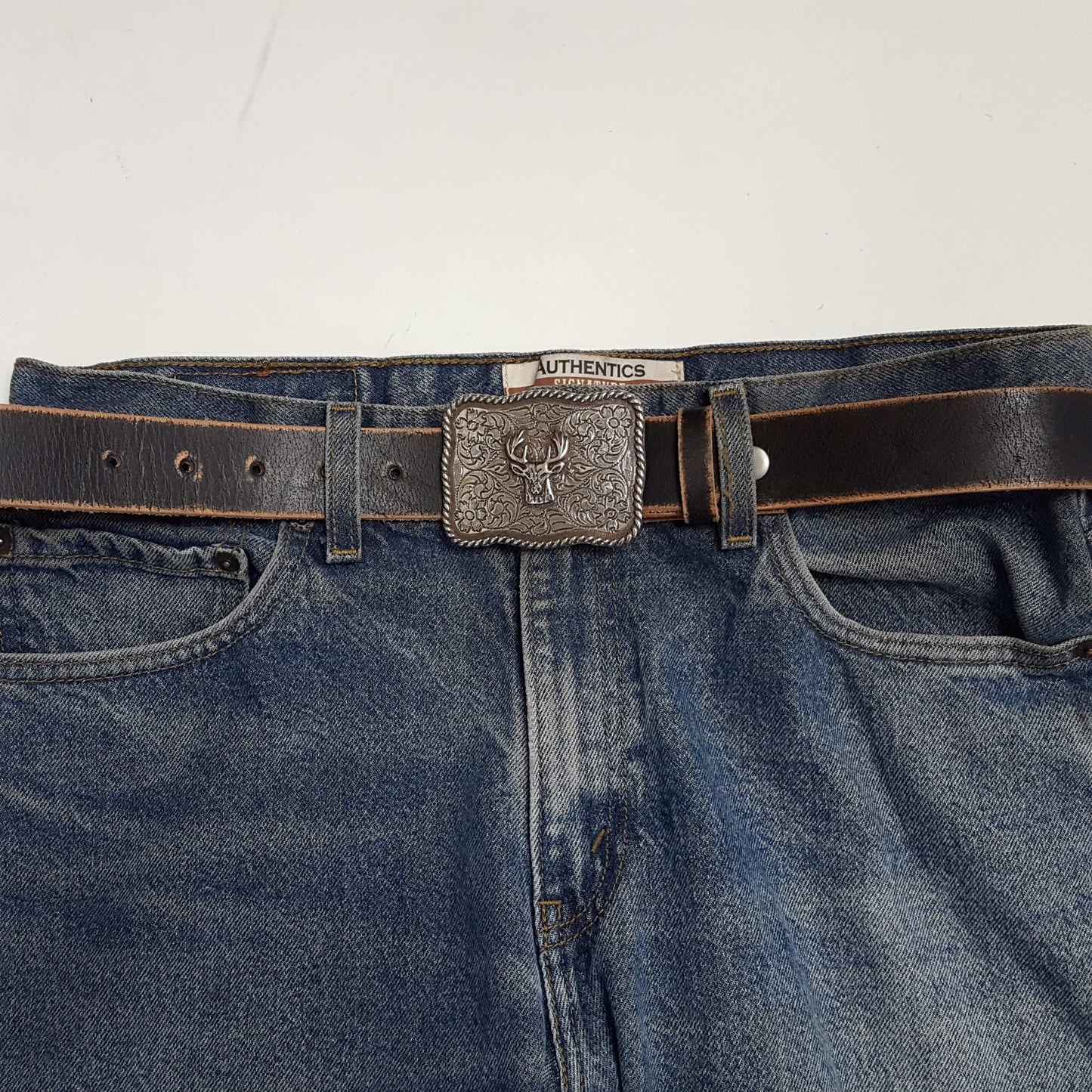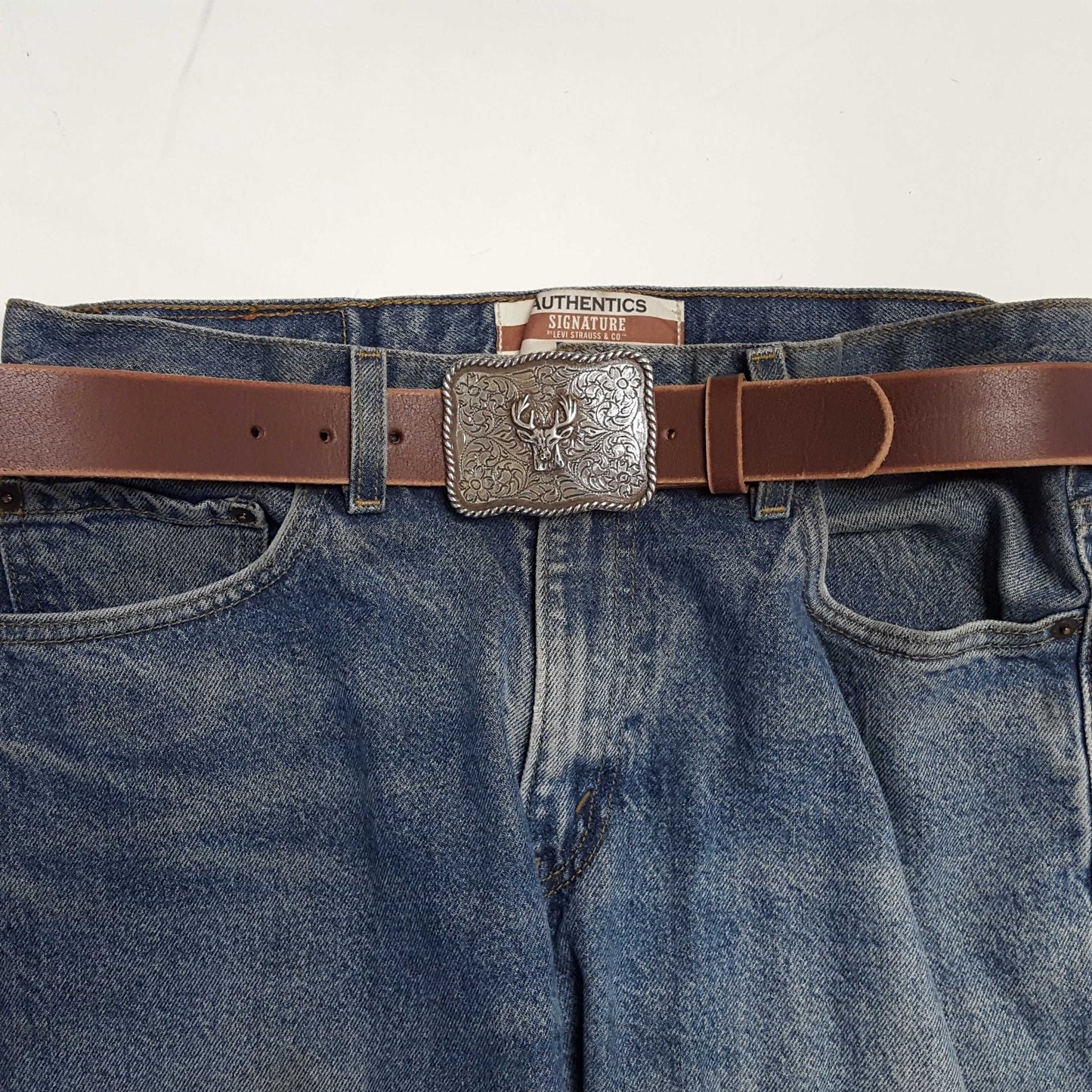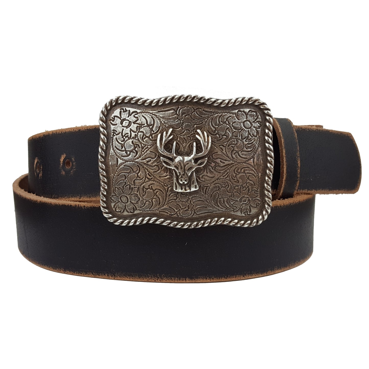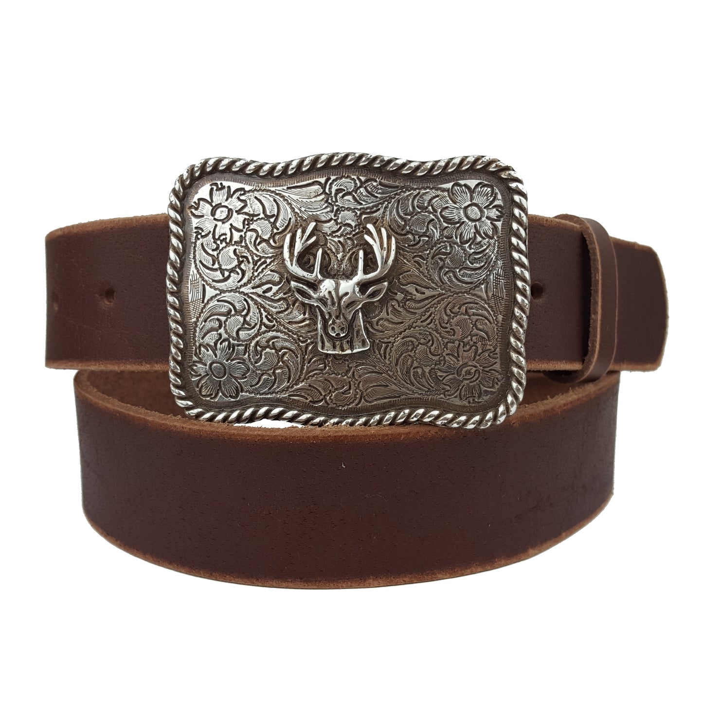 This great vintage field and stream inspired belt features a silver deer head buckle with gold detail and set on a tooled western leather belt. Dress it up for a special occasion, but also one of our go-to accessories for jeans and t-shirt.
