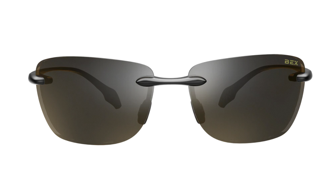- Black/Brown (S38BBS) - Frameless glossy-black thermoplastic sunglass with soft brown nose pads.