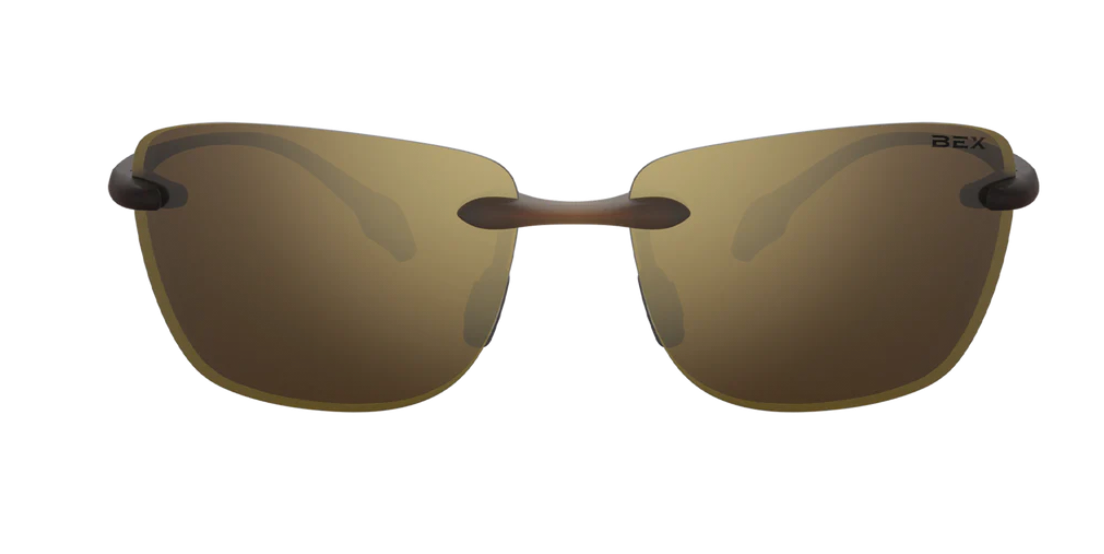 - Tortoise Brown/Gold (S38TBG) - Frameless matte tortoise-brown thermoplastic sunglass with soft brown nose pads.