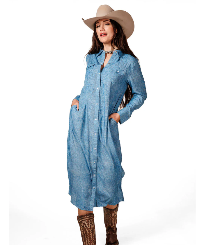 Boots may do the walking, but this dress does the talking. A Western fashionista’s dream, adorned with beautiful pearl snap buttons all down the front, with side slits and - of course - pockets. A timeless design that makes a bold statement in both comfort and style.