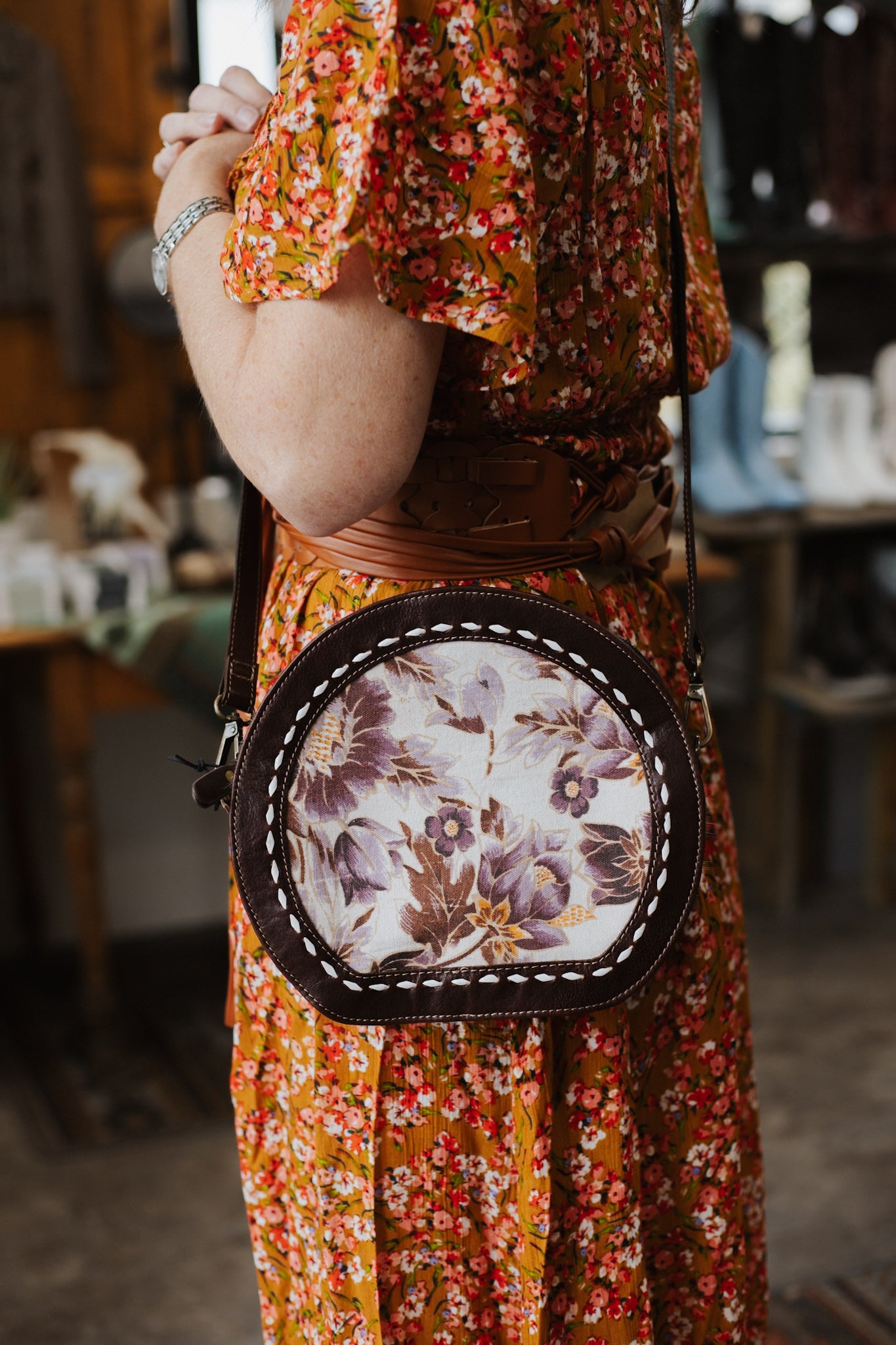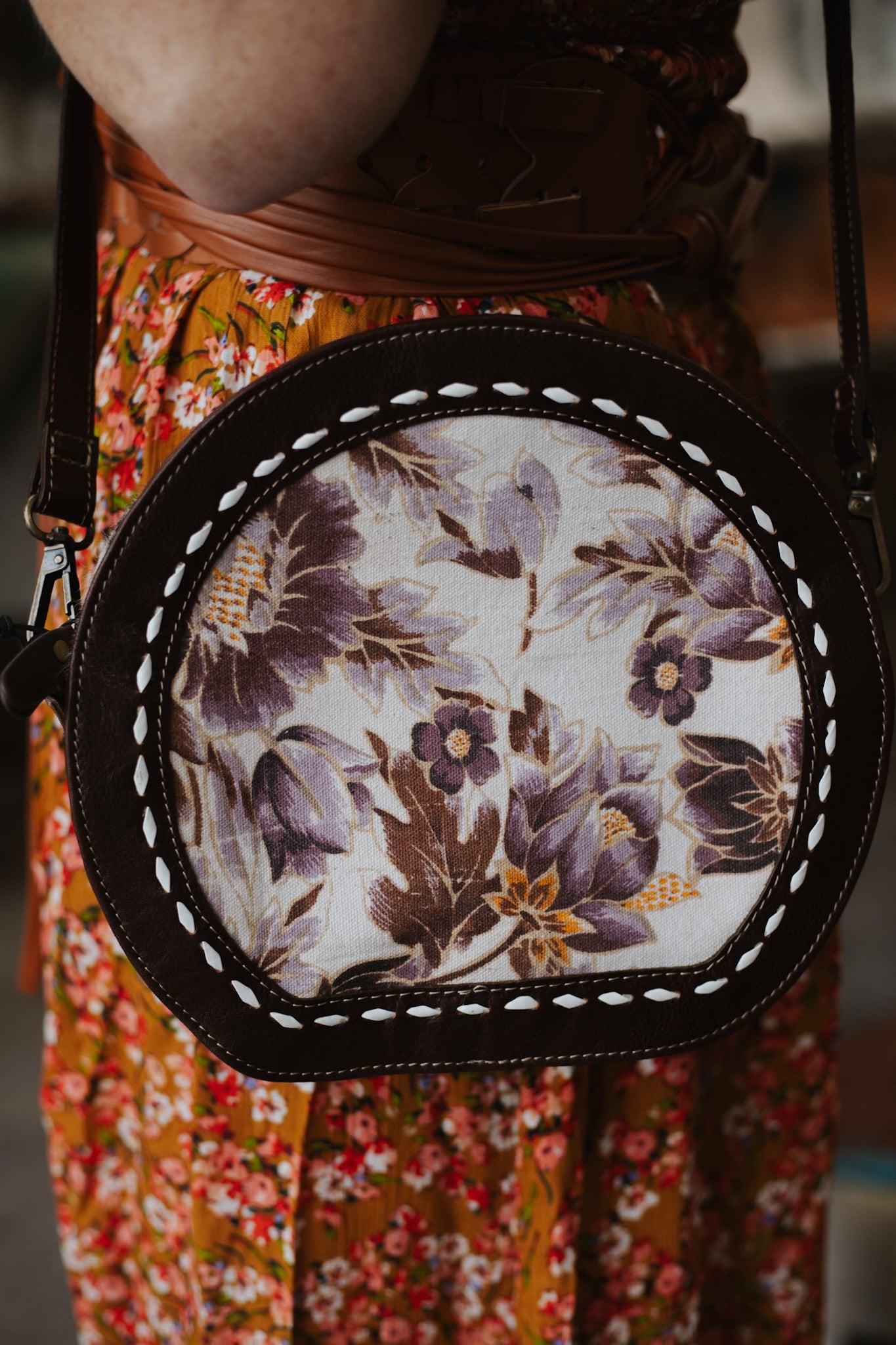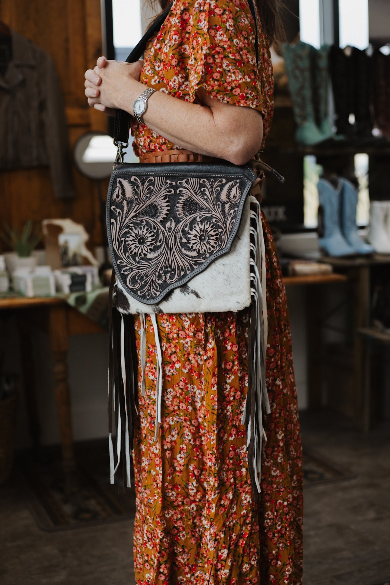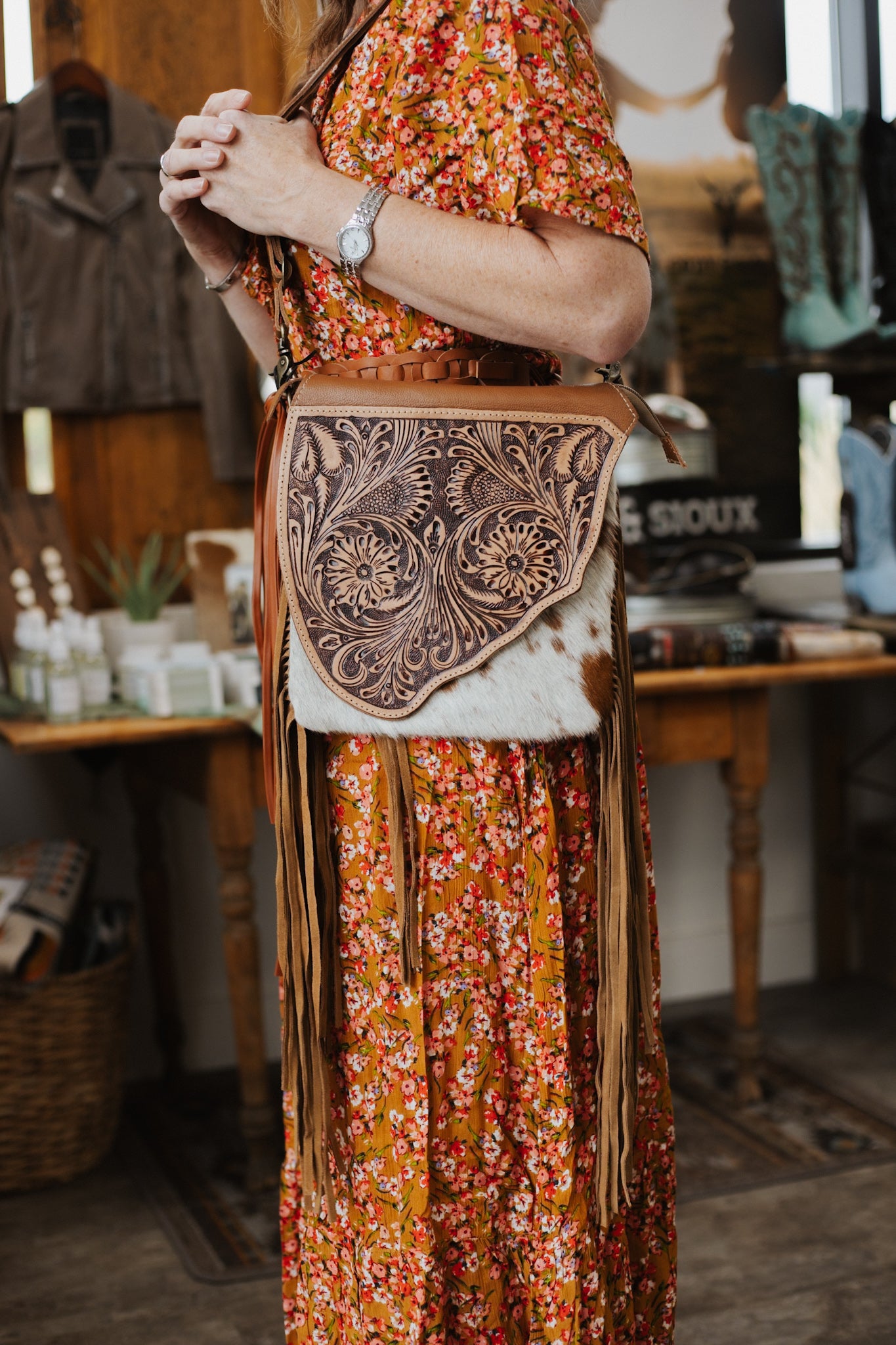 Blossom -The leather flap on this bag is carved by an intricate pattern of flowers and it has fringes on both the side.
