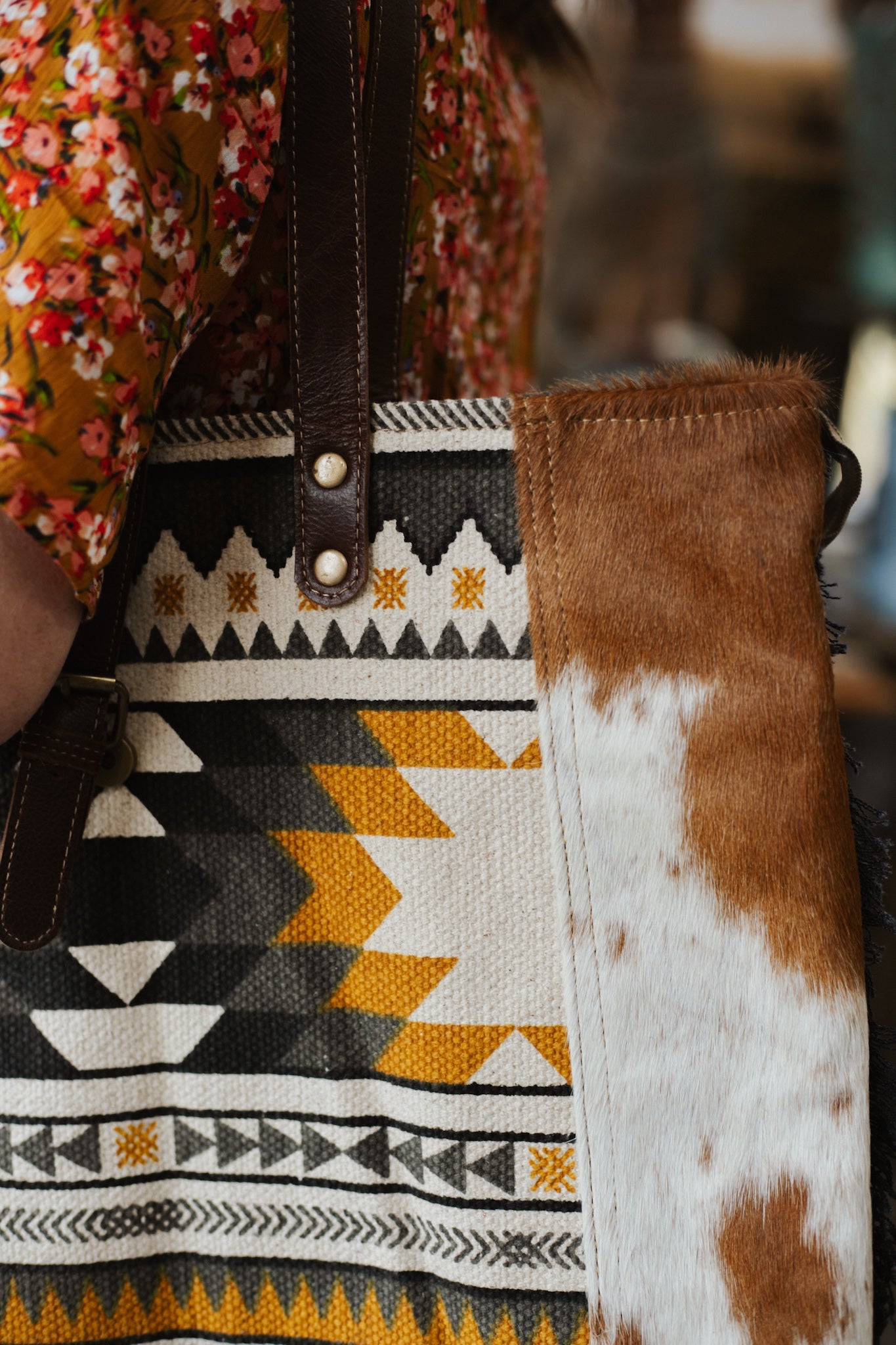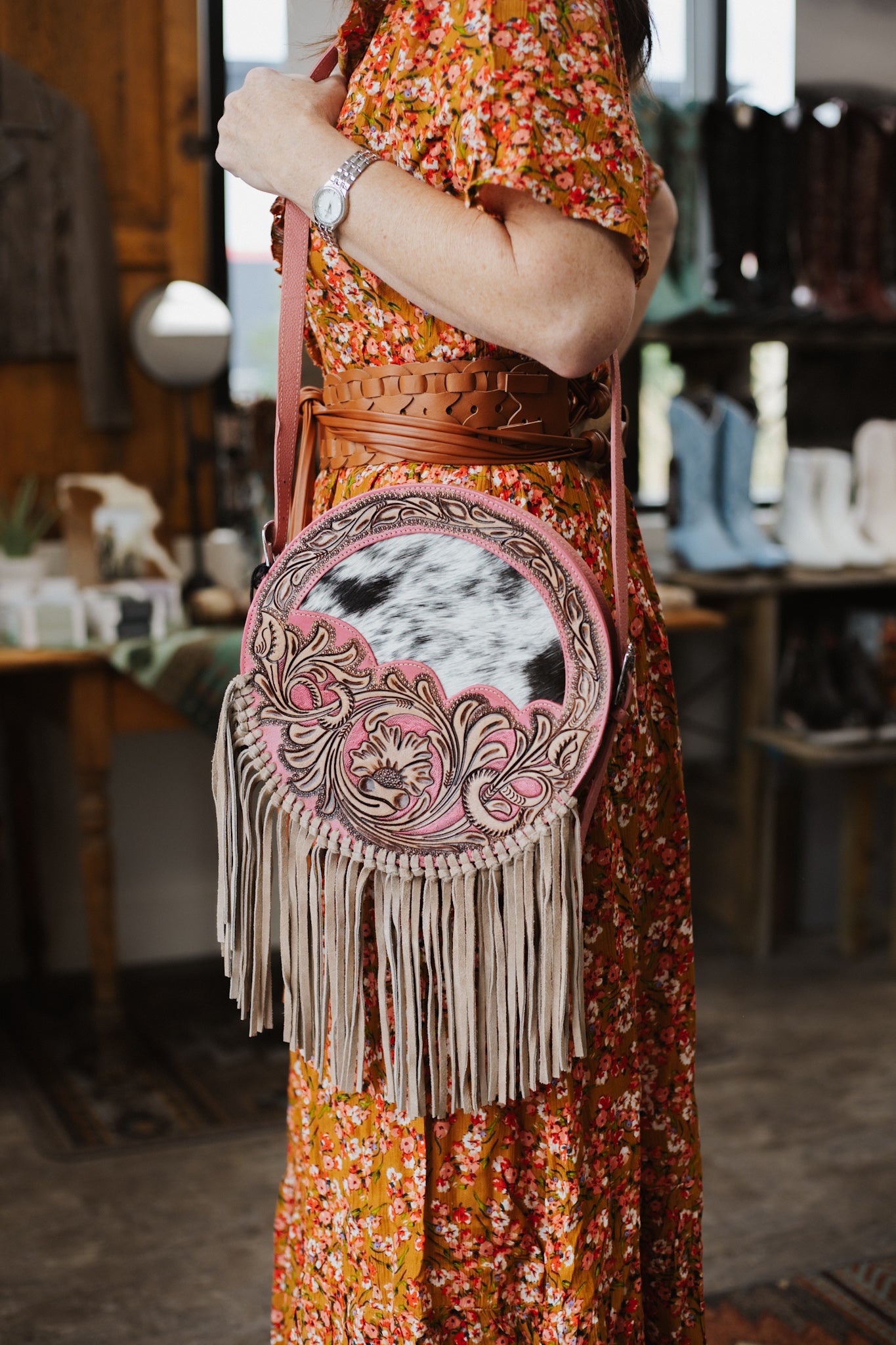 Sanora Bag - features a stunning hair-on hide and hand-tooled leather front in gorgeous hues of sunrise pink and mocha ivory. Bottom fringe in mocha ivory suede leather adds the finishing touch. The interior features a zipper-close top. The sides and reverse are beautiful pink sunrise leather, complete with a zippered pocket on the back. The detachable, adjustable shoulder strap is in matching leather - Width 10.5" x Height 10.5"
