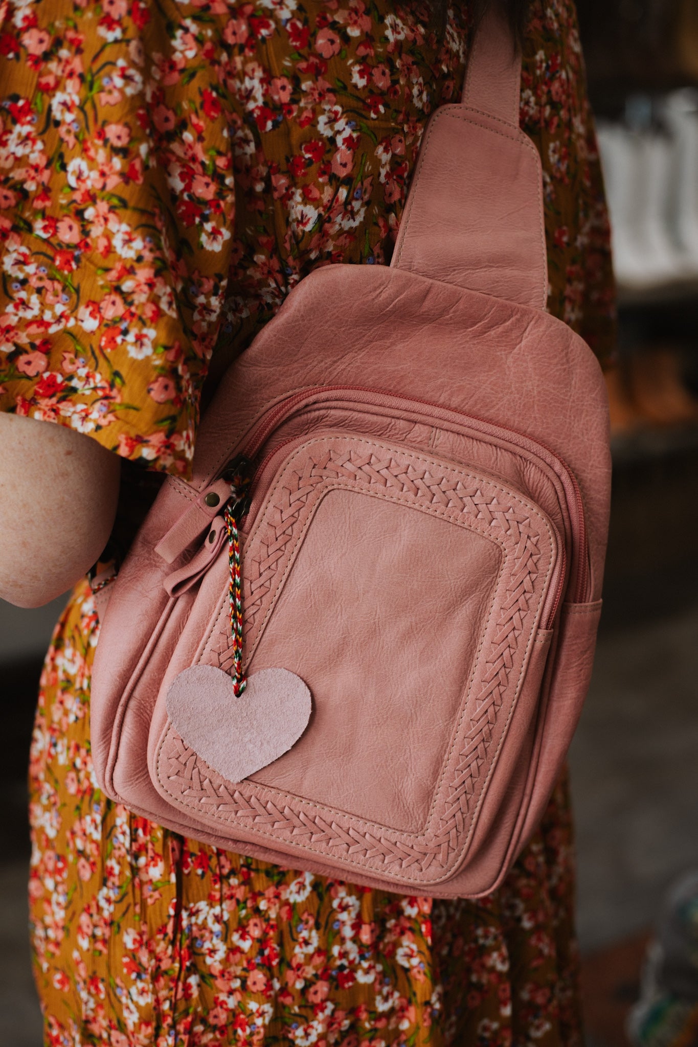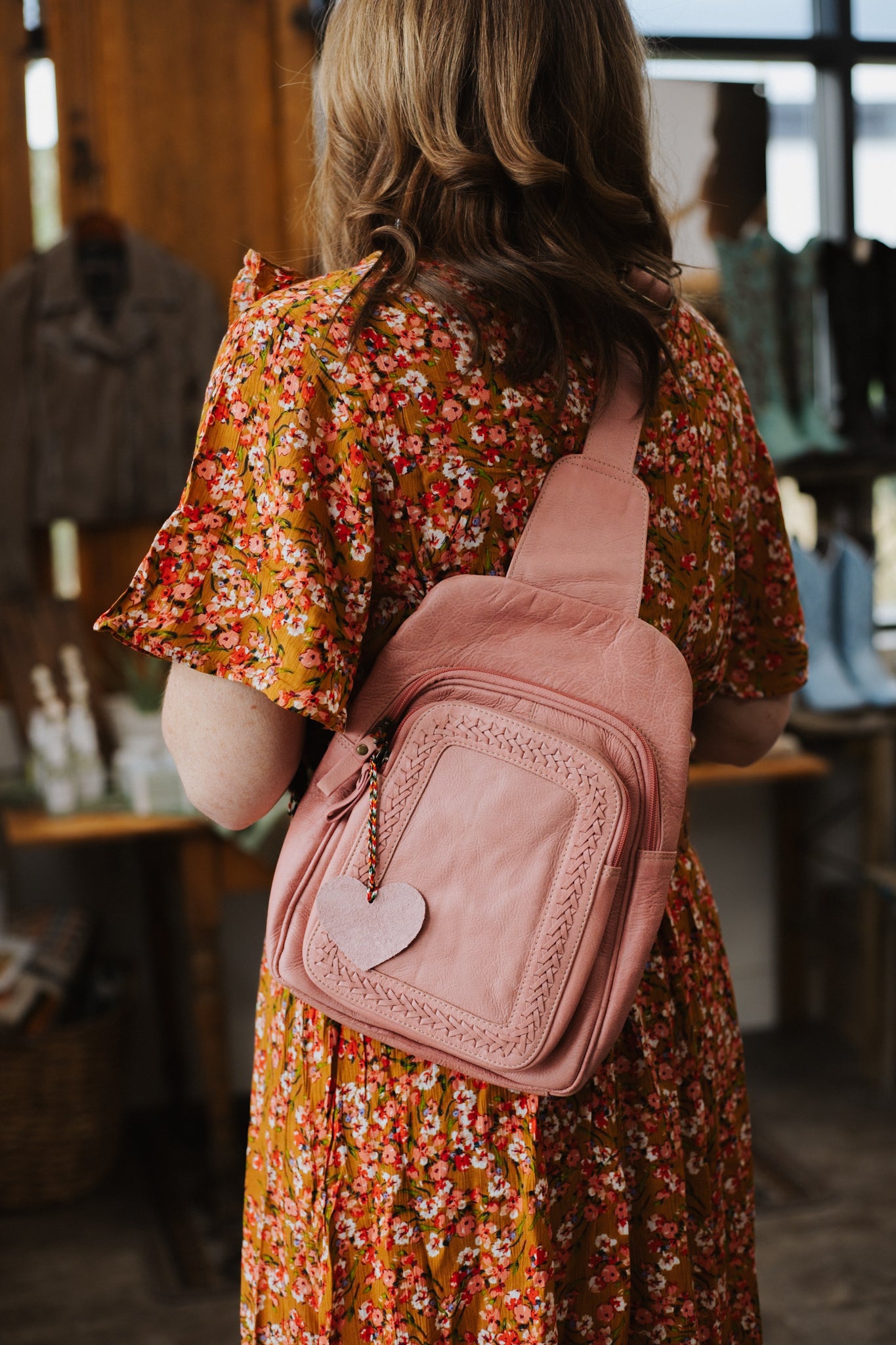Willow Canyon - featuring beautiful rose pink leather, lovingly stitched to perfection. Numerous zippered compartments add convenience to keep your essentials handy and organized. Wear it on your side, back or front, just as you need. Comfortable, adjustable shoulder strap is matching leather. - Width 9.5" x Height 11.5"