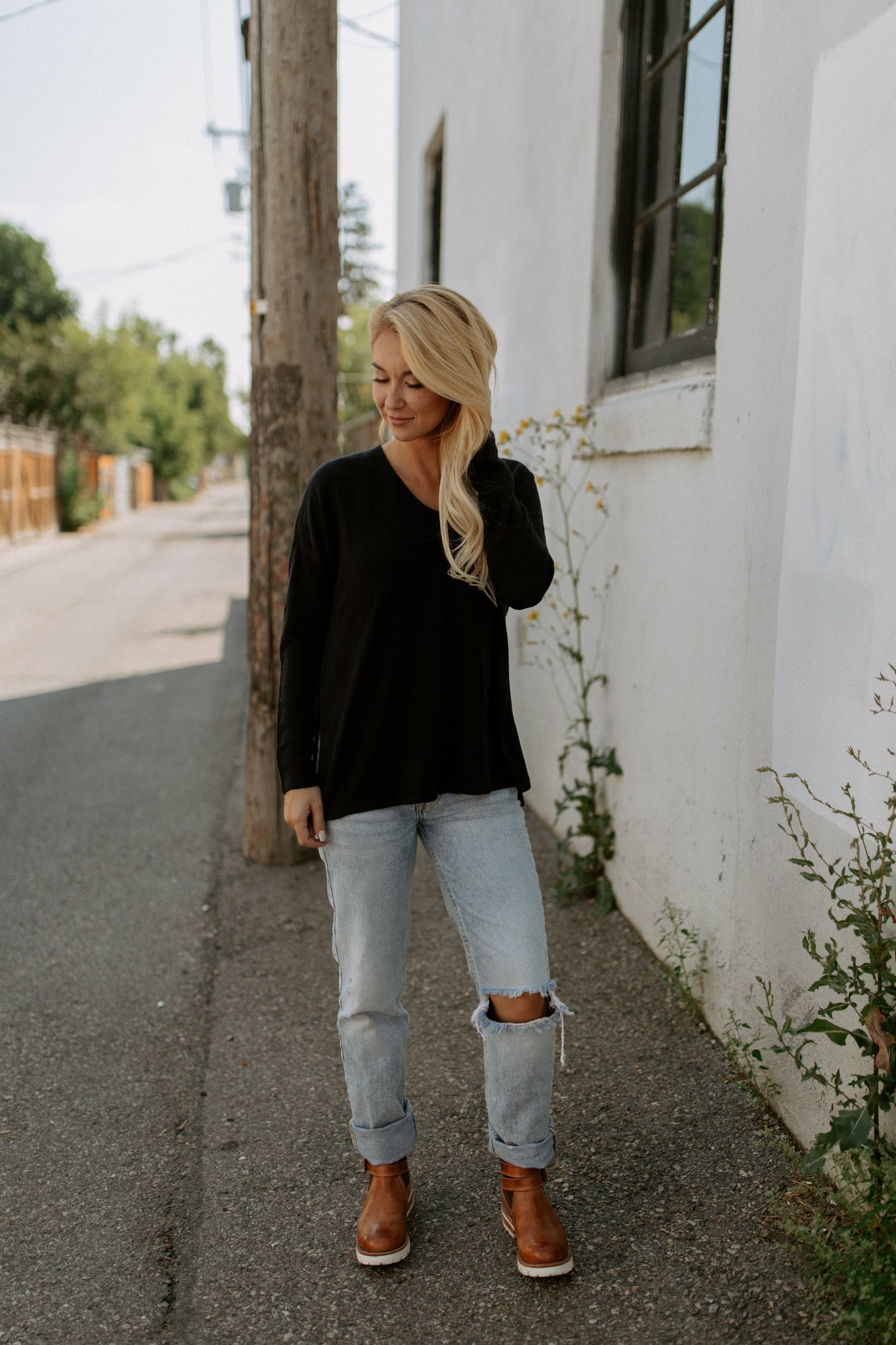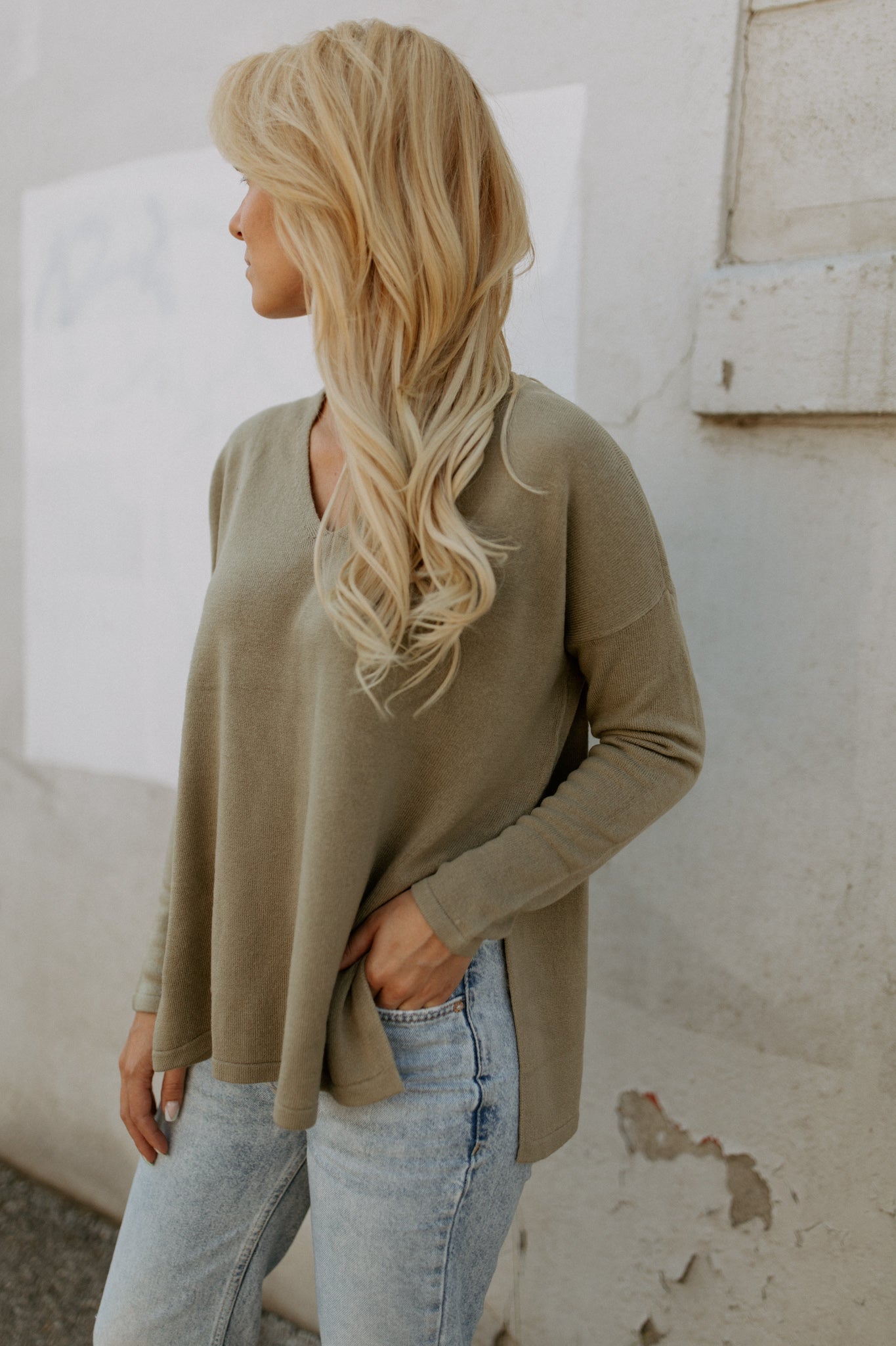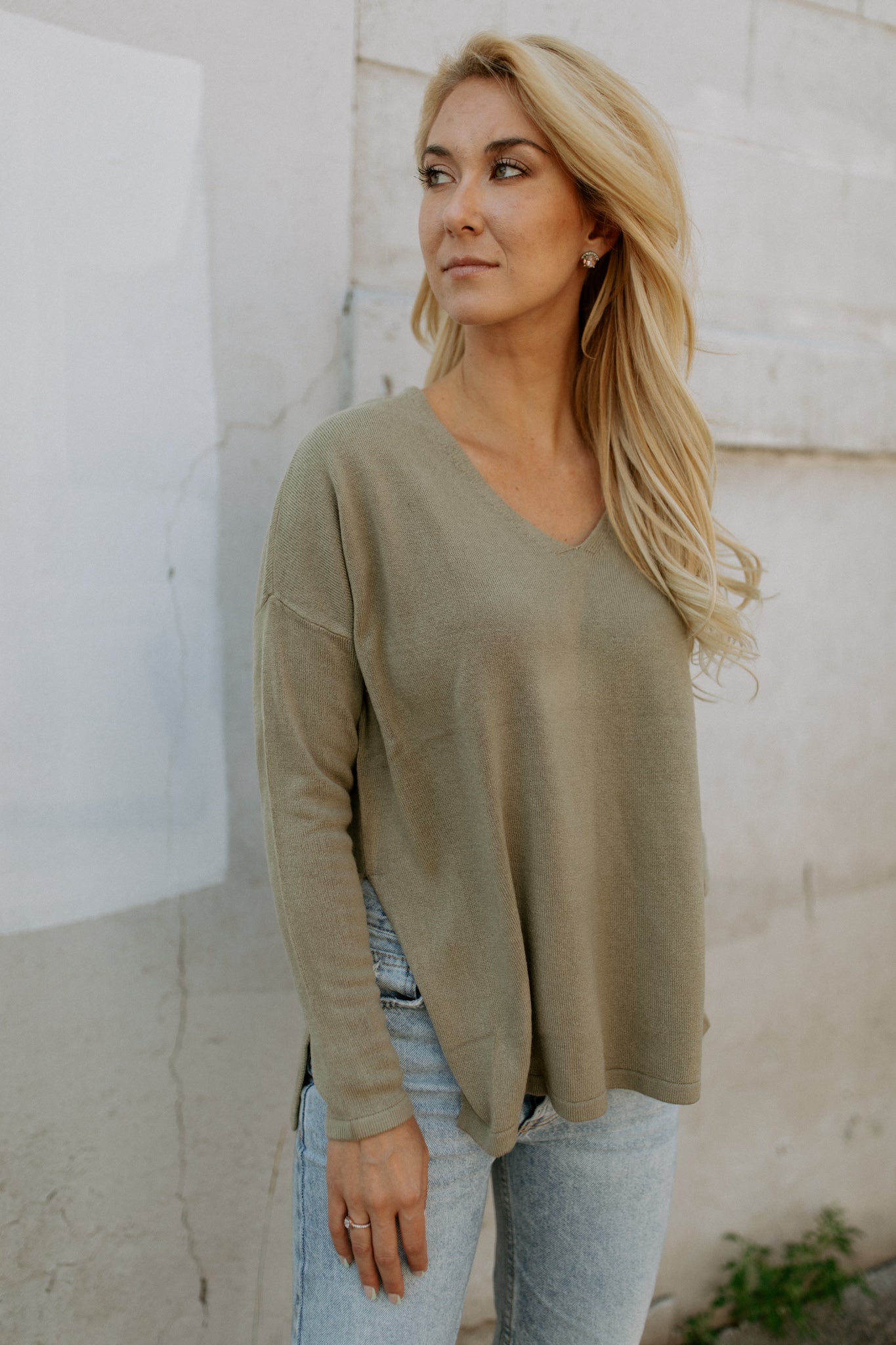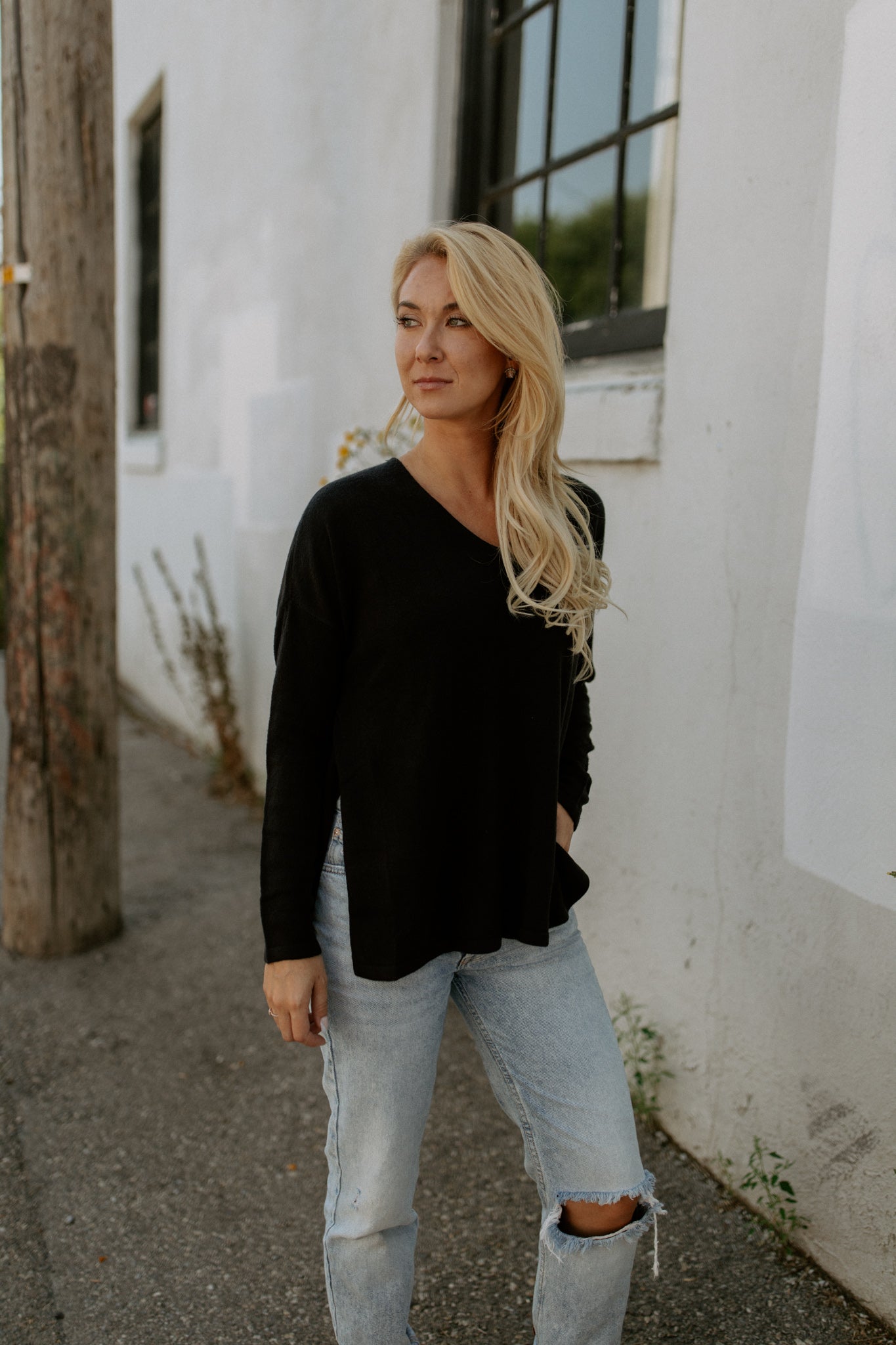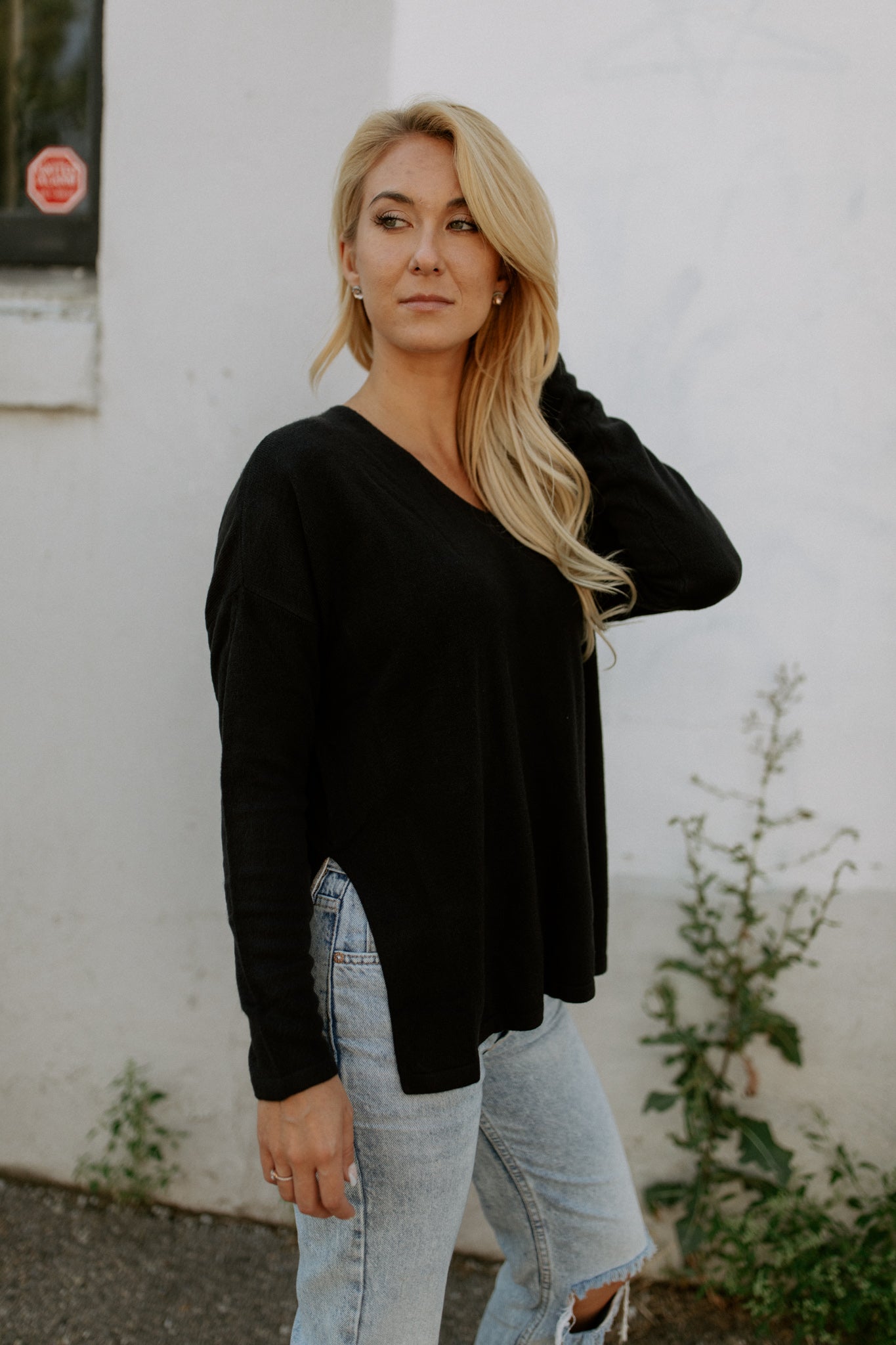 There are so many reasons to love this basic long sleeve! It's incredibly soft fabrication will keep you cozy, while the side slits and v-neckline will keep you stylish. Trust us when we say you'll be wearing this one all fall/winter long.