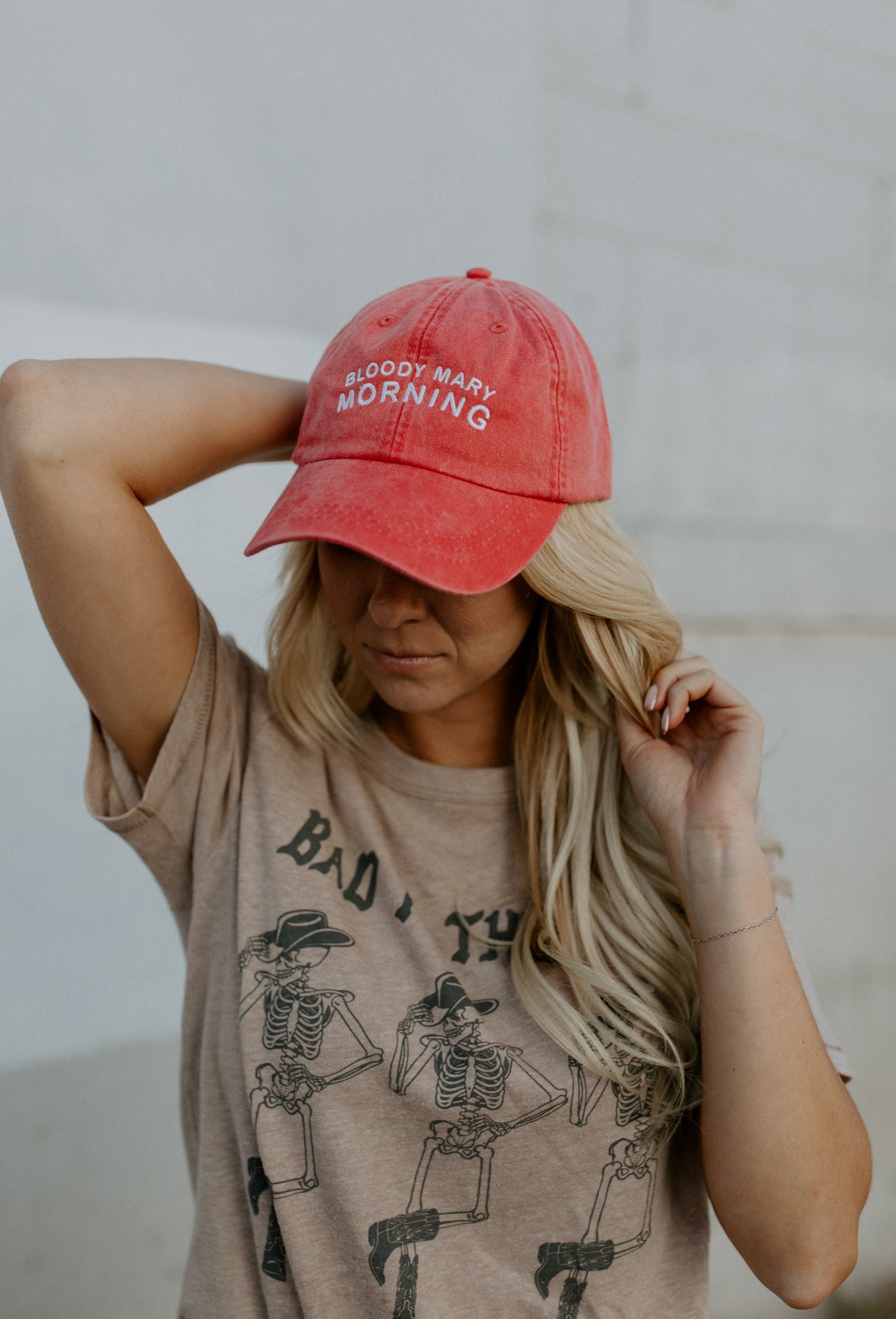 We all know the best start to a game day is grabbing a drink at brunch with your squad before the game starts! This hat is featured on a washed out red hat with Bloody Mary Morning in white stitching.