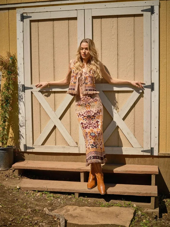 BLUE B Ethnic Pattern Fringe Hem Knit Top