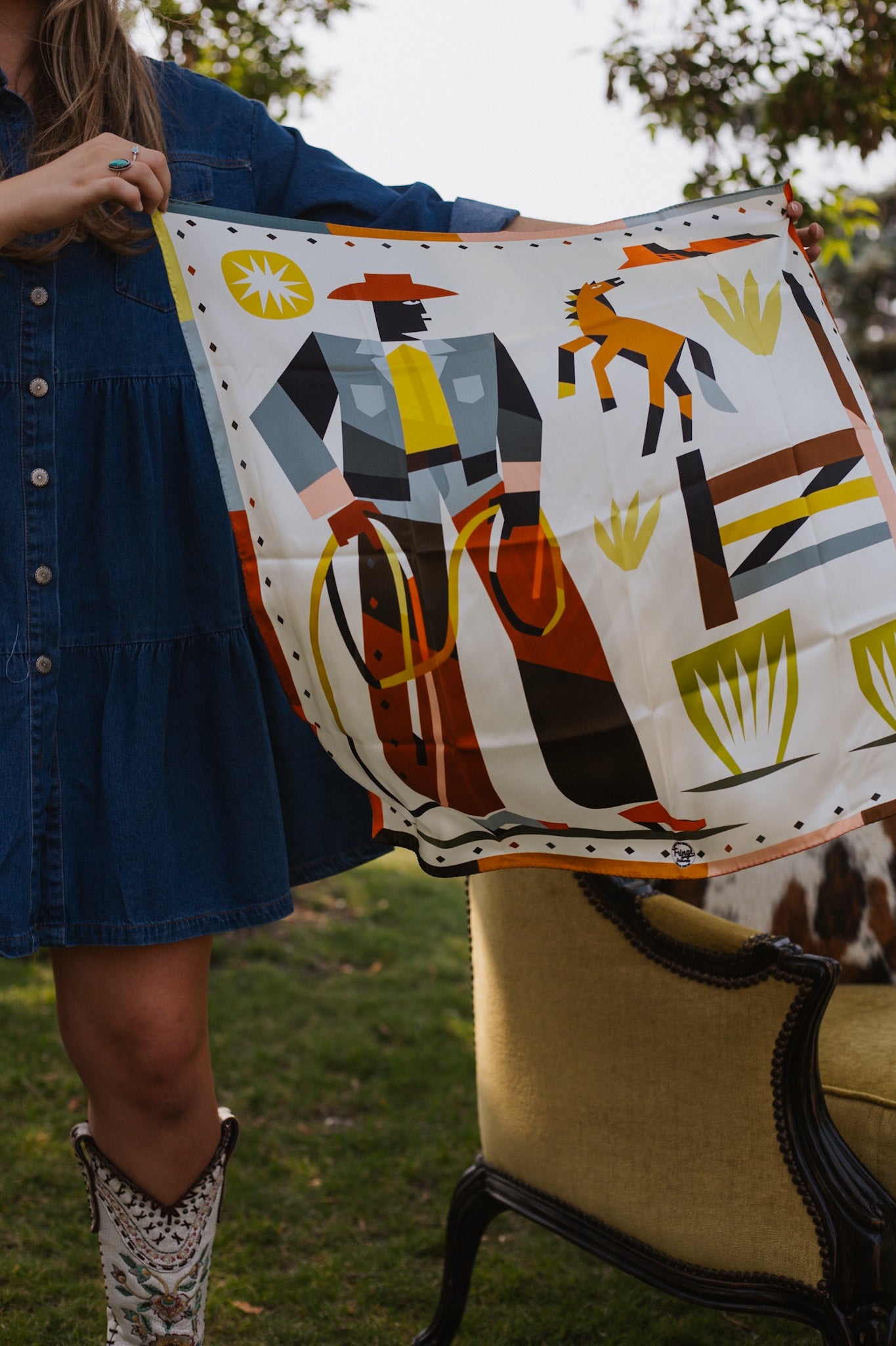 Jon's unique style and bold colors create one-of-a-kind pieces that are a must have for your scarf collection. Shown here, Bronco Buster