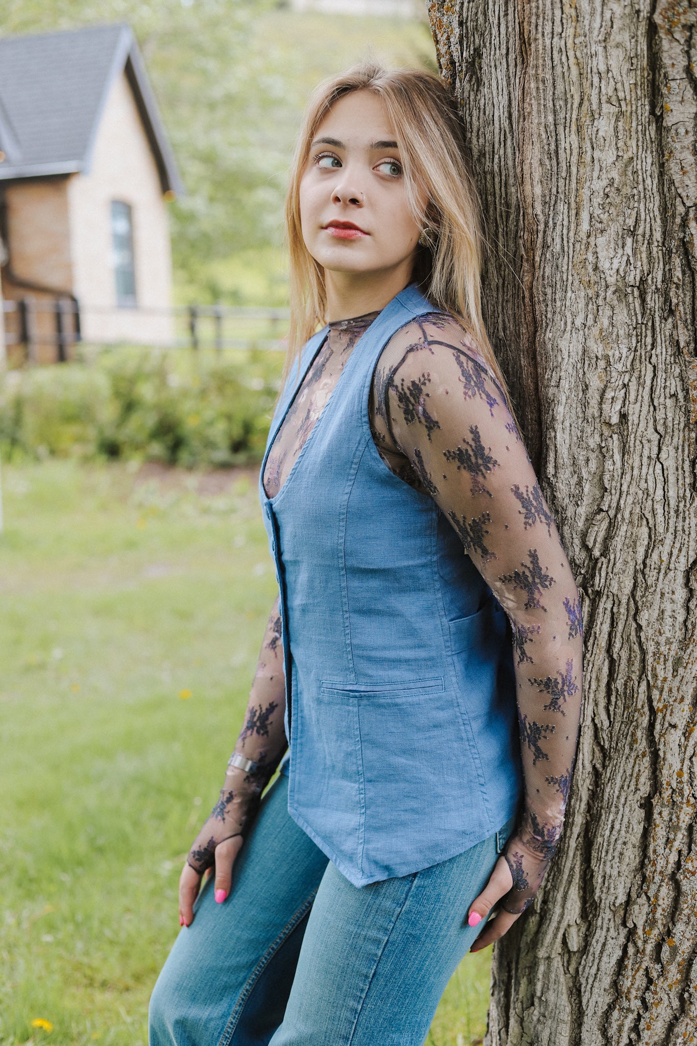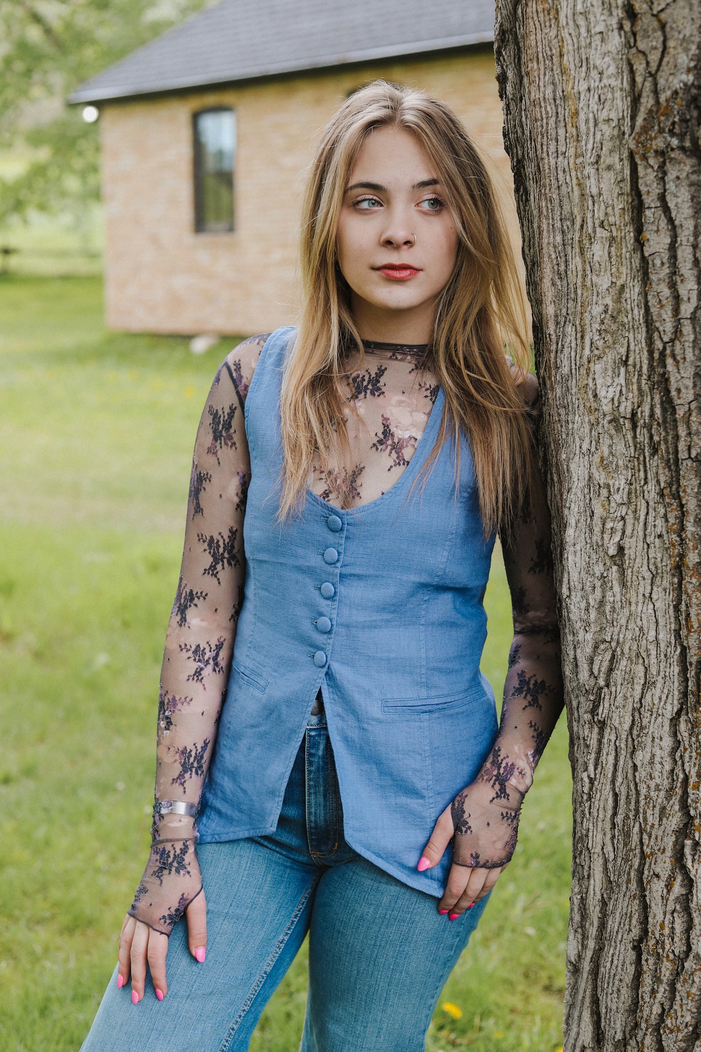 Features: Soft linen-blend, low scoop neckline, button-front closures, welt-pocket detailing, sleeveless design