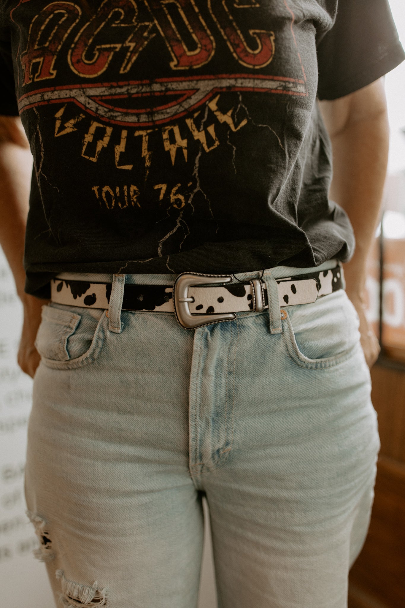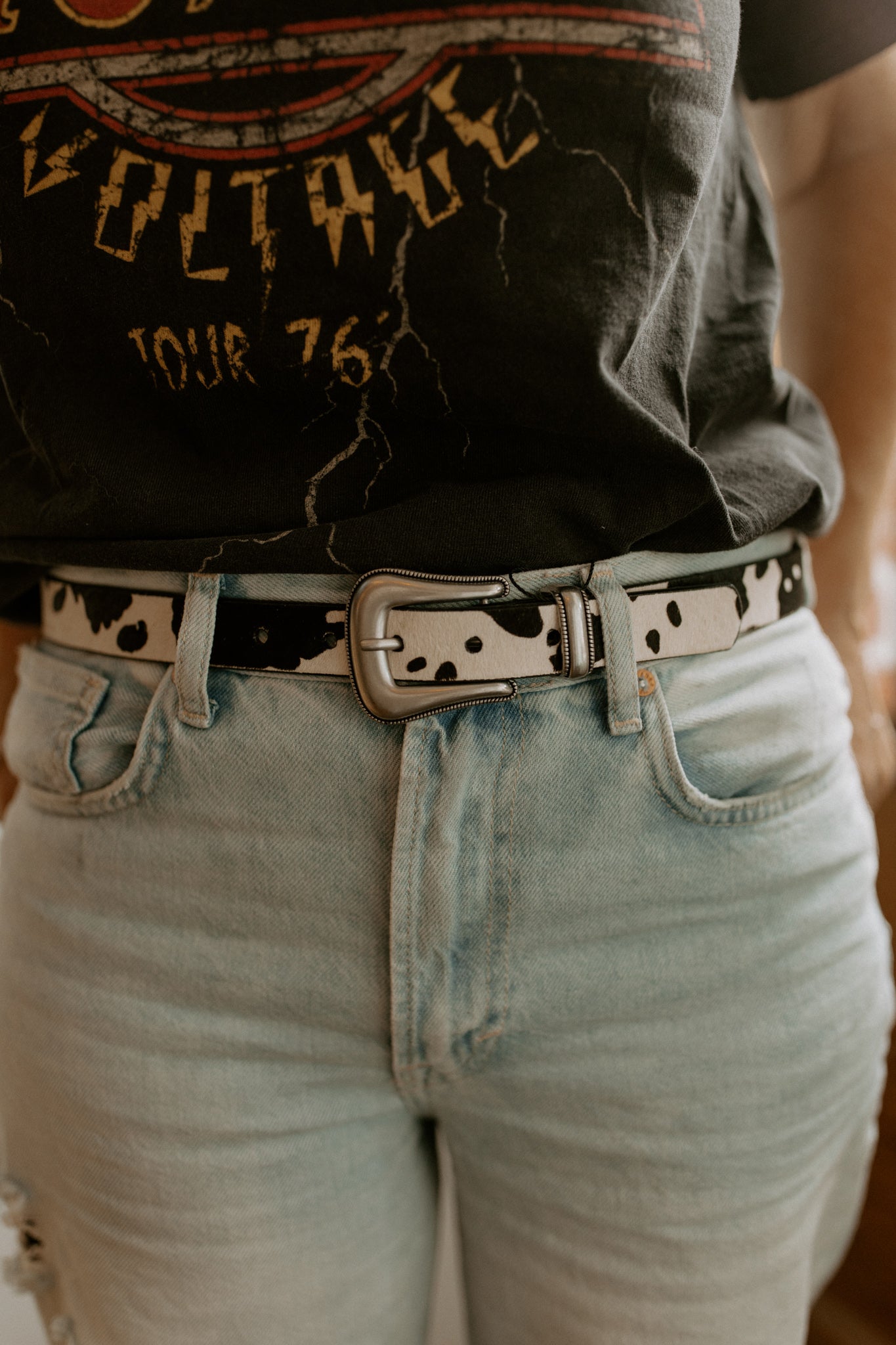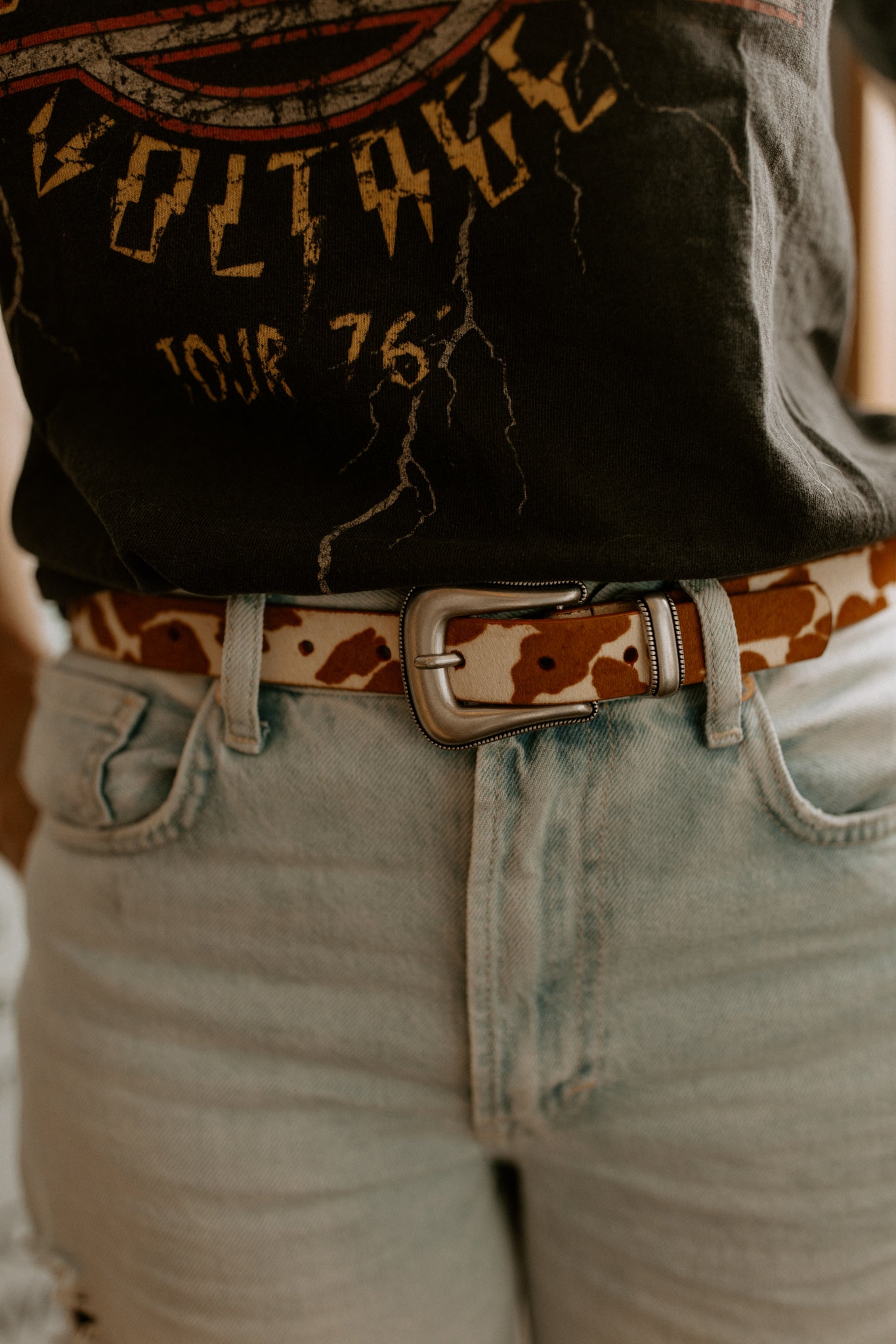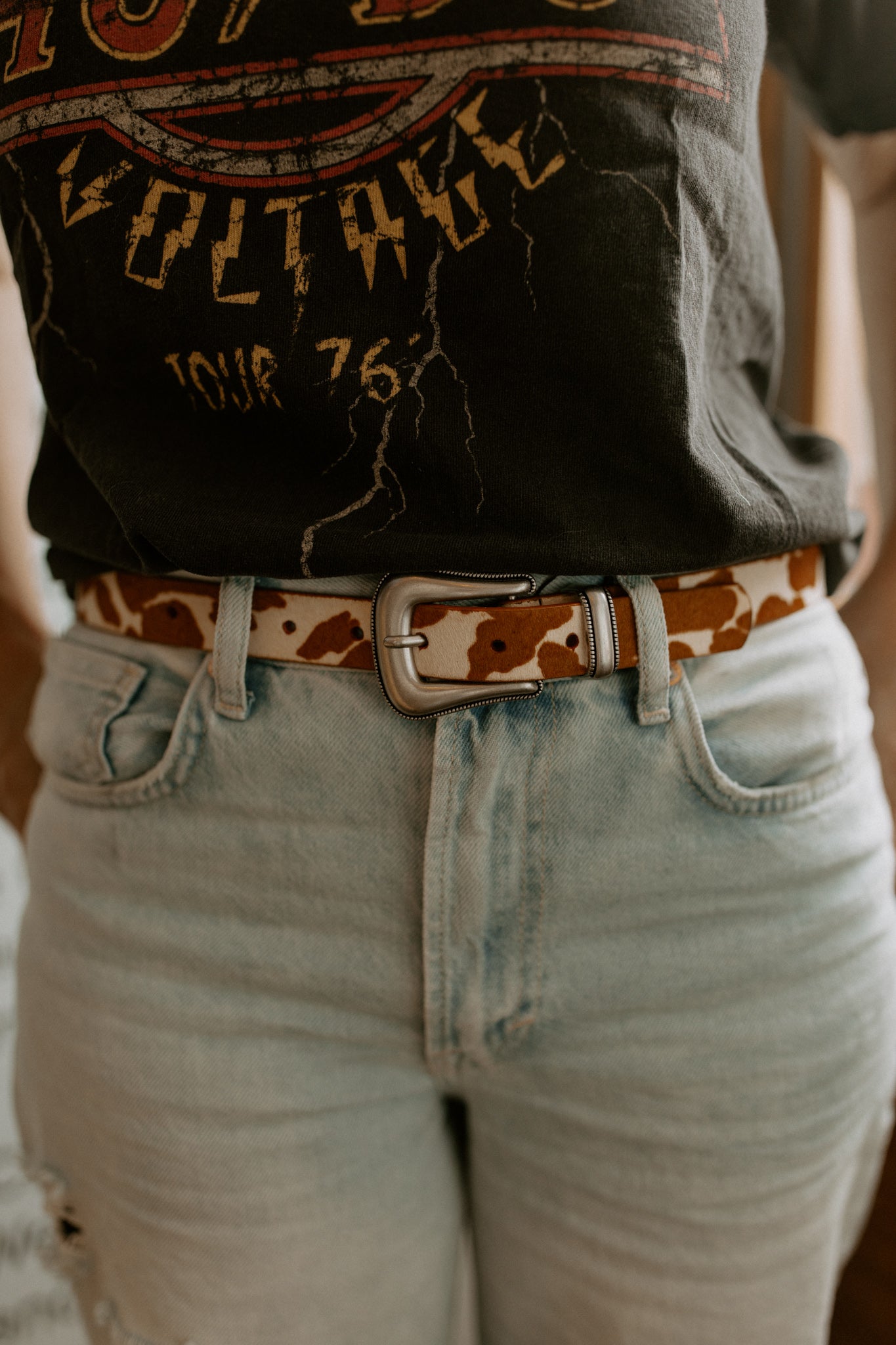 Get your western on with this trendy cow-print belt! This skinny, cow-hide belt is finished off beautifully with a silver western belt buckle.