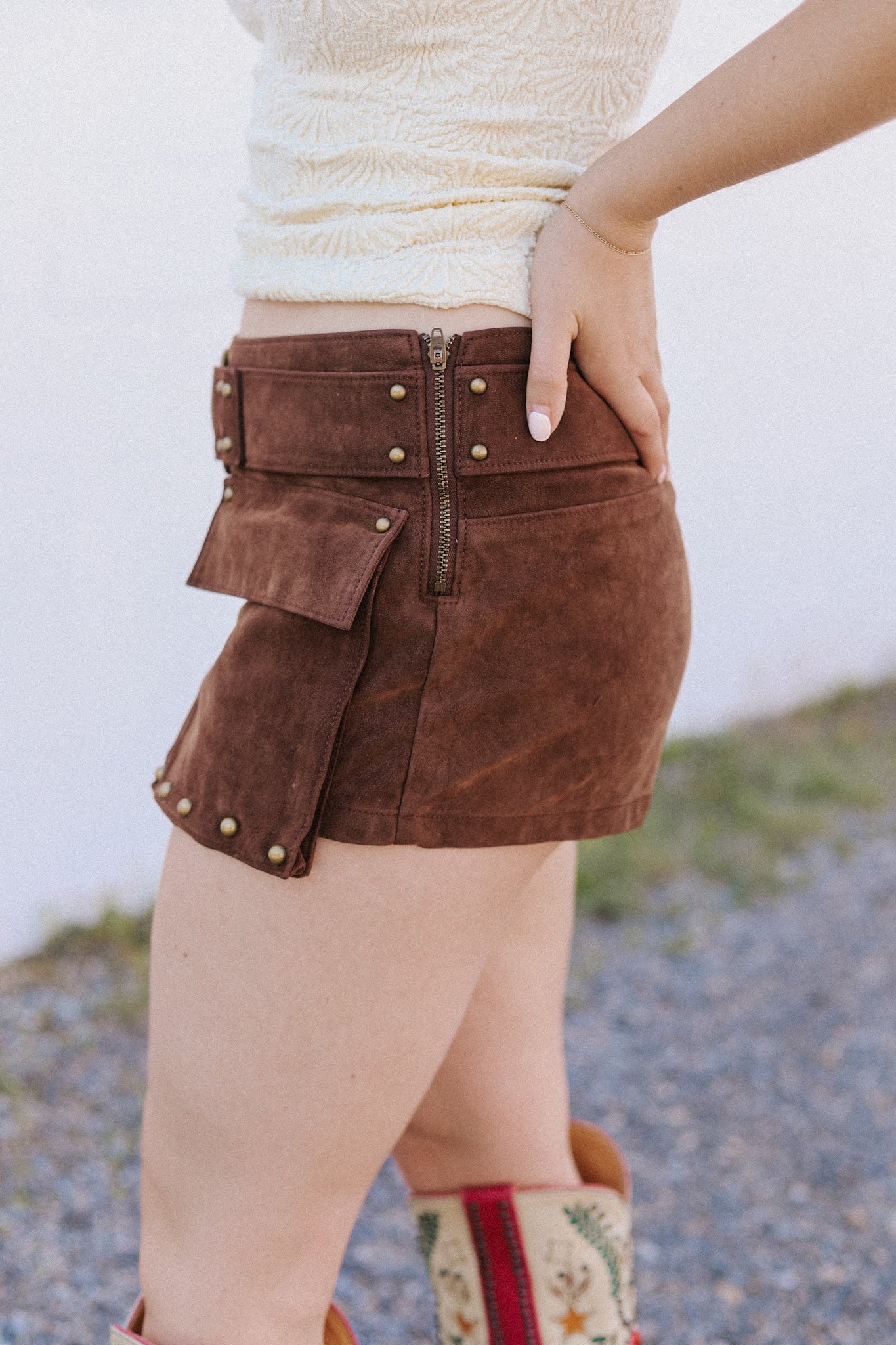 Features:Â Sleek vegan suede fabrication, oversized flap pockets at the side, studded hardware embellishments, belted waistband feature